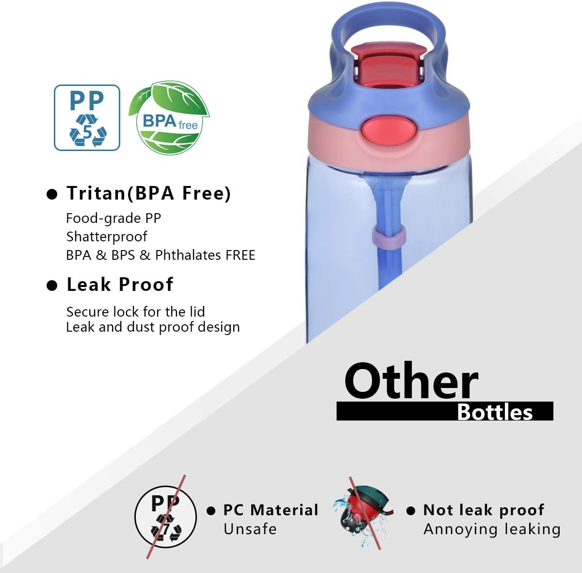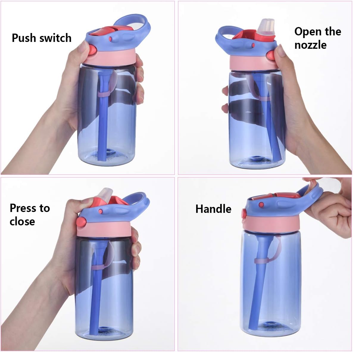 🧡【UN CLIC APERTO】: Il suo ugello in silicone morbido e flessibile è approvato dal dentista che è delicato sulle gengive. Basta un clic per aprire questa fontanella portatile e iniziare a bere! I pulsanti sul coperchio superiore pop-up bloccabile sono abbastanza stretti da evitare perdite. La copertura ergonomica a fogli mobili è sicura e resistente a perdite, perdite e polvere. 💛【STRUTTURA SEMPLICE】: Con il design semplice della struttura, la bottiglia è facile da usare per i bambini e facile da pulire per i genitori. Il design della maniglia piccola è comodo da trasportare per i tuoi bambini. È la bottiglia d'acqua ideale per la scuola e la scuola materna. 👧【NESSUNA PIÙ PERDITA】 La bottiglia è progettata a tenuta con i due accessori in silicone trasparente all'interno del coperchio.È importante assicurarsi che questi due accessori siano installati correttamente in modo che la tazza possa essere completamente a prova di perdite anche se la tazza è capovolta o scosso vigorosamente (controlla se queste due guarnizioni in silicone sono nella giusta posizione quando trovi che le bevande fuoriescono.) 💙【SICURO E DUREVOLE】: La bottiglia d'acqua è realizzata in materiale privo di bpa con tritan trasparente leggero e robusto in co-poliestere, bottiglia d'acqua completamente sicura. (Note: impossibile mettere nel microonde.) 💜【FACILE DA PULIRE】: Tutte le parti sono lavabili in lavastoviglie e non si deformano in lavastoviglie. Rimuovere la parte inferiore del coperchio e tenerlo aperto durante il lavaggio. Sentiti libero di farci sapere se hai qualche domanda con il nostro prodotto.