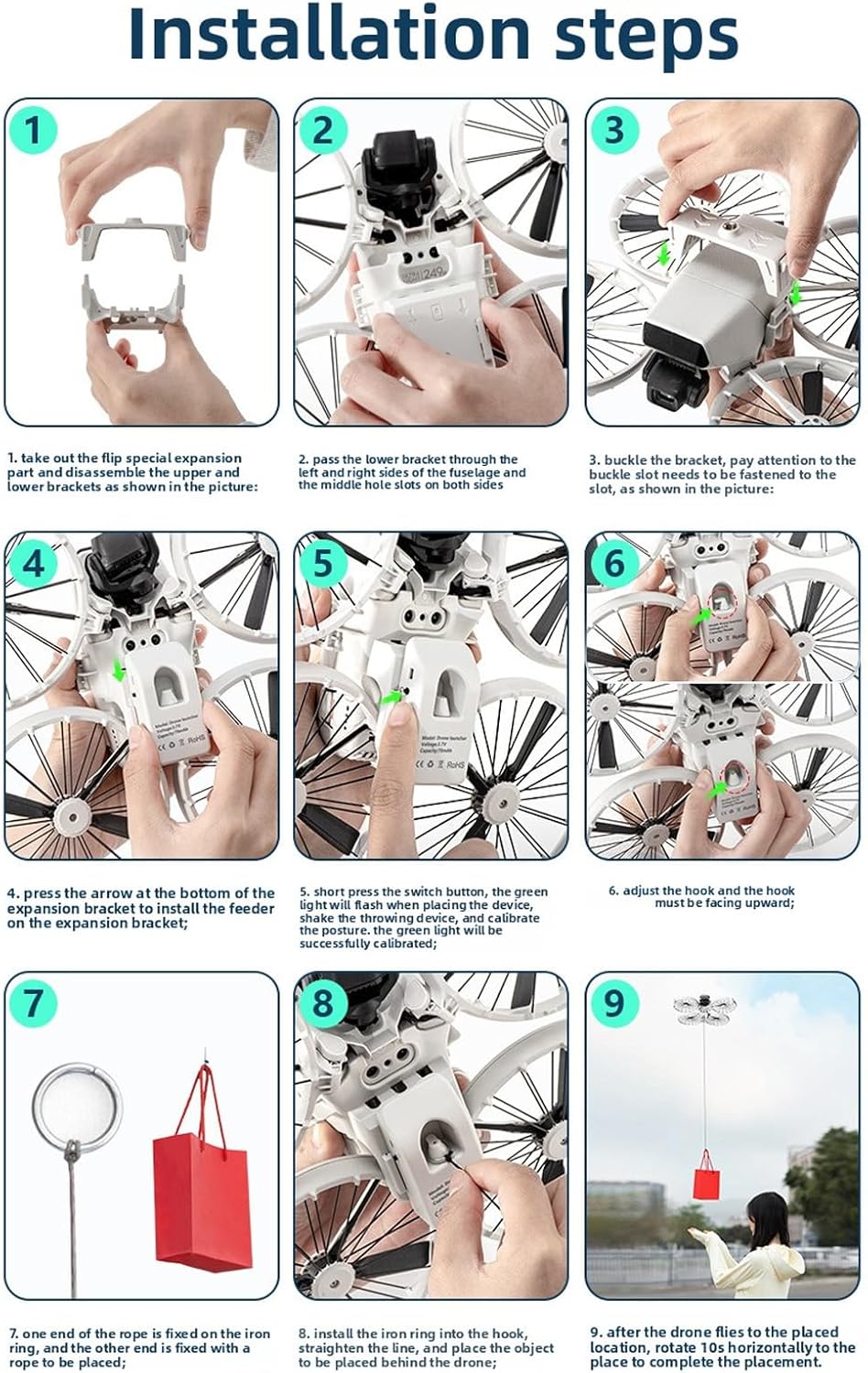 Fit per flip su misura: questo dispositivo di consegna è specificamente progettato per adattarsi ai droni a fogli mobili con precisione. Il dispositivo Flip AirDrop si adatta accuratamente al fondo del drone, assicurando che non blocchi il del sensore verso il basso. È facile da installare e non influisce sul volo del drone. Capacità di consegna direzionale: il AirDrop consente la consegna mirata in base alle impostazioni programmate, consentendo al drone di eseguire manovre preimpostate all'interno di qualsiasi intervallo remoto. Dopo che il drone ruota in posizione per 10 secondi, rilascia automaticamente, rendendo il funzionamento semplice e intuitivo. Espandibile con filettatura a vite da 1/4 di pollice: il rilascio di droni e il dispositivo di rilasciamento hanno un filetto per vite da 1/4 pollice superiore per collegare telecamere leggere, consentendo filmati e consegna simultanei eccellenti. Gli utenti possono espandersi in base alle esigenze delle riprese, migliorando le esperienze di fotografia aerea. Batteria efficiente e capacità di carico: il di consegna del payload drone supporta un carico massimo di circa 50 grammi. Con una batteria integrata da 70 mAh, si carica completamente in 1 ora e può essere utilizzata circa 400 volte con una carica completa. Scenari di utilizzo versatili: il di consegna del payload drone è adatto a varie occasioni come pubblicità, caduta di esche, consegna dei regali, consegna di fiori per matrimoni, consegna ad anello, catering, raccolti familiari, celebrazioni del festival, feste di compleanno e feste sulla spiaggia, aggiungendo un divertimento infinito alla vita.