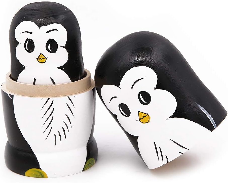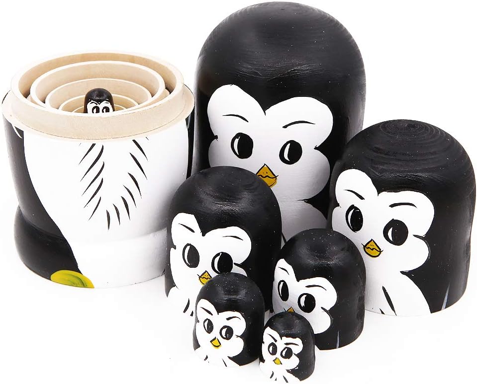Realizzato in tiglio, qualità leggera e durevole, resistente alla deformazione. Tutto il processo di fabbricazione è fatto a mano e ogni bambola pinguino è unica. Motivo a pinguino dei cartoni animati, colore brillante, carino e interessante, i bambini lo adoreranno. Contiene 7 bambole pinguino con dimensioni decrescenti, posizionate una all'interno di quella più grande e appaiono come una sola. Regalo perfetto per chiunque in ogni occasione, in particolare regala alla tua famiglia, alla festa della mamma o alla festa del papà, agli amici o ai bambini come regalo di compleanno, Natale, Capodanno, ecc.