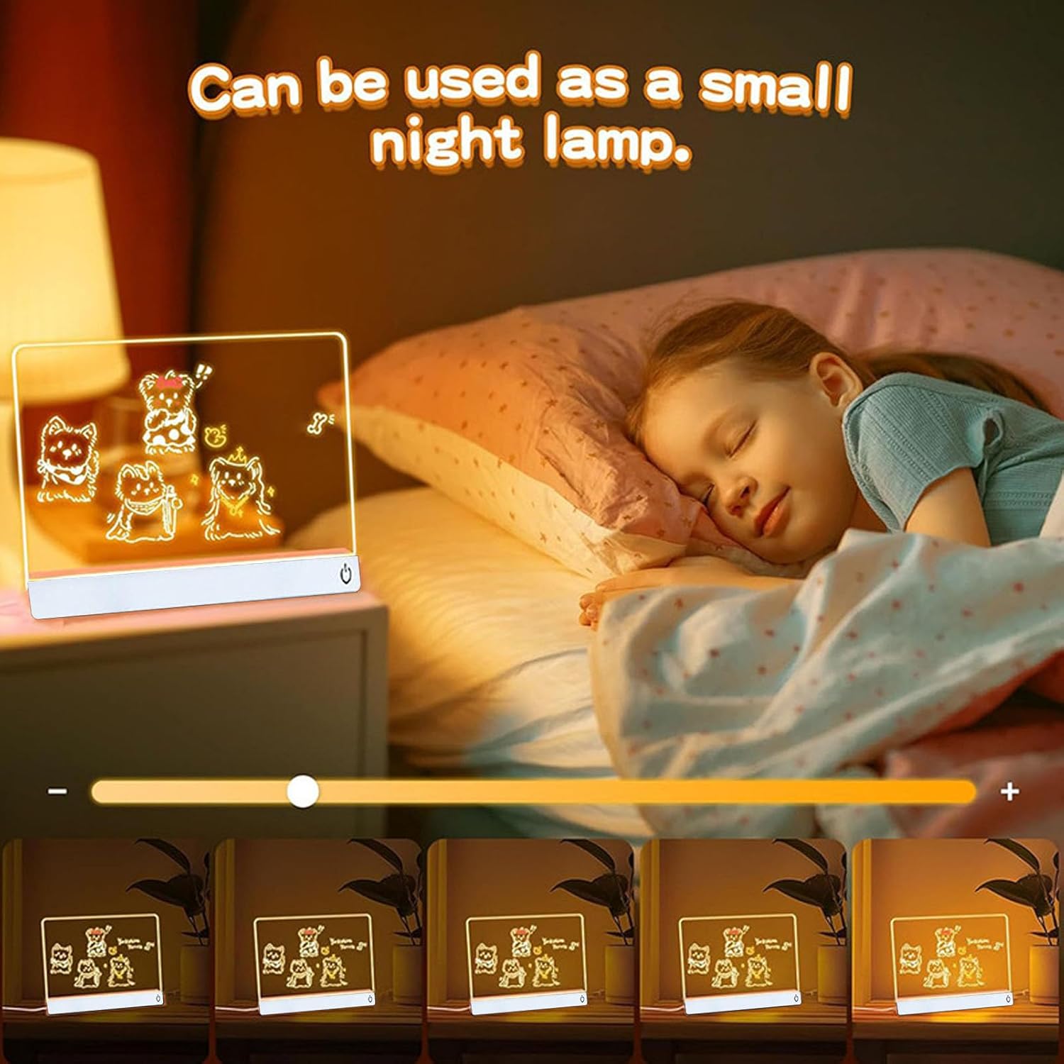 [Illuminazione RGB vibrante] La lavagna per appunti a LED presenta 7 brillanti opzioni di luce RGB e 4 modalità dinamiche: statica, saltante, lampeggiante e sbiadita, per rendere la tua esperienza di disegno divertente e coinvolgente. [Batteria a lunga durata] Dotato di una batteria ricaricabile ad alta capacità, questo tabellone luminoso può essere utilizzato senza fili fino a 5 ore, rendendolo adatto a feste e compleanni senza il fastidio dei cavi di alimentazione. [Kit di accessori completo] La bacheca luminosa viene fornita con tutto ciò di cui hai bisogno: 7 pennarelli vivaci, un espositore da tavolo, un panno per la pulizia, un cotone per la pulizia, un flacone spray e un gancio con catena per appenderlo. [Ampio spazio] Con un design spazioso di 11,8 pollici x 8 pollici, la lavagna cancellabile a secco in acrilico LED offre ampio spazio per disegnare. La sua superficie liscia rende la scrittura e la cancellazione un gioco da ragazzi. [Uso versatile] I bambini possono disegnare o imparare con questa bacheca LED, mentre gli adulti possono utilizzarla come blocco note o decorazione festiva. Adatto per segnaletica personalizzata, feste o per aggiungere una luce calda a qualsiasi stanza.