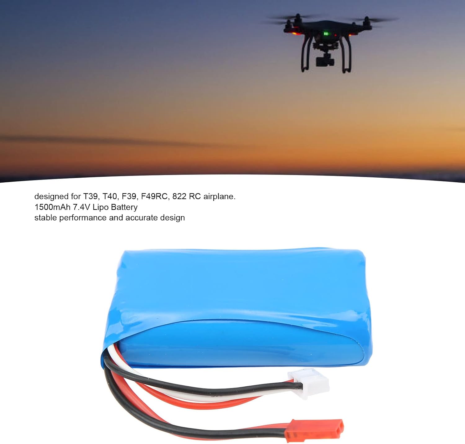 Aereo RC: questa batteria lipo da 1500 mAh è appositamente progettata per gli aerei T39, T40, F39, F49RC, 822 RC. Alta conversione: questa batteria lipo RC da 7,4 V presenta prestazioni stabili e design accurato che può realizzare la massima prestazione di scarica elevata di conversione dell'energia. 1500 mAh 7,4 V: questa batteria lipo RC da 7,4 V 1500 mAh offre tempo di lavoro duraturo e ti offre tempi di intrattenimento più lunghi. Spina JST femmina: questa batteria lipo per aereo RC adotta una spina JST femmina, può essere utilizzata come batteria di backup o batteria sostitutiva. Materiale sicuro: questa batteria RC 15C è realizzata con materiali sicuri e durevoli, che garantiscono prestazioni e struttura stabili.