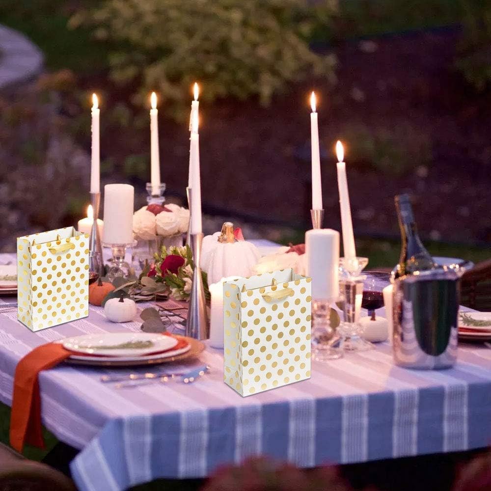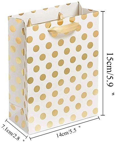 ➊DIVERSIFICAZIONE: adatto non solo per le celebrazioni, ma anche per confezioni regalo quotidiane per compleanni, feste, battesimi, matrimoni, anniversari, ecc. ➋DESIGN: le cinghie sopra i sacchetti di carta con manici sono in seta e risultano setose e non facili da maneggiare. La connessione ha un design anticaduta per la migliore esperienza. ➌ PROTEZIONE AMBIENTALE: I sacchetti regalo dorati sono realizzati in carta kraft riciclabile, il fondo è più spesso, non facile da rompere, la capacità di presa è buona, la durezza è moderata e non è facile da deformare. ➍ BELLISSIMO: questi bellissimi punti dorati rimangono sulla superficie dei tuoi sacchetti regalo e non si graffiano o cadono facilmente. Lo stile minimalista si adatta ad ogni figura in ogni scena. ➎ DIMENSIONE: la confezione contiene un totale di 12 sacchetti regalo che misurano 15 x 14 x 7 cm e sono di medie dimensioni per la maggior parte dei regali. Può essere piegato e riposto quando non viene utilizzato.
