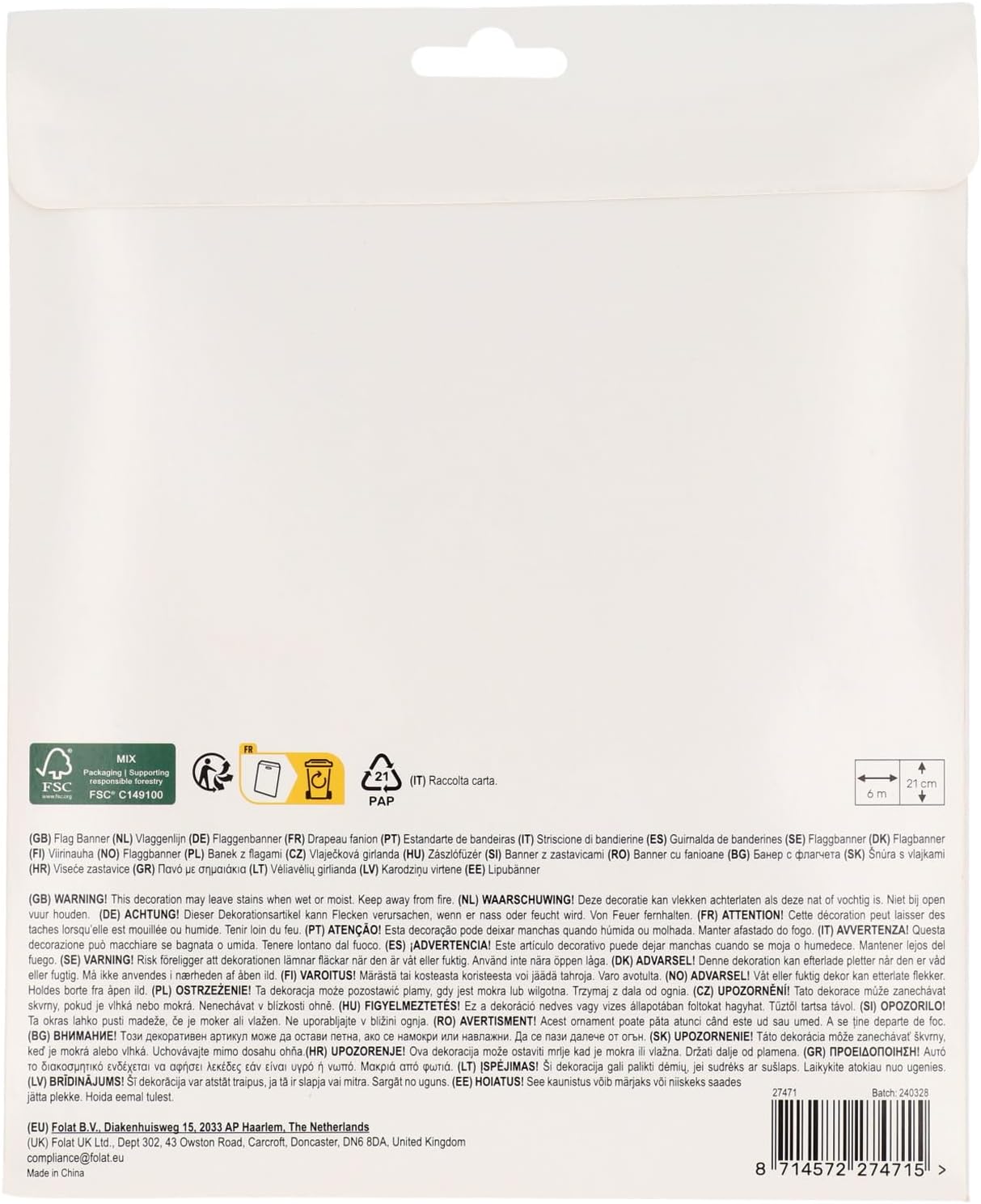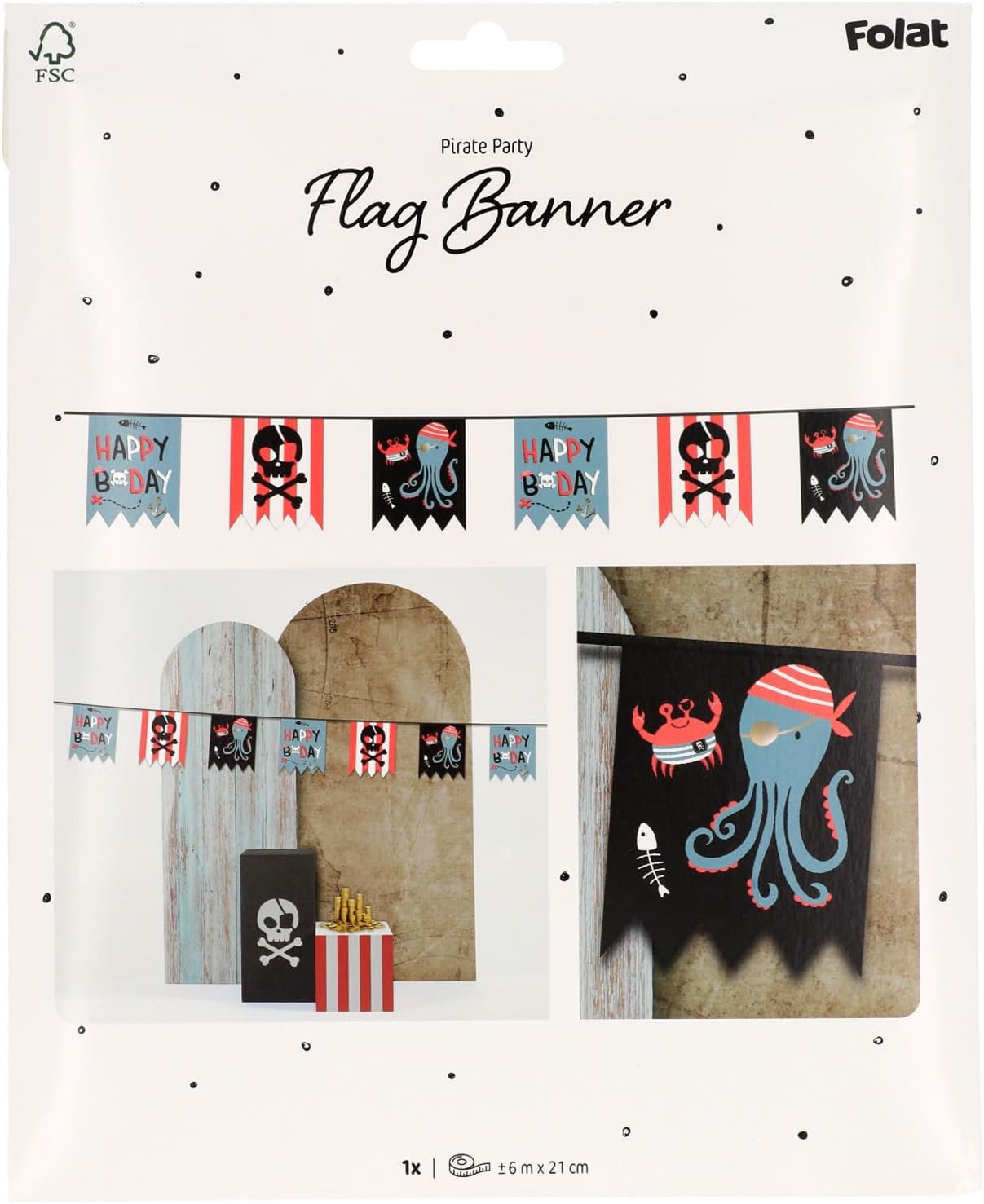 Alzate la bandiera! Ghirlanda di Bandierine - Pirate Party - 6 meter. Contiene: 1 ghirlanda di bandierine. Preparati per un'avventura emozionante con la nostra collezione unisex per feste a tema pirata, perfetta per i compleanni dei bambini in qualsiasi momento dell'anno. Su questa linea di bandiera di 6 metri ci sono 16 bandiere robuste e d'atmosfera di circa 17 x 21 cm. Ci sono 3 tipi di disegni in colori diversi: tre quadrati con un motivo a zig zag nella parte inferiore. Questa linea di bandiere appartiene alla collezione Pirate Party di Folat. Cappelli da pirata, monete, spade, ghirlande, palloncini e stoviglie: la festa dei pirati di Folat ha tutto.