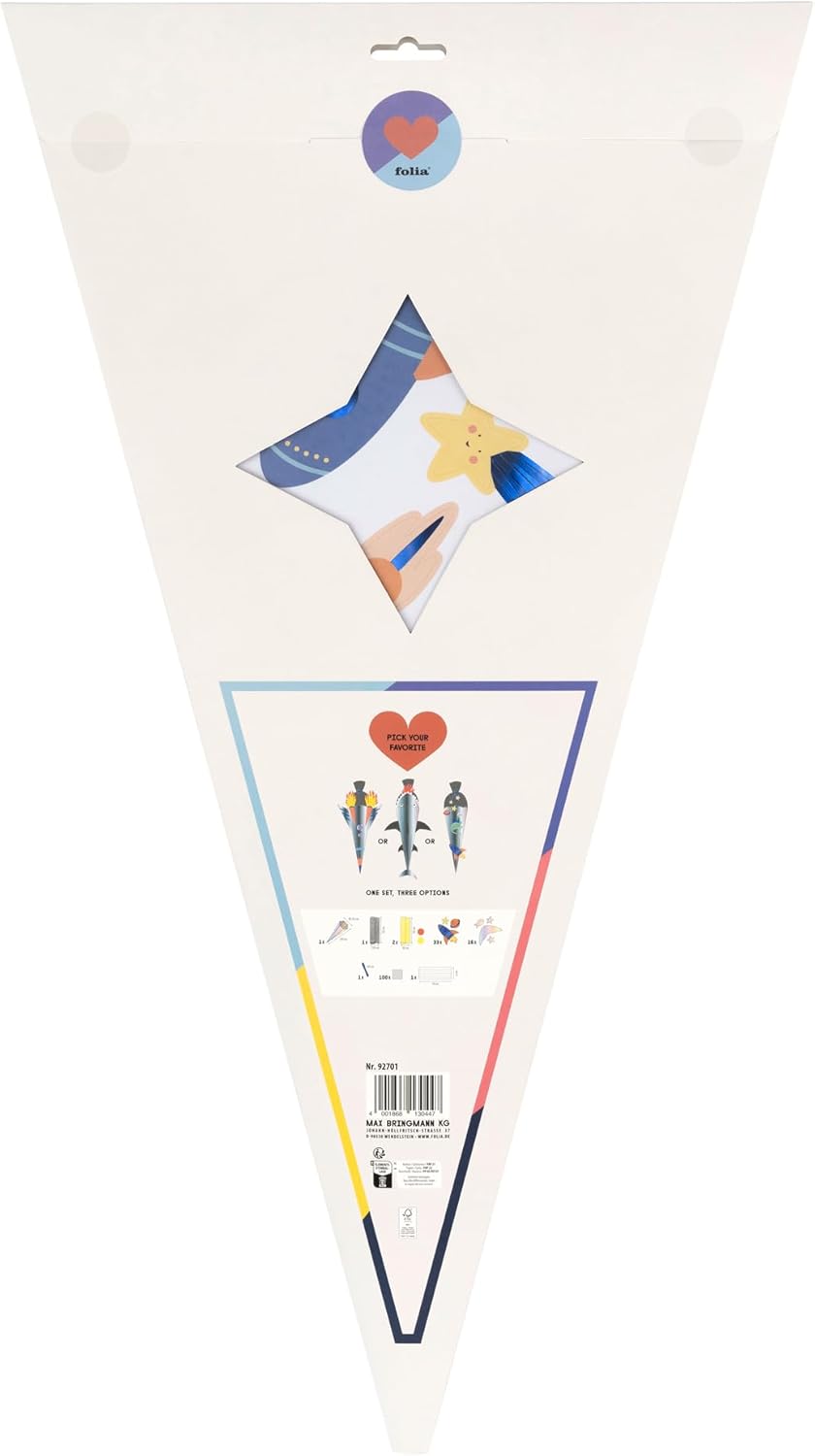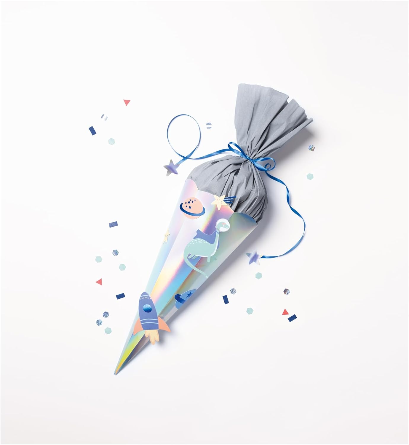 Kit di artigianato per disegnare una pigna di zucchero individuale È incluso il materiale per i motivi squalo, dino spaziale e razzo - scegliete un motivo o disegnate la vostra creazione. Il cono di zucchero, con una dimensione di circa 68 cm, offre spazio sufficiente per molte sorprese. Contenuto: Cono scolastico vuoto iridescente, 4x carta crespa in 4 colori, 7x fogli di fustellatura 4/4 colori stampati con finitura, 3x fogli di fustellatura di cartoncino iridescente, 80 cm di nastro di raso, pastiglie adesive 3D, nastro biadesivo e istruzioni dettagliate. Create ricordi indelebili dell'inizio della scuola con questo set creativo dal design accattivante.