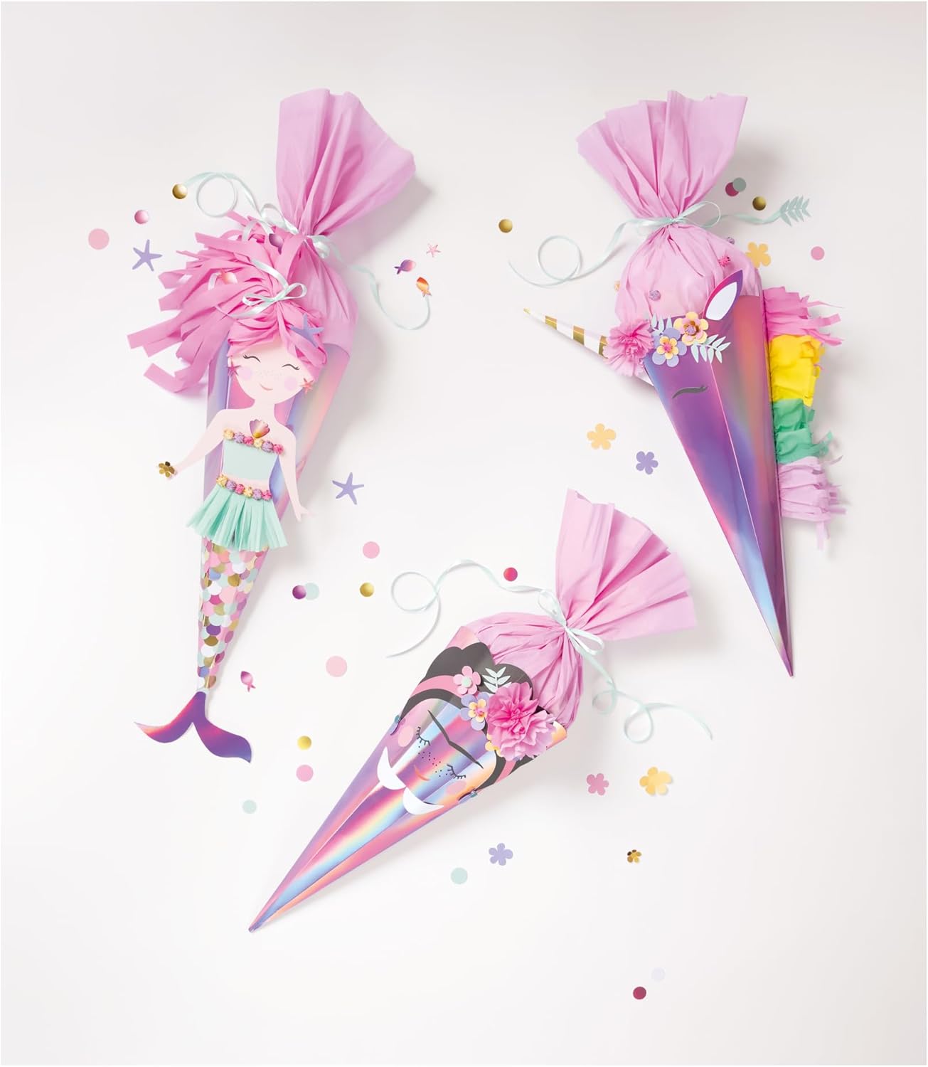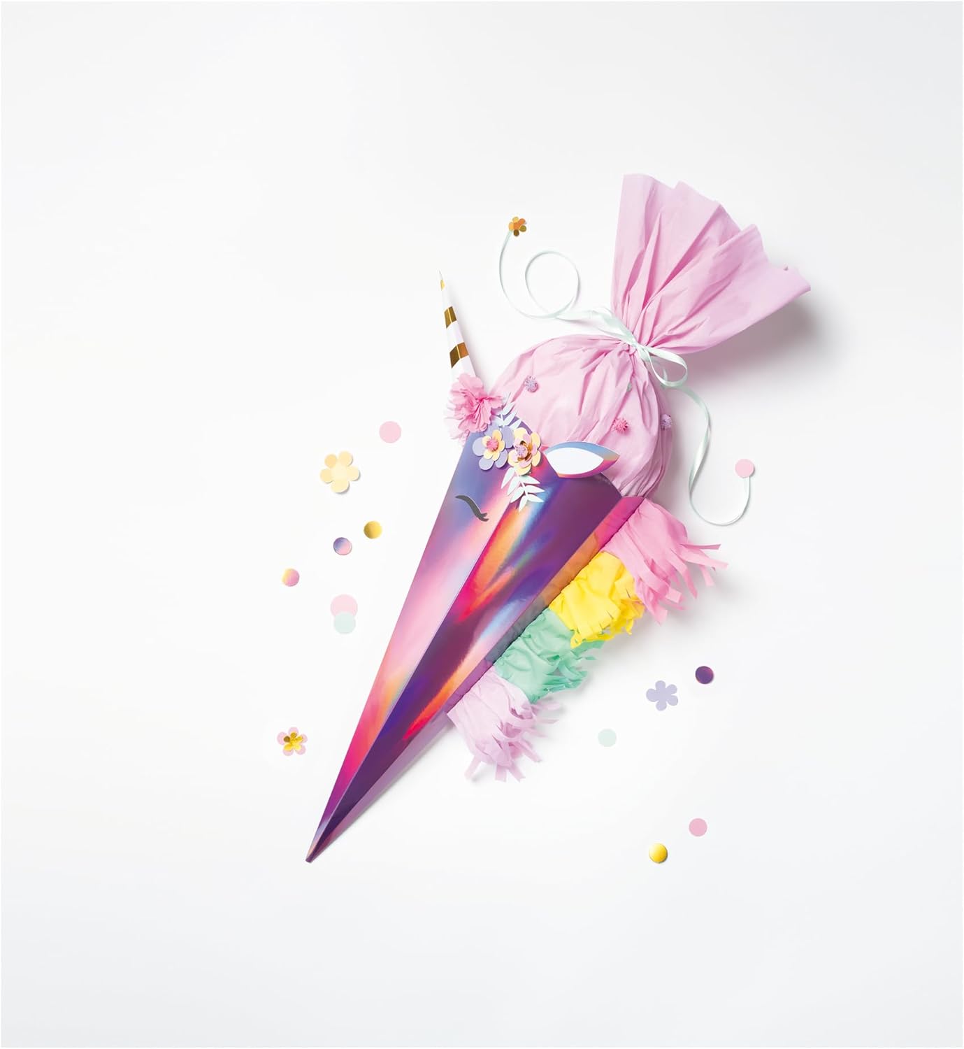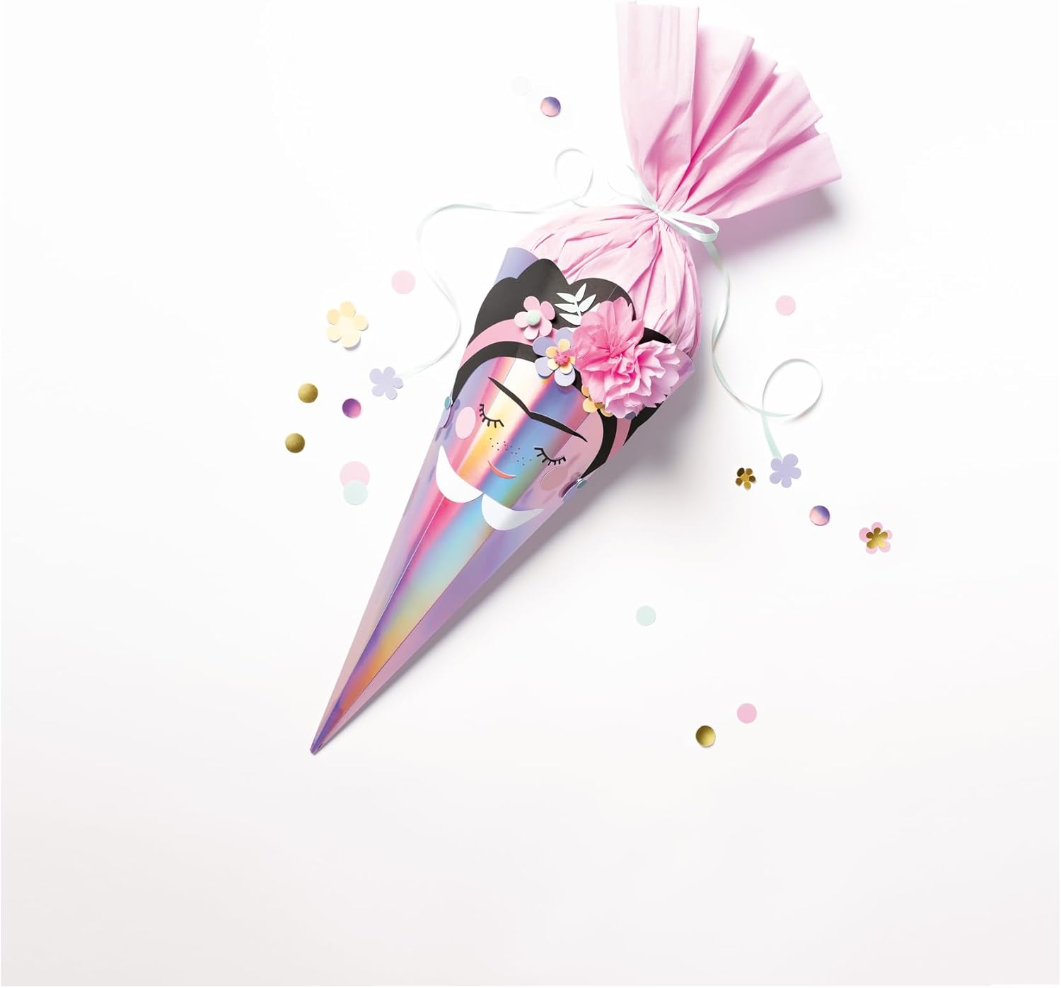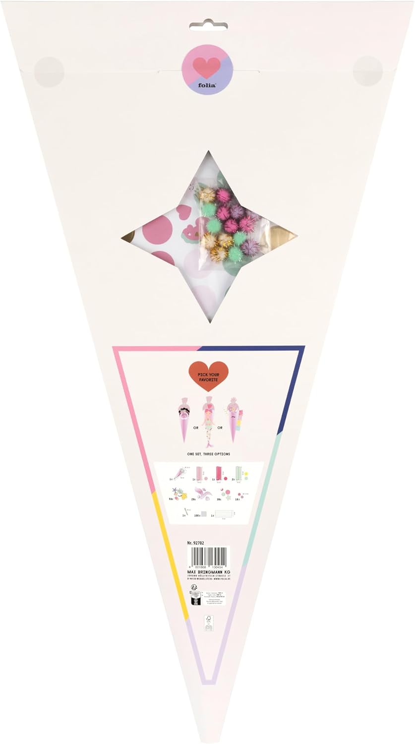 Kit di artigianato per disegnare una pigna di zucchero individuale È incluso il materiale per i motivi Unicorno, Frida o Sirena - scegliete un motivo o disegnate la vostra creazione. Il cono di zucchero, con una dimensione di circa 68 cm, offre spazio sufficiente per molte sorprese. Contenuto: Cono scolastico fustellato rosa iridescente, 5x carta crespa in 5 colori, 5x fogli fustellati a 4/4 colori stampati con finitura, 1x foglio fustellato di cartoncino iridescente, 30x pompon glitterati, 3,5 g di coriandoli, 80 cm di nastro di raso, cuscinetti adesivi 3D, nastro biadesivo, istruzioni dettagliate Create ricordi indelebili dell'inizio della scuola con questo set creativo dal design accattivante.