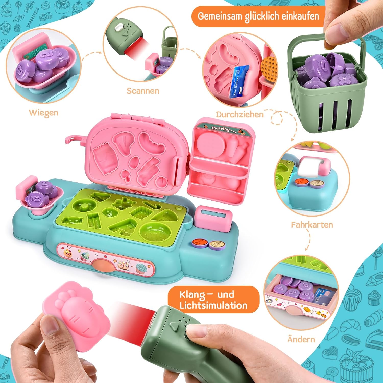 Set di gioco per bambini per la cassa del supermercato: il set per la cassa del supermercato contiene una vetrina (con cassetti), uno scanner simulato, una carta bancaria simulata, un cestino per la spesa, soldi di gioco, 12 accessori di pasta da gioco colorata, stampi per modellare la creta, ecc. Con un'ampia gamma di accessori e diverse opzioni di gioco, non è necessario acquistare ulteriori accessori. I bambini possono essere infinitamente creativi, è stato divertente creare merci con il set di pasta da modellare colorata e poi utilizzarle nel gioco di ruolo! Giocattolo 2 in1 in argilla da modellare per la cassa del supermercato: Durante la scansione degli articoli, lo scanner si illumina di rosso ed emette suoni come un vero scanner. Inoltre, i bambini possono dare sfogo alla loro creatività e creare modelli di articoli da supermercato con la pasta da modellare colorata e gli stampi in argilla da modellare inclusi, immaginando che i bambini prendano lo scanner, ricevano i clienti, calcolino il prezzo, striscino la carta, diano il resto, sperimentando la felice vita di un piccolo cassiere. Educativo e divertente: Questo giocattolo contiene una grande quantità di numeri e simboli accessori, attraverso la simulazione degli importi di fatturazione, i bambini possono imparare a calcolare i prezzi, trovare il resto e altre abilità di vita pratica nel gioco, esercitando l'abilità aritmetica e la capacità di pensiero logico dei bambini. Inoltre, gli accessori in argilla modellabile possono essere realizzati con forme per giocare con il cibo e sviluppare abilità pratiche e creatività. Materiale di alta qualità: i giocattoli per bambini del negozio di registratori di cassa sono realizzati in materiale di alta qualità con una lavorazione eccellente, i bordi del giocattolo sono arrotondati e il design liscio senza bave taglienti, la consistenza è molto buona, i bambini possono giocare con esso in modo sicuro. Con questo set di giocattoli, i bambini possono divertirsi con i giochi di ruolo e anche i genitori possono partecipare ai giochi per promuovere il legame tra genitori e figli. Regalo perfetto per i bambini: Se siete alla ricerca di un regalo emozionante ed educativo per compleanni, feste, Natale, altre celebrazioni, i giocattoli soddisfano la curiosità di tutti i bambini, migliorano la creatività, l'immaginazione e il senso estetico dei bambini, così come l'auto-espressione, il pensiero logico e le abilità numeriche di base.Adatto per i bambini dai 3 anni in su, immagina quanto sia accogliente e carino per i bambini giocare e interagire tra loro.