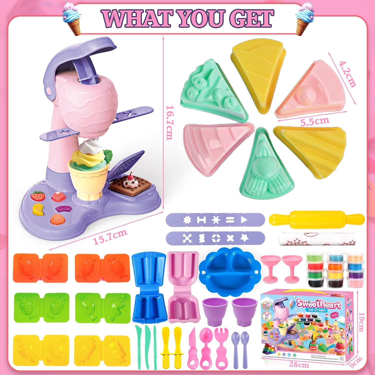 🍧 46 pezzi di Accessori in Plastilina: Il set di giocattoli in plastilina include: un set macchina del gelato, stampini per torte, animali, cibi e varie forme geometriche. Inoltre strumenti per modellare come matterello, taglierini, estrattore, stampini per caramelle, coltelli, stampini per ghiaccioli, coppette e vaschette per gelati. Il set di accessori per plastilina da 46 pezzi include 12 barattoli di Pasta da Modellare, completo e pronto all'uso senza necessità di acquistare accessori aggiuntivi 🍧 Set Di Formine per Plastilina: Gli strumenti per Plastilina coloratissimi e dalle forme diversificate sono perfetti per le manine dei bambini. La pasta si modella facilmente in qualsiasi forma. Fornisce ai bambini strumenti per tagliare, plasmare, premere, stampare e rollare per creare infinite opere a casa o a scuola 🍧 Alta Qualità: Ogni Accessori in Plastilina sicura e di alta qualità, materiale resistente, colorato e atossico. L'Pasta da Modellare è fatta di farina di grano commestibile, non unta, non appiccicosa, riutilizzabile e al 100% sicura 🍧 Stimola la Creatività: Questo set di Pasta da Modellare per Plastilina dai colori vivaci e forme varie è perfetto per stimolare la creatività dei bambini. Con strumenti per tagliare, plasmare, premere, stampare e rollare, i bambini possono creare infinitamente a casa o a scuola, divertendosi con tutti i loro amici 🍧 Regalo Perfetto: Questo set macchina del gelato in confezione regalo elegante aiuta a sviluppare le abilità manuali dei bambini. Ideale come regalo di compleanno, Natale, Halloween, feste, occasioni speciali e attività scolastiche. Perfetto per i bambini che amano interpretare il pasticciere e creare con strumenti per modellare. La varietà colorata e ricca stimola l'immaginazione e la creatività di innumerevoli bambini