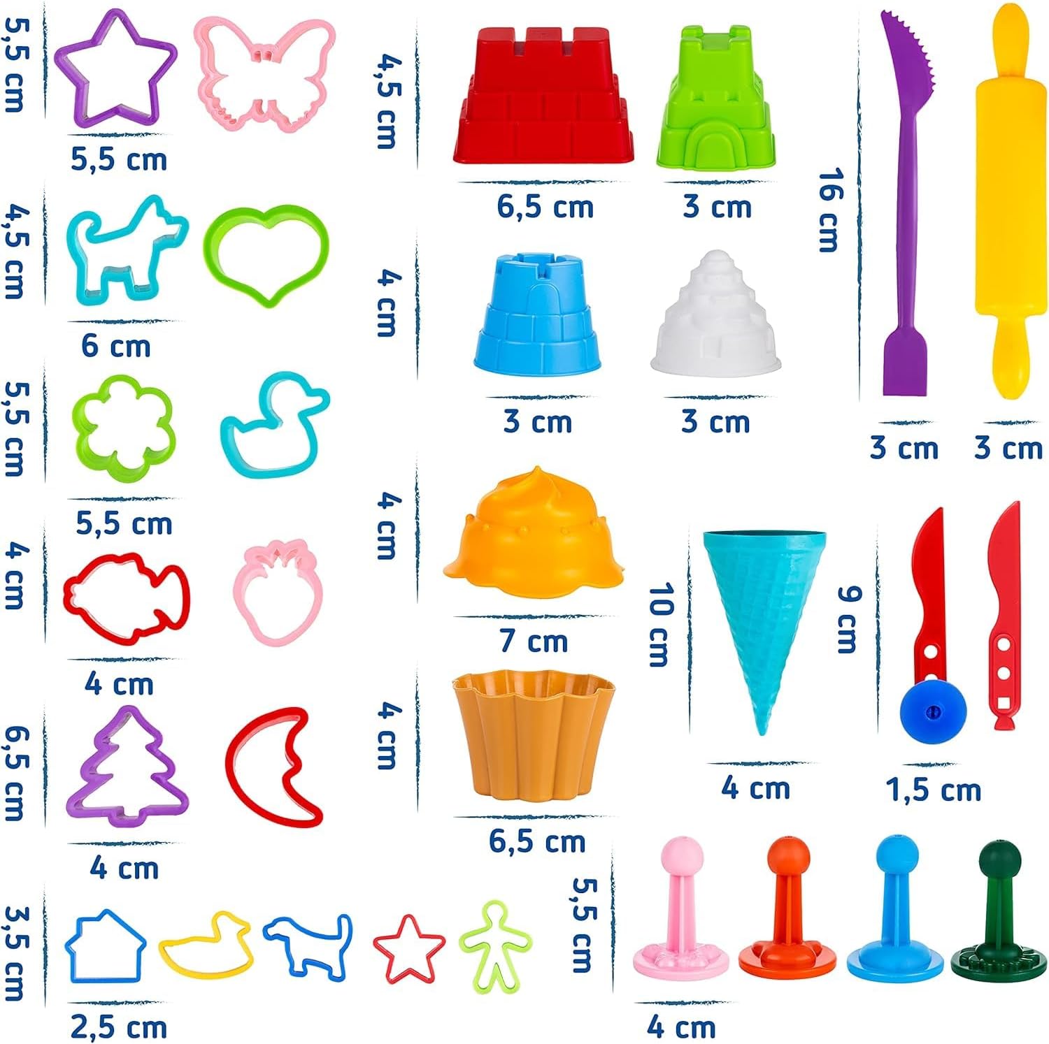 Le formine per bambini sono progettate per essere sicure ed intuitive, offrendo una varietà di forme divertenti e invitanti. Con opzioni che vanno dai classici stampini dido ai castelli di sabbia, questo set offre infinite possibilità di gioco creativo. Gli utensili plastilina inclusi nel kit permettono di modellare, tagliare e creare con facilità. Questo set versatile di 30 pezzi è perfetto non solo per la plastilina, ma anche per la sabbia magica, la pasta modellabile e molto altro. Inoltre, le formine per la sabbia sono perfette per costruire castelli e paesaggi fantastici durante le giornate estive in spiaggia. Set GenioKids dido per bambini contiene 30 accessori: 10 stampi grandi e 5 stampini piccoli, due coltelli, un mattarello, 4 stampini, 4 stampini per costruire castello, un cono gelato, 2 stampini per fare cupcakes, un coltello da pizza. I nostri accessori per plastilina bambini sono progettati per stimolare le capacità motorie dei più piccoli. Mentre i bambini si divertono a manipolare la sabbia, le giocattolo cinetico, la plastilina o la pasta, le loro mani e dita si rafforzano, migliorando la coordinazione occhio-mano e sviluppando le capacità motorie fini. Aiuta a sviluppare le abilità motorie e stimola la creatività. Ogni pezzo del nostro set di formine dido per pongo è robusto e durevole, garantendo ore di gioco senza interruzioni. Sia che i vostri bambini preferiscano modellare plastilina, creare castelli di sabbia, lavorare con la pasta di sale o sperimentare con il pongo, questo set di accessori e attrezzi è l'aggiunta perfetta per la loro scatola dei giocattoli. Ogni formina è progettata per essere facile da usare e sicura per i bambini. Realizzato con materiali sicuri e non tossici. Se siete alla ricerca di un regalo pratico e divertente per i vostri bambini, il nostro set di formine dido per pongo è una scelta eccellente. Questo set di accessori e attrezzi per bambini non solo offre un gioco creativo, ma aiuta anche a sviluppare importanti capacità motorie. Non perdete l'occasione di arricchire l'esperienza di gioco dei vostri bambini con il nostro set di formine dido per pongo.