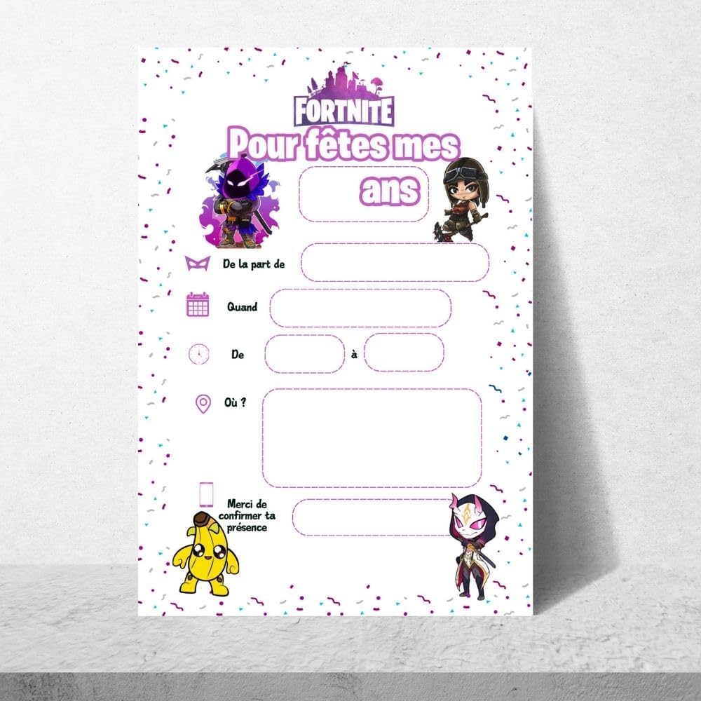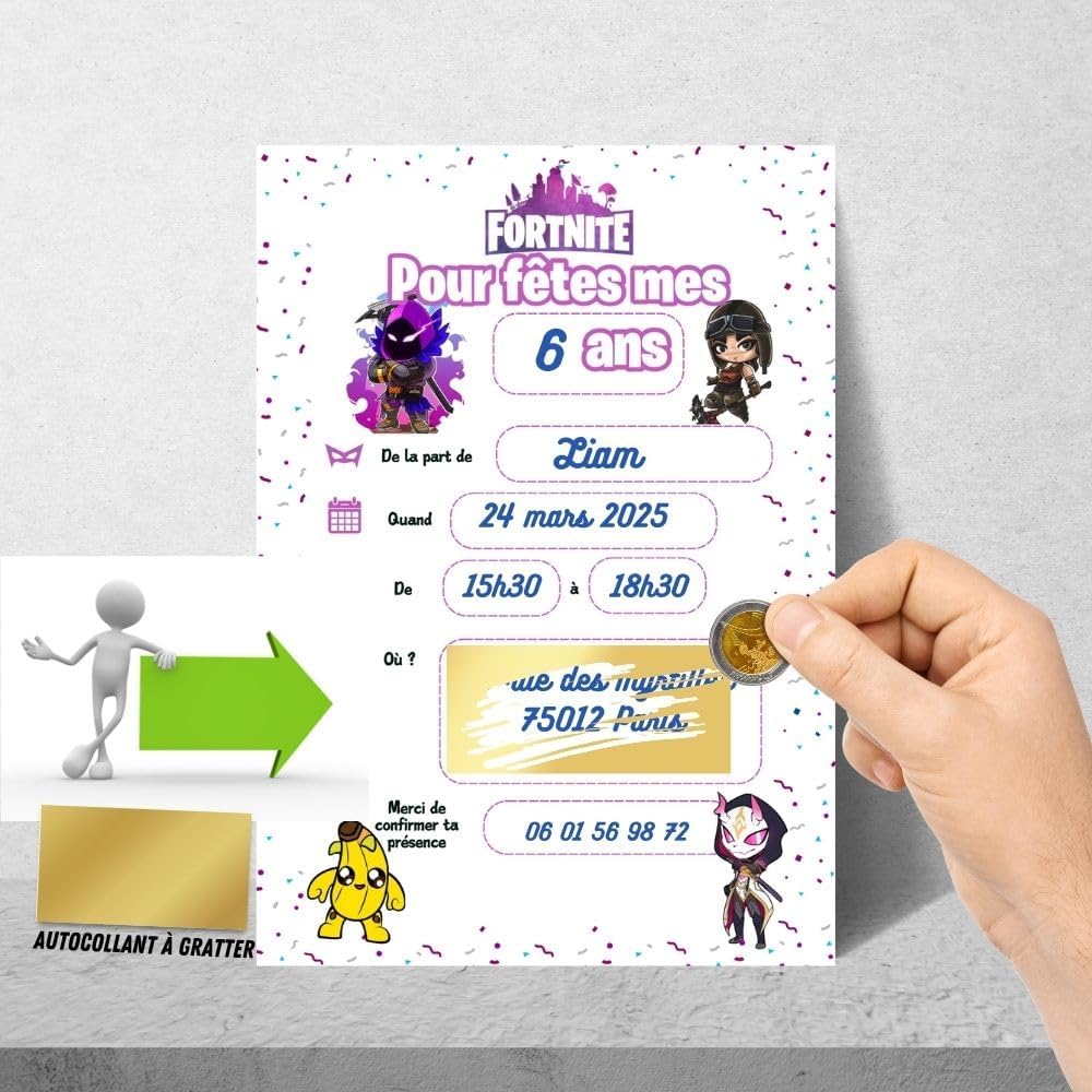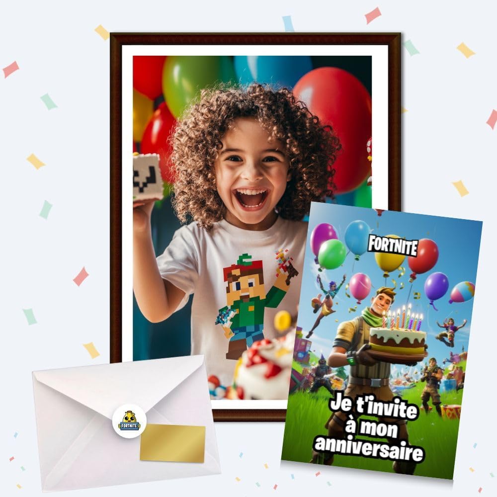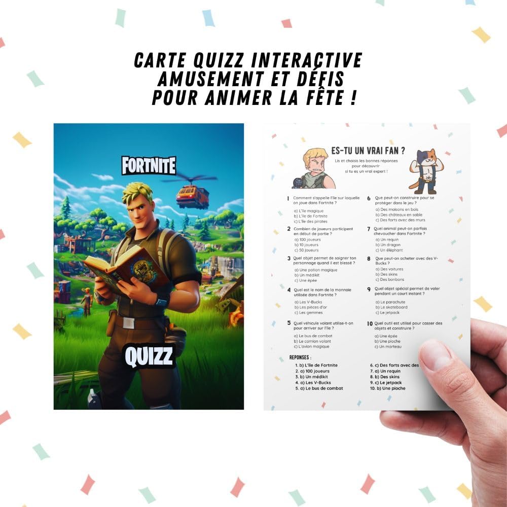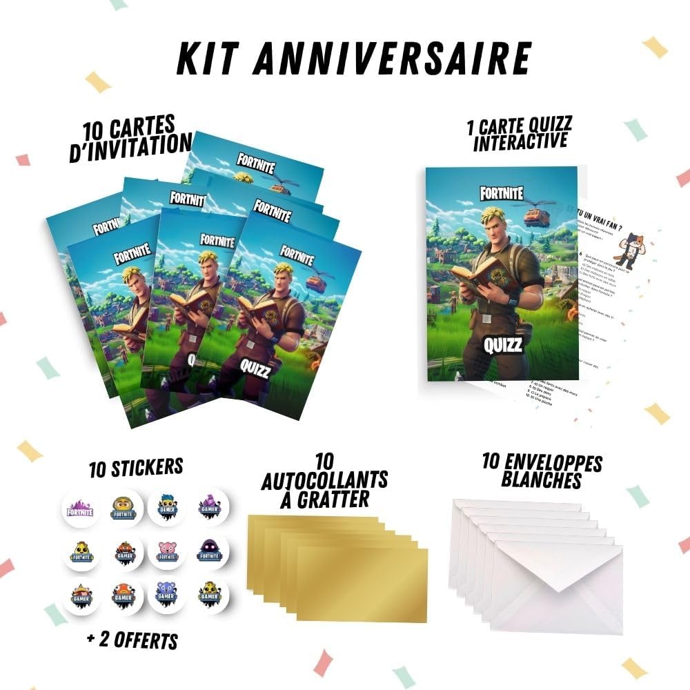 CONTENUTO DEL KIT: Set completo di 10 biglietti d'invito Fortnite con 10 adesivi, 10 adesivi dorati da grattare e 10 buste bianche MAPPA INTERATTIVA: Include una speciale scheda quiz interattiva per più divertimento durante la festa di compleanno DIMENSIONI: Formato pratico di 15 x 10 cm per ogni biglietto, perfetto per gli inviti Imballaggio: consegnato in una confezione ordinata di 17 x 10 x 1 cm per proteggere le carte Design unico: tema Fortnite colorato con palloncini e torta di compleanno, ideale per i fan del gioco