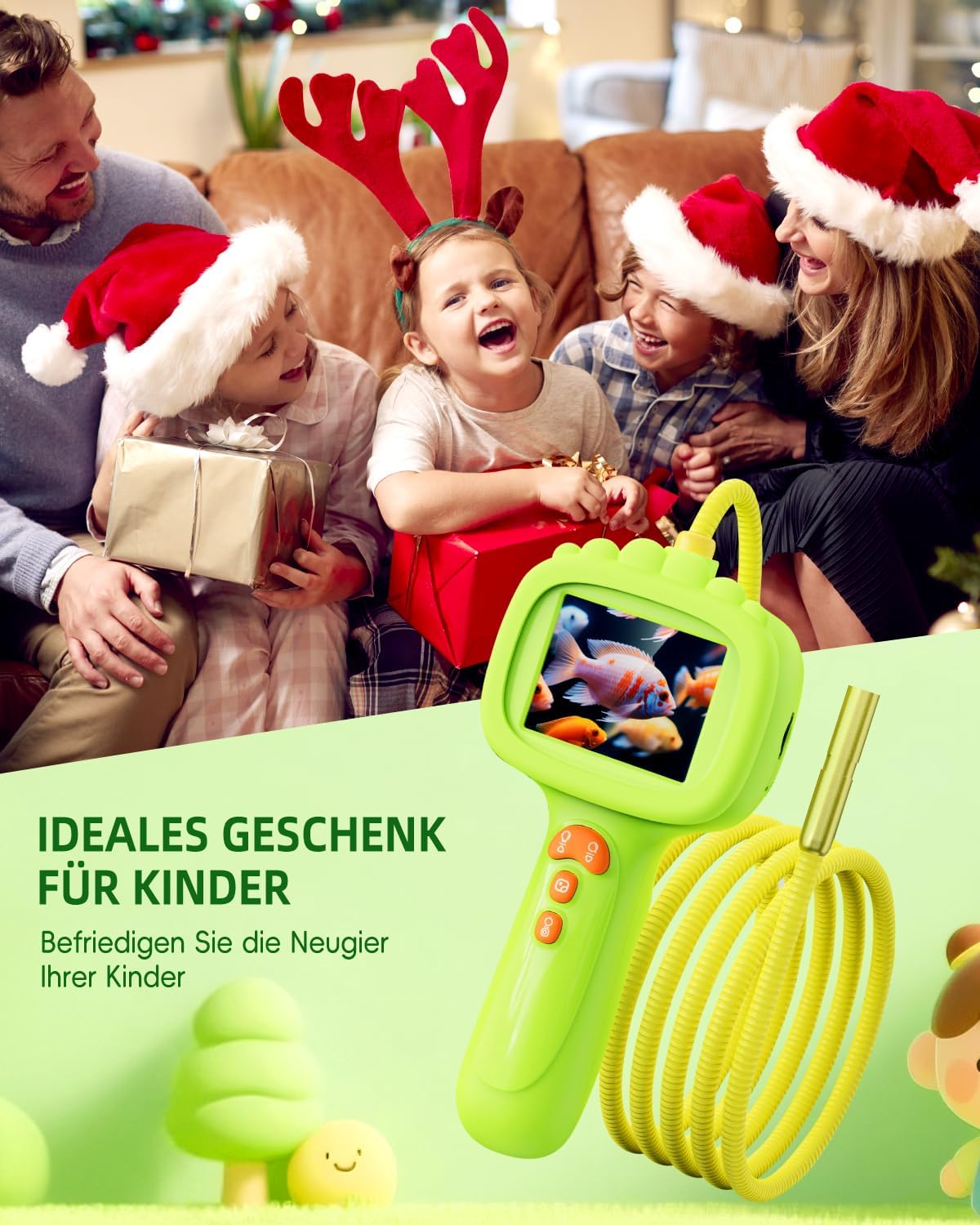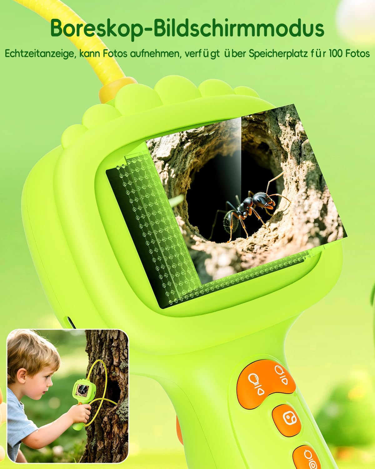 Un must per i bambini: accendi la curiosità di ogni piccolo esploratore con questo endoscopio a misura di bambino! Non è solo un giocattolo, ma un giocattolo STEM resistente e facile da usare che ispira i bambini a esplorare la vita all'aria aperta: può trasformare istantaneamente il giardino in una base di scoperta piena di sorprese! I bambini e le bambine dai 4 anni in su possono azionarlo in modo indipendente, osservare insetti, nidi di uccelli e persino scoprire "buchi di formiche" nascosti sotto le pietre. Schermo protettivo per gli occhi HD da 2,4 pollici: proteggi la vista dei piccoli esploratori! Questo endoscopio per la scoperta dei bambini è dotato di un display IPS HD da 2,4 pollici, che non solo fornisce un'esperienza visiva chiara e raffinata, ma tiene anche conto di un design gradevole per gli occhi e non causa affaticamento degli occhi. Anche nelle scene di scoperta all'aperto con luce solare abbagliante, può mostrare chiaramente piccole piante e insetti striscianti nello stagno e risolvere i problemi di sfocatura in condizioni di luce intensa. Anche i bambini possono vivere una piacevole esperienza visiva mentre sono impegnati in lunghe scoperte scientifiche: questo è fondamentale per i giocattoli educativi! Cattura le meraviglie della natura: con un cavo flessibile e controllabile lungo 1 metro, l'obiettivo di piccolo formato da 7,9 mm può facilmente penetrare nell'erba e nelle fessure. Il design impermeabile IP67 di lente e cavo supporta la scoperta in acquari, aree con acque poco profonde e stagni senza timore di ambienti umidi e bui. Puoi registrare 100 momenti meravigliosi senza scheda di memoria. (Nota: la carta TF non è inclusa nella confezione). Questa è una fotocamera ideale per bambini dai 4 anni in su che trasforma un viaggio in campeggio in un diario scientifico digitale. Giorno e notte sereni: scopri i segreti della natura di notte! Il nostro obiettivo HD da 2 megapixel è dotato di 8 luci LED regolabili per illuminare ragnatele, lucciole e fessure oscure al chiaro di luna. L'immagine nitida rende questa fotocamera a serpente illuminata la scelta ideale per l'esplorazione STEM indoor/outdoor: è un punto di svolta per i piccoli esploratori. Introduzione all'avventura quotidiana: essendo un giocattolo STEM durevole, non è solo "gioco", ma può anche coltivare le capacità di osservazione, concentrazione e destrezza manuale dei bambini nella scoperta, consentendo ai bambini di pensare attivamente e scoprire segreti mentre si avvicinano alla natura. Questo fantastico regalo di avventure educative è adatto ai ragazzi dai 4 ai 10 anni: un regalo di compleanno/Natale perfetto per stimolare la loro curiosità sulle materie STEM.