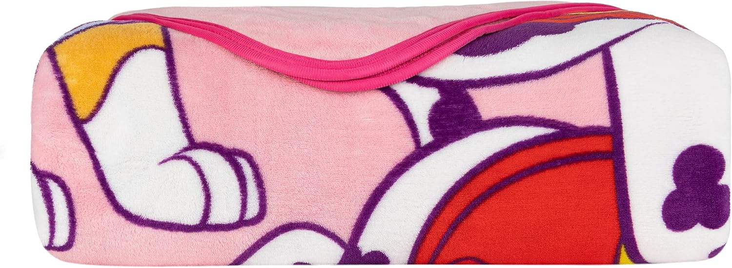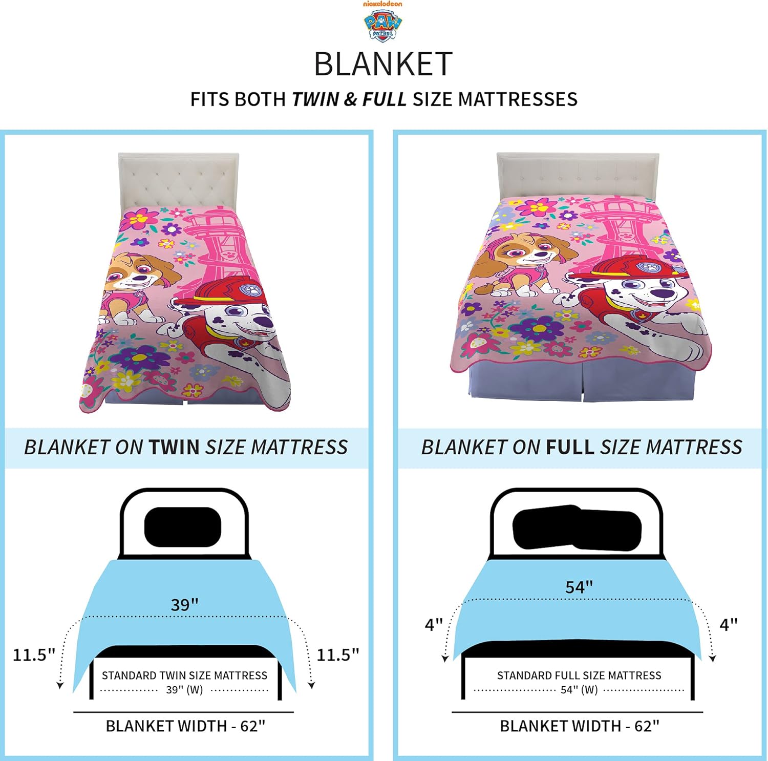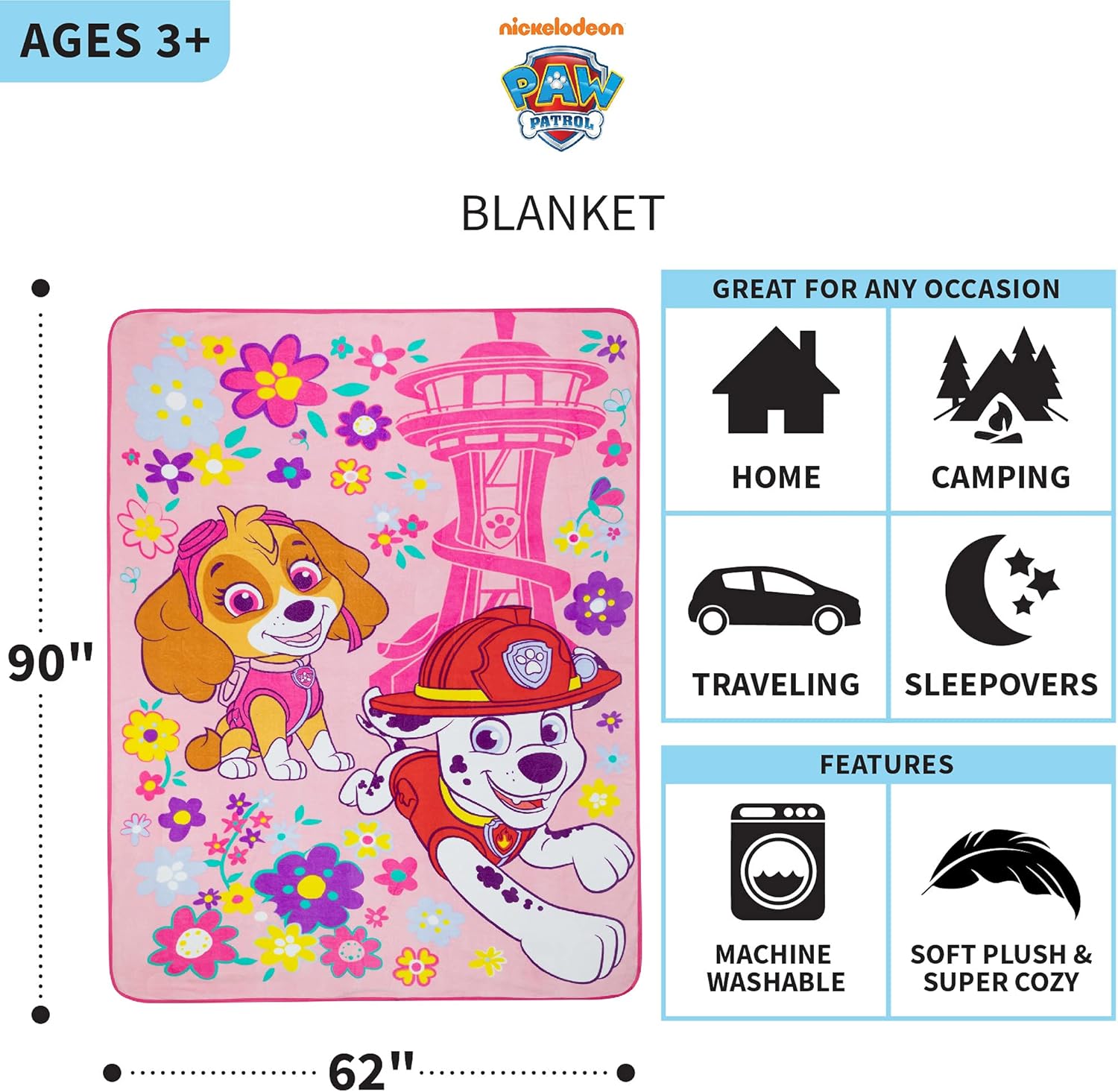 Design Paw Patrol: i cuccioli di salvataggio Skye e Marshall portano il divertimento e l'eccitazione della casa Paw Patrol di Nickelodeon con questa simpatica coperta in peluche. L'adorabile motivo "Pup for flowers" cattura l'energia colorata della serie animata di successo. Divertimento per ogni occasione: realizzata per il massimo comfort, questa coperta giocosa diventerà immediatamente una delle preferite per andare a letto o per i pisolini. La coperta leggera e facile da trasportare è il compagno perfetto per pigiama party, asilo nido, campeggio, viaggi, gioco, sonnellino e coccole. Morbido peluche e super accogliente: il tuo piccolo si sentirà accogliente e al sicuro avvolto in questa morbida coperta Micro Raschel con il suo personaggio dei cartoni animati preferito. L'accogliente materiale di alta qualità mantiene bambini e bambini caldi e comodi mentre si coccolano per riposare o rilassarsi. Facile manutenzione: la coperta può essere gettata in lavatrice e asciugatrice senza preoccuparsi che il motivo colorato sbiadisca o la necessità di stiratura. Il materiale è resistente alle pieghe, il che lo rende un'ottima scelta per la camera da letto di qualsiasi bambino, asilo nido, scuola o come accessorio decorativo per la casa. L'articolo include: una coperta super morbida e confortevole che misura 157,5 cm (larghezza) x 228,6 cm (lunghezza). Dimensioni perfette per dormire o fare un pisolino e abbastanza grande per adattarsi a un letto matrimoniale standard o matrimoniale o da utilizzare sul divano.