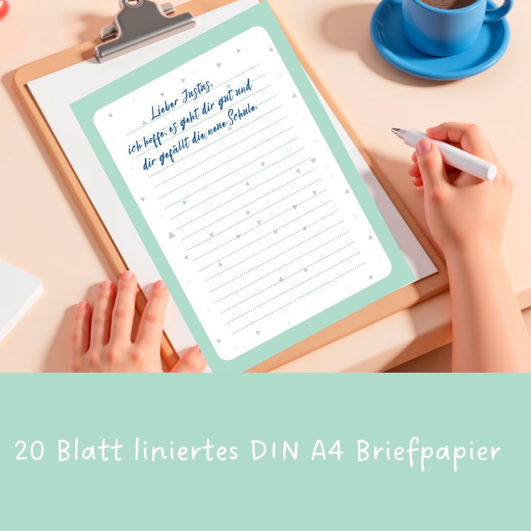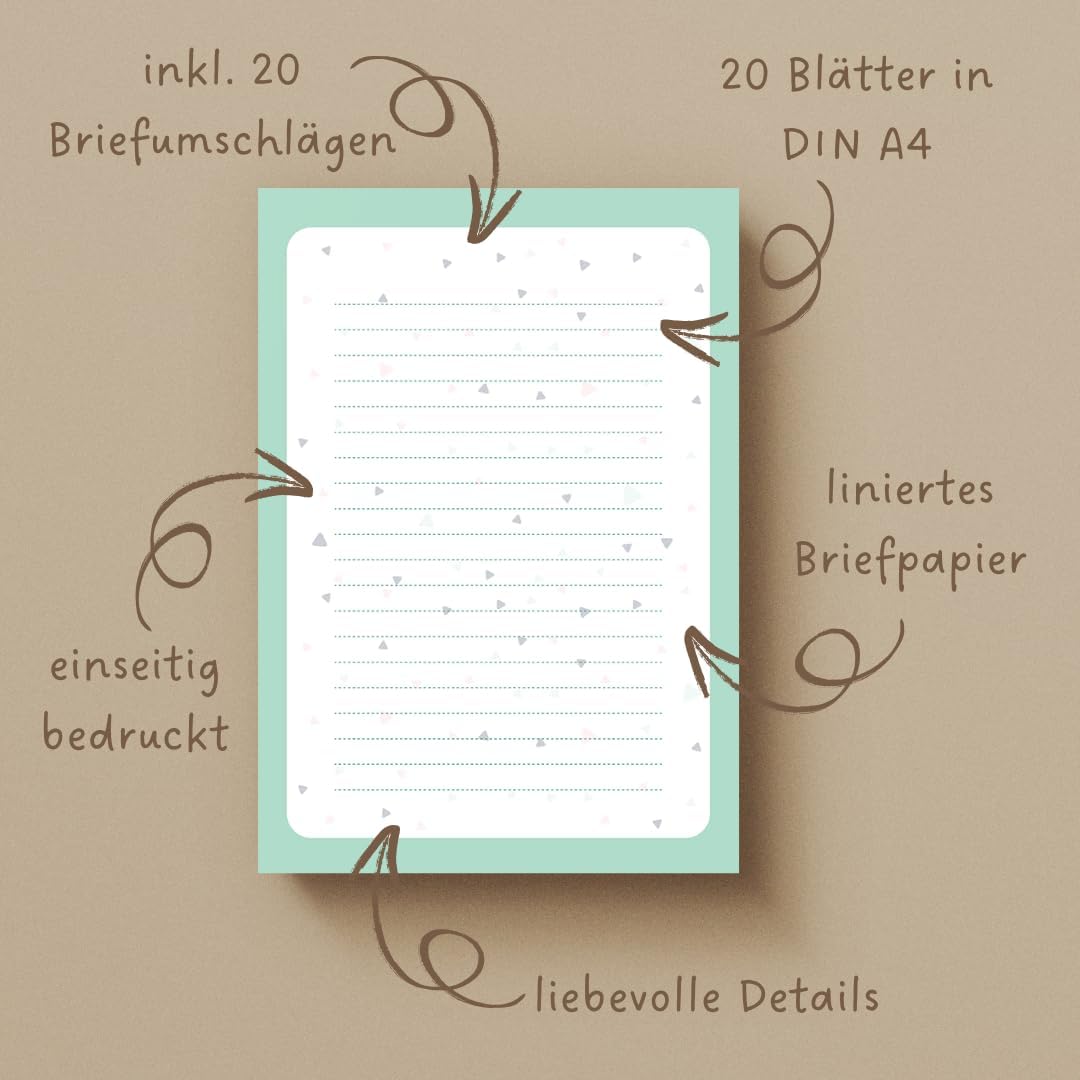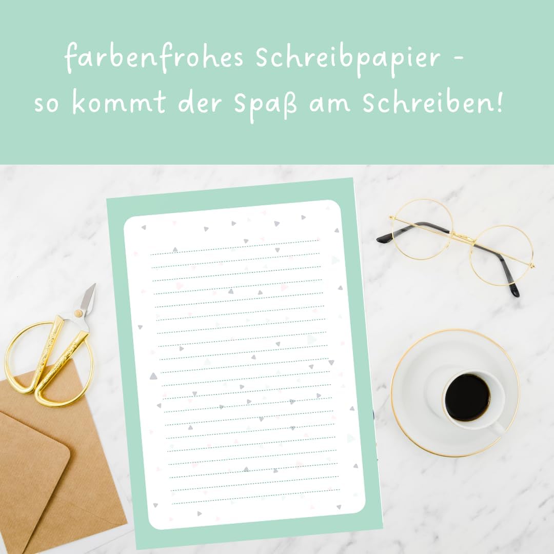 Bella carta da lettera: la carta da lettere colorata mette immediatamente di buonumore e, grazie ai triangoli moderni, scrivere lettere sarà un vero piacere. Spazio sufficiente: il set di carta da lettere è composto da 20 fogli di carta DIN A4 e 20 buste abbinate (C6). La carta da lettere a righe ben distanziate offre inoltre spazio sufficiente per tutti i tuoi pensieri, esperienze e messaggi che vuoi condividere con i tuoi amici e conoscenti. C’è posta per te: una bella carta da lettere con motivo, perché la corrispondenza con le lettere è tornata di moda. Sorprendi i tuoi amici con questa fantastica carta per lettere e goditi le numerose risposte. Scrivi lettere invece di inviare email: chiunque è felice di ricevere una vera lettera nella cassetta della posta. Con una bella carta da lettere tutti ritroveranno il piacere di scrivere delle lettere, sia i ragazzi che le ragazze, gli adulti e i bambini. Il set di carta da lettere è adatto anche come regalo. Questa carta da lettere, inoltre, si adatta perfettamente a inviti, matrimoni, ringraziamenti per nascita, battesimo, comunione o cresima.
