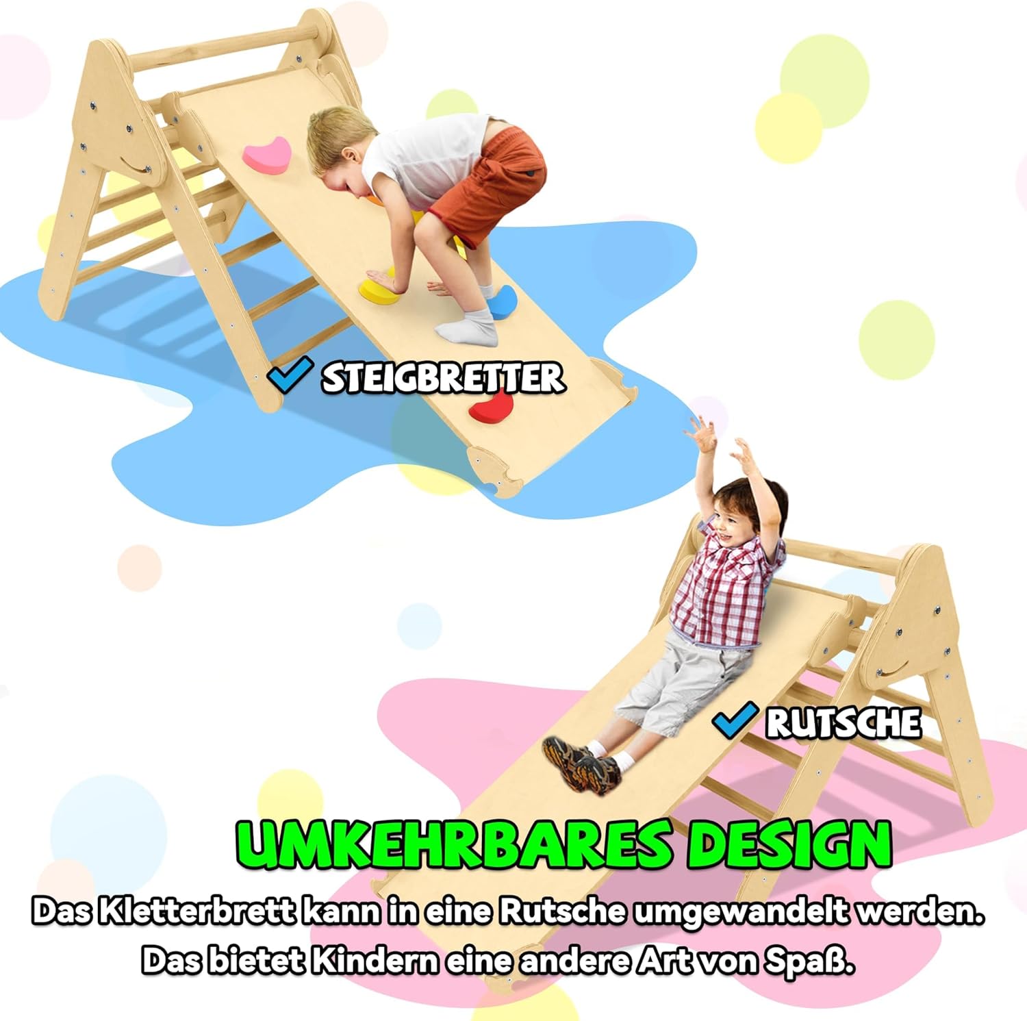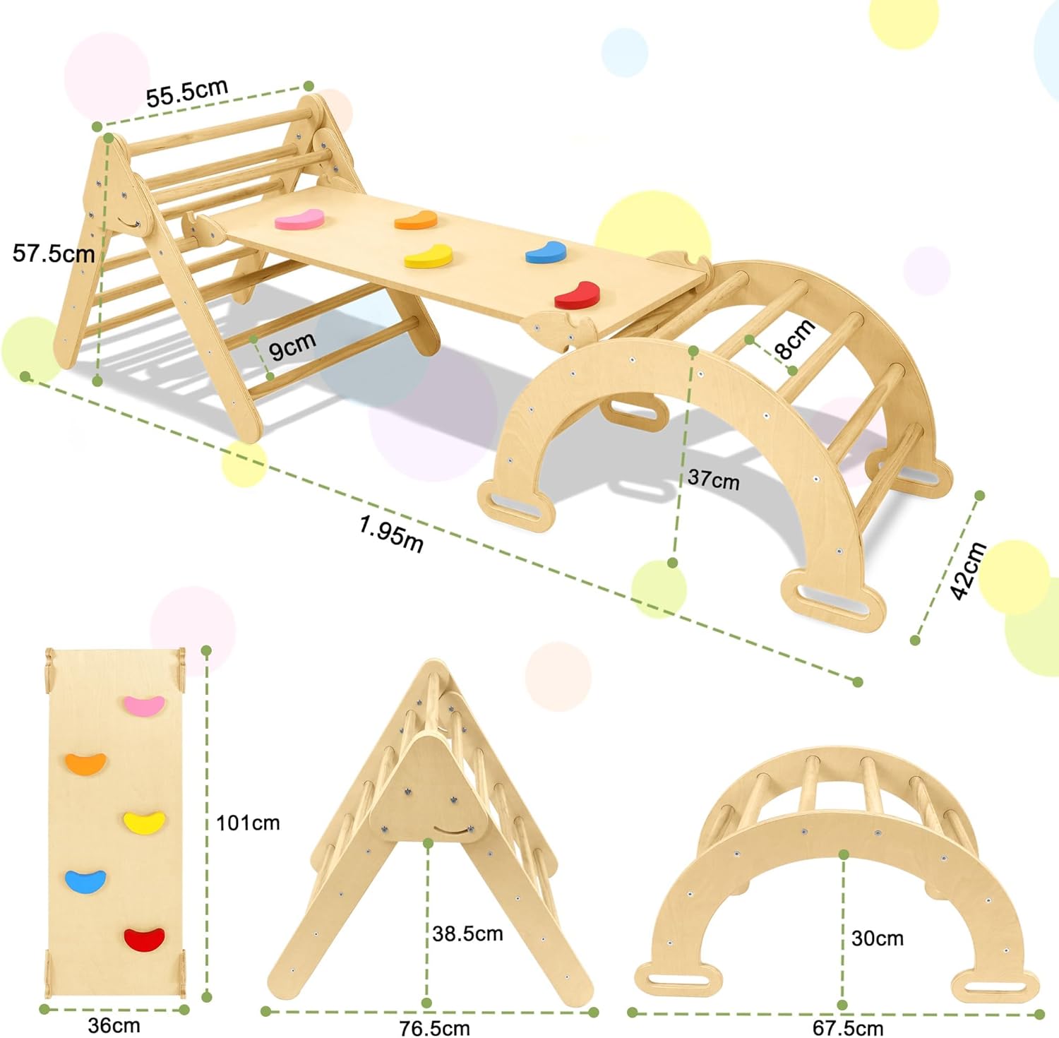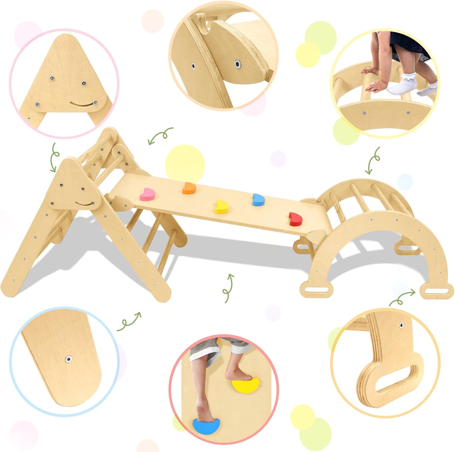 Triangolo da arrampicata realizzato con materiali di alta qualità: questa struttura per arrampicata per bambini è realizzata in legno di betulla naturale di alta qualità, robusto e con una superficie liscia, senza sbavature, levigata a mano, così liscia da non danneggiare mani o piedi. Ideale per far giocare i bambini nella sala giochi, in salotto o all'aperto. Design versatile: questa scala da arrampicata 3 in 1 è composta da un treppiede, un arco da arrampicata e una tavola da arrampicata (scivolo) per soddisfare le esigenze dei bambini di un attrezzo sportivo indoor. Le tre parti possono essere utilizzate insieme o separatamente per creare un piccolo parco giochi al coperto per il tuo bambino. Stimola lo sviluppo del tuo bambino: questa scala da arrampicata per bambini può promuovere lo sviluppo motorio e la capacità di concentrazione del bambino in modo giocoso e sicuro, migliorando efficacemente la creatività, il tono muscolare, la fiducia in se stessi, il senso di equilibrio e la mobilità del bambino, in modo che il bambino possa crescere in modo felice. Sicuro e stabile: la struttura da arrampicata 3 in 1 è certificata EN71-1-2-3-8 e soddisfa la certificazione UE per la sicurezza dei giocattoli. La struttura triangolare, le connessioni stabili e il robusto meccanismo garantiscono sicurezza generale, stabilità e durata con una portata massima di 40 kg. I 4 piedini a nuvola in dotazione possono essere montati sulla struttura di arrampicata e garantiscono una maggiore stabilità durante l'uso. Triangolo da arrampicata Montessori: il treppiede ha un design pieghevole con dimensioni da aperto di 76,5 x 55,5 x 57,5 cm (dimensioni piegate 69 x 55 x 21 cm) e può essere ripiegato per risparmiare spazio quando non in uso. Le dimensioni dell'arco da arrampicata sono 67,5 x 41,5 x 37 cm. La tavola da arrampicata reversibile (scivolo) misura 101 x 36 x 6,5 cm e può essere convertita in uno scivolo o in una tavola da arrampicata.