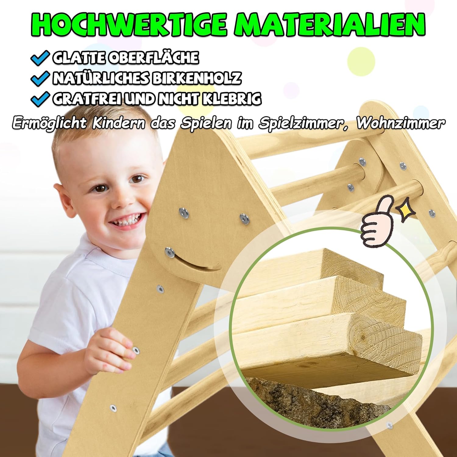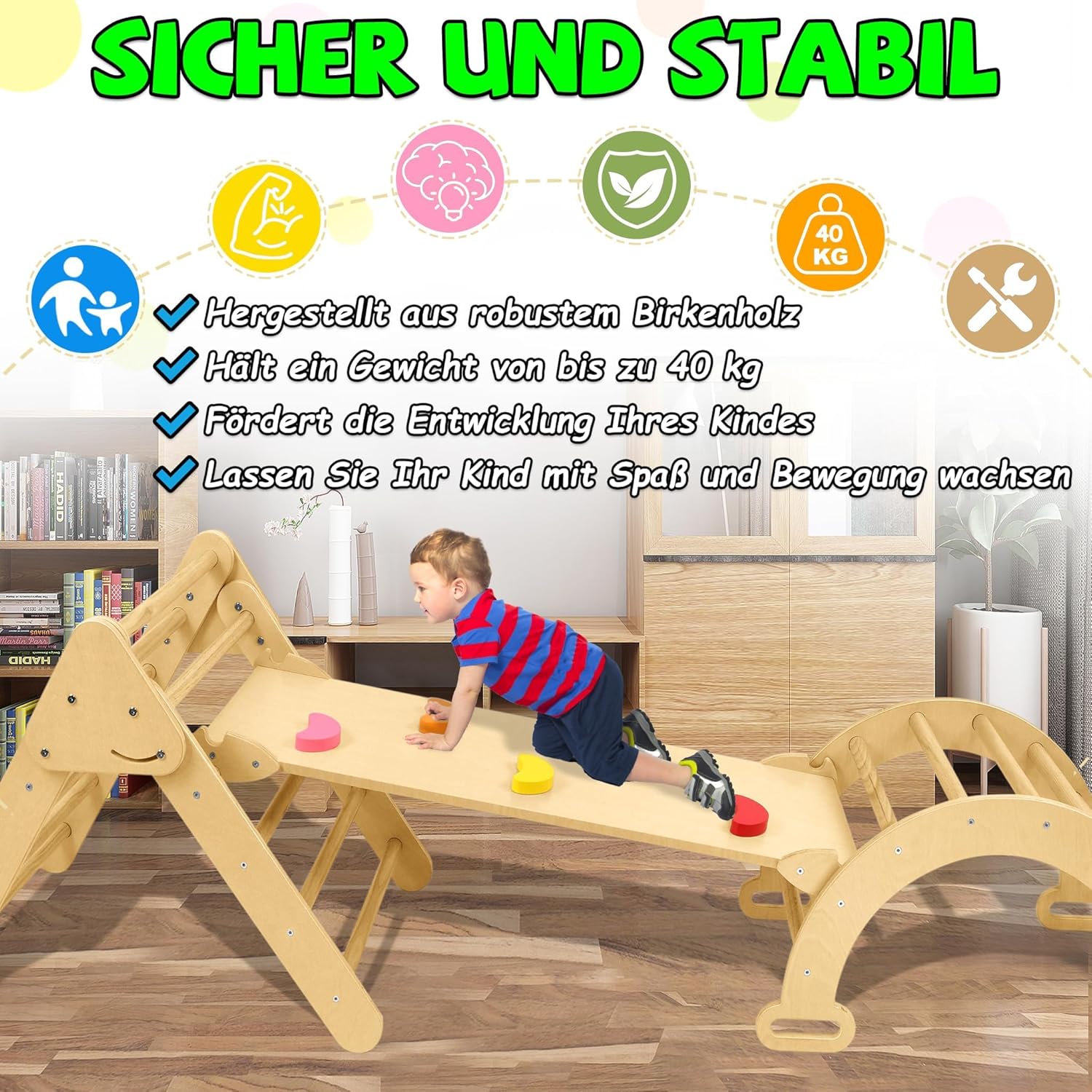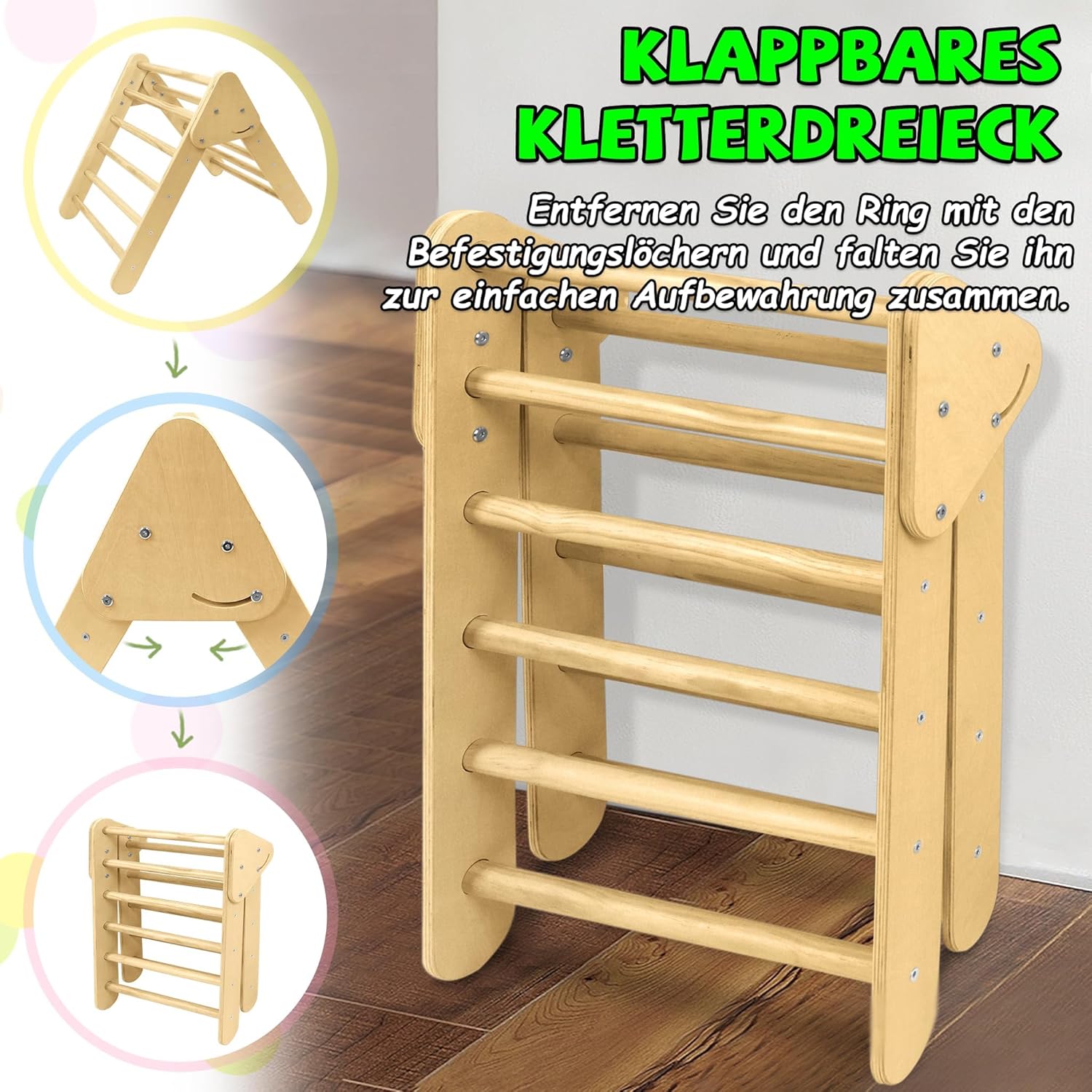 Triangolo da arrampicata realizzato con materiali di alta qualità: questa struttura per arrampicata per bambini è realizzata in legno di betulla naturale di alta qualità, robusto e con una superficie liscia, senza sbavature, levigata a mano, così liscia da non danneggiare mani o piedi. Ideale per far giocare i bambini nella sala giochi, in salotto o all'aperto. Design versatile: questa scala da arrampicata 3 in 1 è composta da un treppiede, un arco da arrampicata e una tavola da arrampicata (scivolo) per soddisfare le esigenze dei bambini di un attrezzo sportivo indoor. Le tre parti possono essere utilizzate insieme o separatamente per creare un piccolo parco giochi al coperto per il tuo bambino. Stimola lo sviluppo del tuo bambino: questa scala da arrampicata per bambini può promuovere lo sviluppo motorio e la capacità di concentrazione del bambino in modo giocoso e sicuro, migliorando efficacemente la creatività, il tono muscolare, la fiducia in se stessi, il senso di equilibrio e la mobilità del bambino, in modo che il bambino possa crescere in modo felice. Sicuro e stabile: la struttura da arrampicata 3 in 1 è certificata EN71-1-2-3-8 e soddisfa la certificazione UE per la sicurezza dei giocattoli. La struttura triangolare, le connessioni stabili e il robusto meccanismo garantiscono sicurezza generale, stabilità e durata con una portata massima di 40 kg. I 4 piedini a nuvola in dotazione possono essere montati sulla struttura di arrampicata e garantiscono una maggiore stabilità durante l'uso. Triangolo da arrampicata Montessori: il treppiede ha un design pieghevole con dimensioni da aperto di 76,5 x 55,5 x 57,5 cm (dimensioni piegate 69 x 55 x 21 cm) e può essere ripiegato per risparmiare spazio quando non in uso. Le dimensioni dell'arco da arrampicata sono 67,5 x 41,5 x 37 cm. La tavola da arrampicata reversibile (scivolo) misura 101 x 36 x 6,5 cm e può essere convertita in uno scivolo o in una tavola da arrampicata.