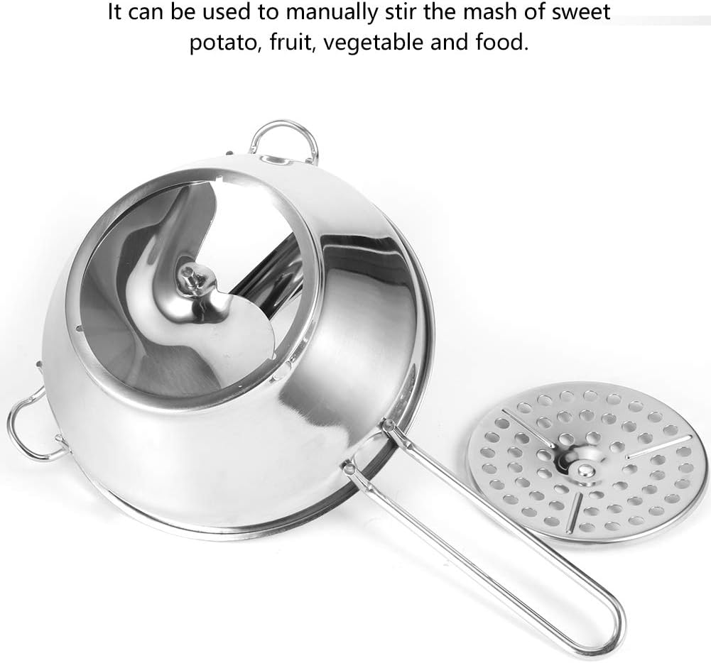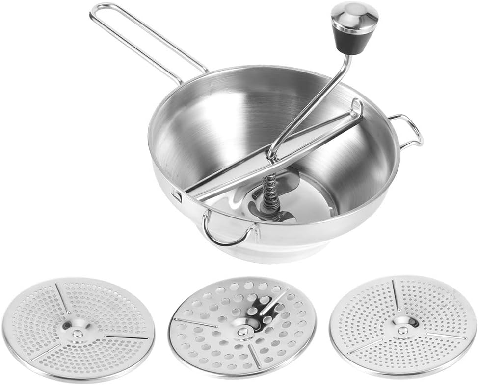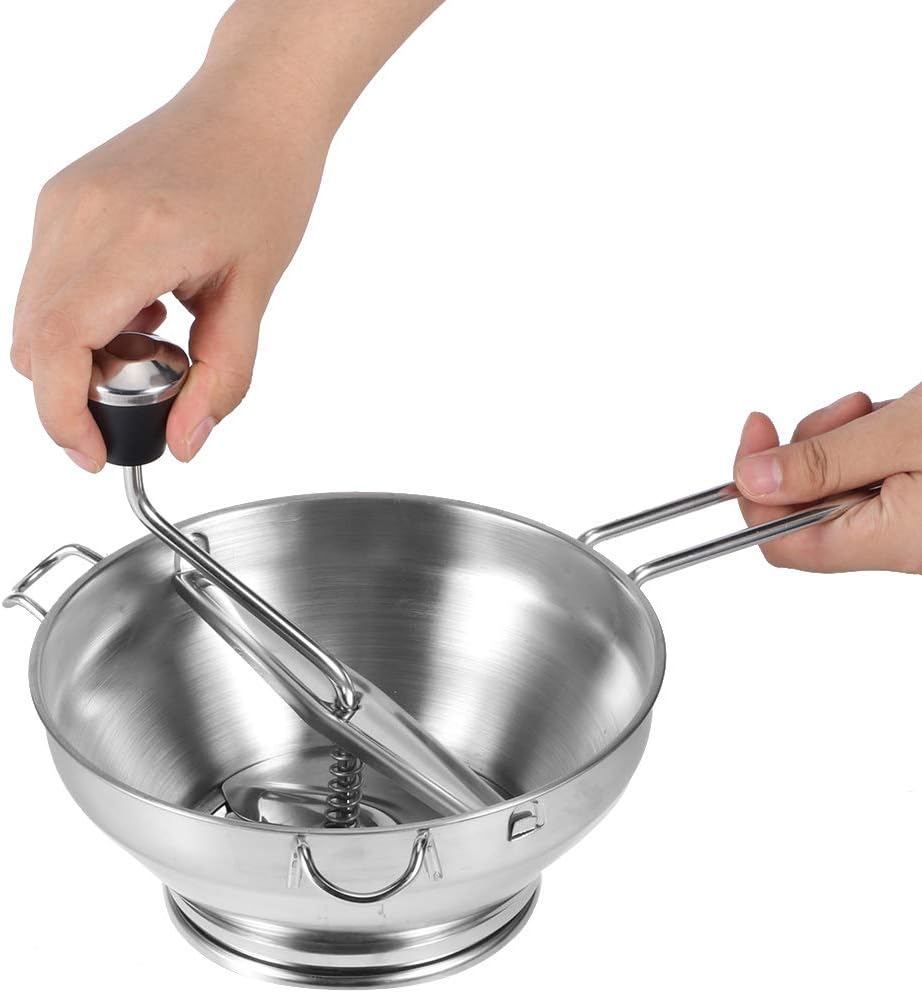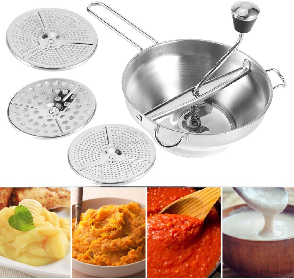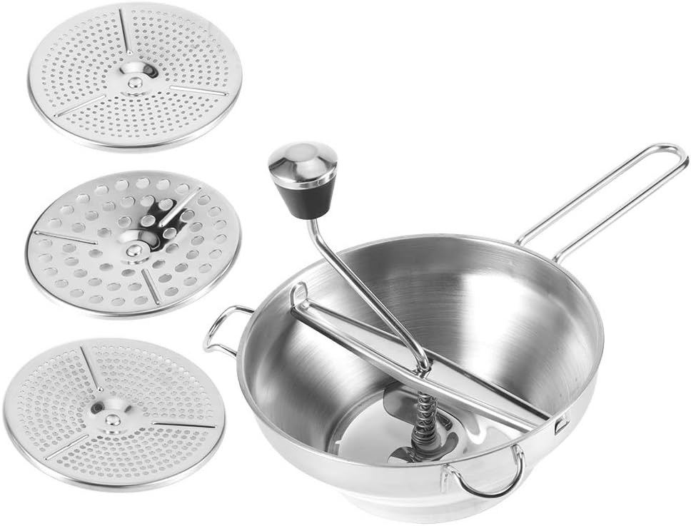 [Utilizzo multiuso] Ideale per schiacciare manualmente patate dolci, frutta, verdura e altri alimenti. [Tre dischi intercambiabili] Passa facilmente dalla consistenza fine, media e grossolana preparazione versatile del cibo. [Design confortevole] Impugnatura ergonomica presa , perfetta sia per l'uso manuale che meccanico. [Qualità Premium] Realizzato in acciaio inossidabile alimentare antiruggine maggiore durata e aspetto elegante. [Estrazione efficiente del succo] Presenta foro di perdita per flusso e una separazione regolari del succo.