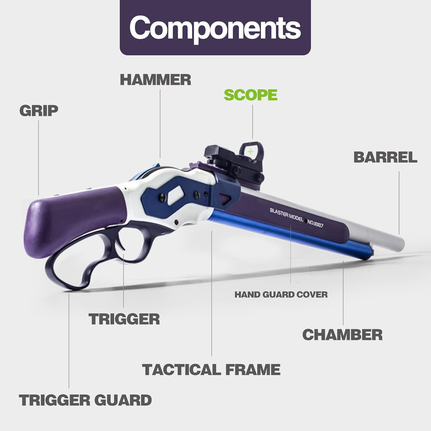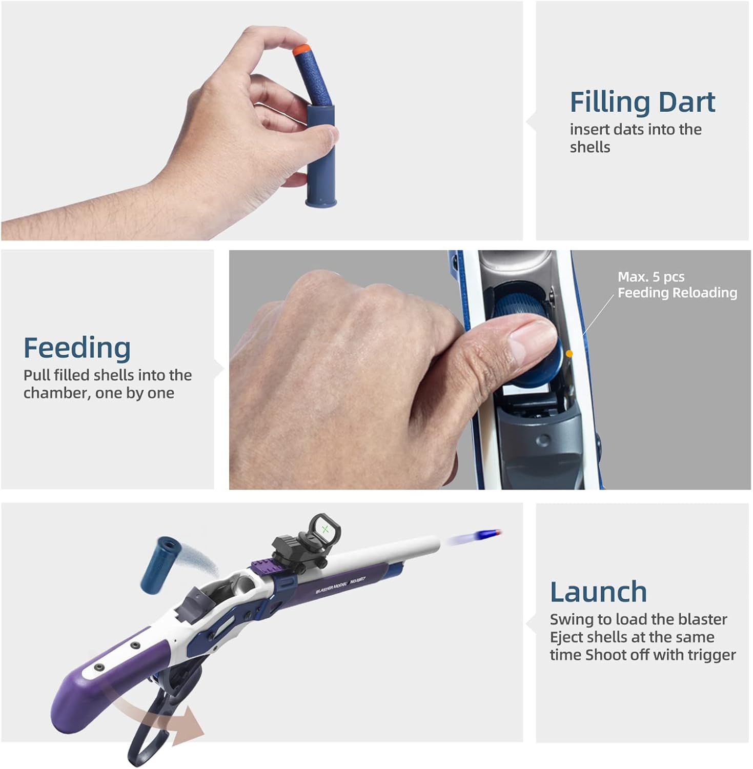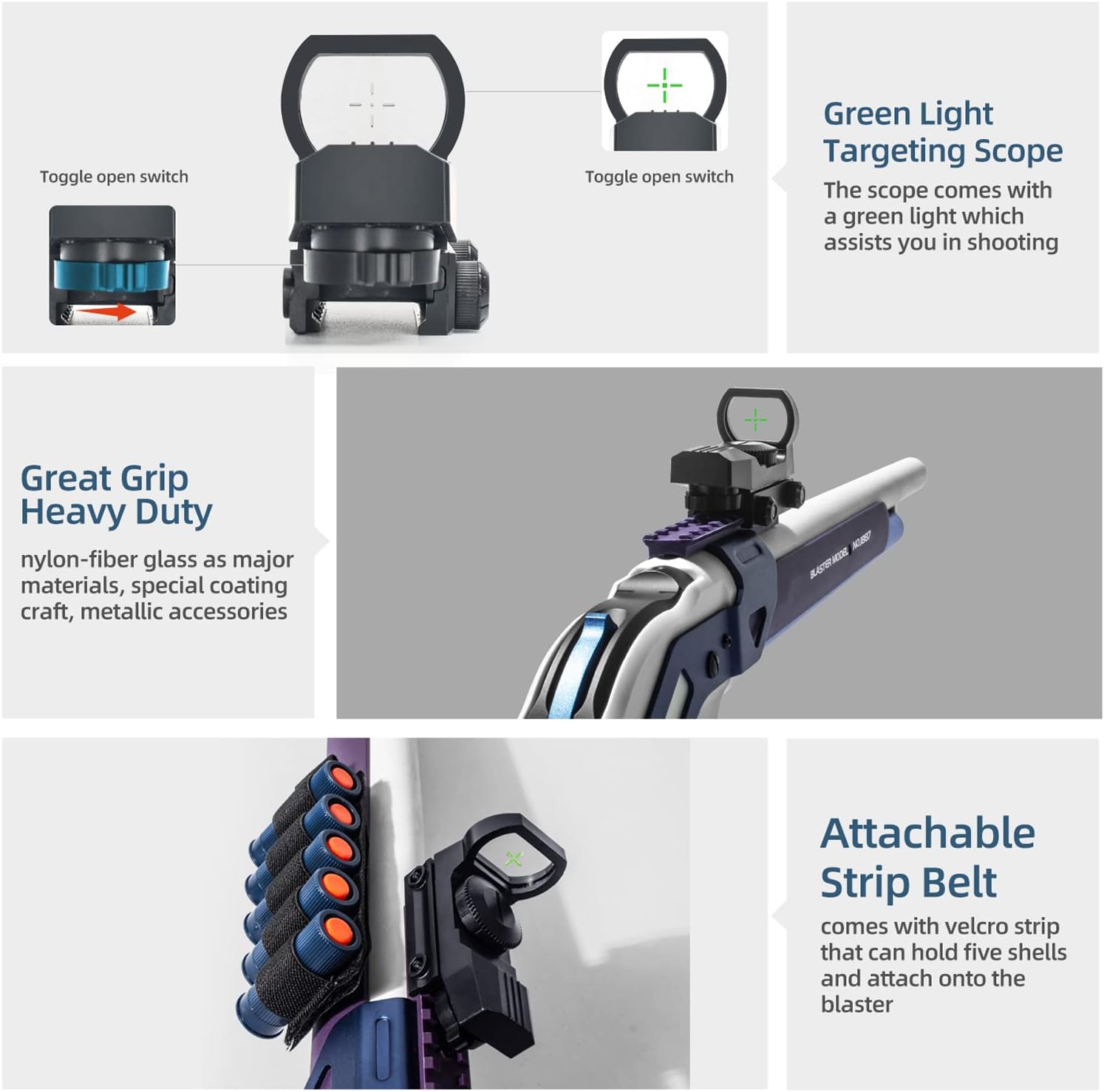 Caratteristiche: espulsione conchiglia, azione a leva, utilizza dardi in morbida schiuma, viene fornito con un'intera varietà di accessori, scatola regalo. Facile da usare: il lancio del dardo si basa sull'azione della pompa. Non c'è bisogno di usare le batterie. 1) caricare le cartucce nella camera, 2) armare la pistola giocattolo facendo leva sul paramano ed espellendo il bossolo; 3) premere il grilletto per sparare. Tutto in uno Playkit: il pacchetto viene fornito con blaster in schiuma giocattolo * 1, google protettivo * 1, freccette in schiuma * 30, conchiglie * 10,ambito*1,striscia di conchiglia in velcro*1,cinturino da polso*1. Gioca in modo sicuro e divertente: rivestimento viola e bianco brillante sulla superficie esterna, che indica chiaramente la sua caratteristica del giocattolo per un'identificazione sicura. Il playkit blaster in schiuma giocattolo soddisfa gli standard di sicurezza dei giocattoli ASTM CPSIA. Compatibile con le freccette in schiuma morbida delle principali marche, rendendo ogni tiro divertente, con buone prestazioni e assolutamente sicuro. Resistente e durevole: il fucile giocattolo è realizzato in misto nylon-fibra di vetro e poche parti sono in metallo, questa buona selezione di materiali e una produzione dedicata rendono questo blaster in schiuma resistente e durevole.