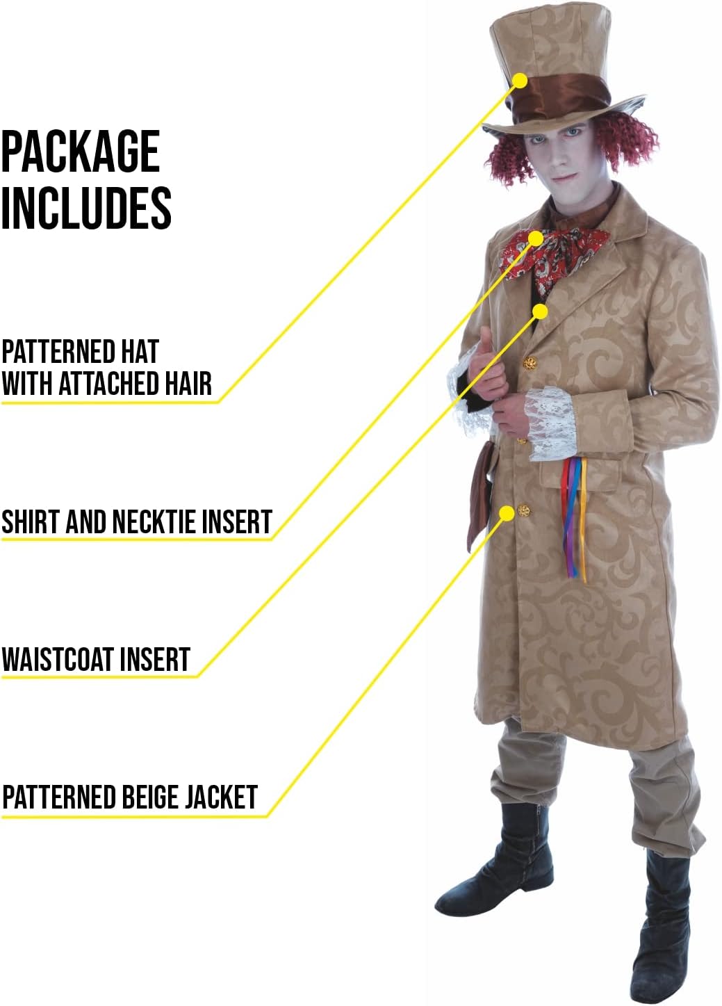 Include: una giacca fantasia beige e con inserto gilet incorporato, una camicia e colletto cravatta e un cappello fantasia abbinato con capelli attaccati. Questo costume per adulti è disponibile in taglia: M, L, XL. Usare l'immagine di riferimento per la misura delle taglie. Materiali di alta qualità, facile da indossare e resistente. La nostra Azienda è stata fondata nel 2009 da 3 amici appassionati di costumi. Abbiamo uffici in USA, UK ed Europa con centinaia di design che rispettano il massimo degli standard di qualità. Perfetto per vestito cappellaio matto adulto, vestito cappellaio matto uomo con giacca cappellaio matto e cappello cappellaio matto allegato con parrucca cappellaio matto, vestito carnevale cappellaio matto uomo, cappellaio matto vestito Costume confortevole per tutto il giorno: materiali leggeri, elastici e traspiranti che lo rendono facile da indossare, togliere e divertente. Le cuciture rinforzate offrono resistenza superiore, sia all'aperto che al chiuso. Lavare solo a mano.