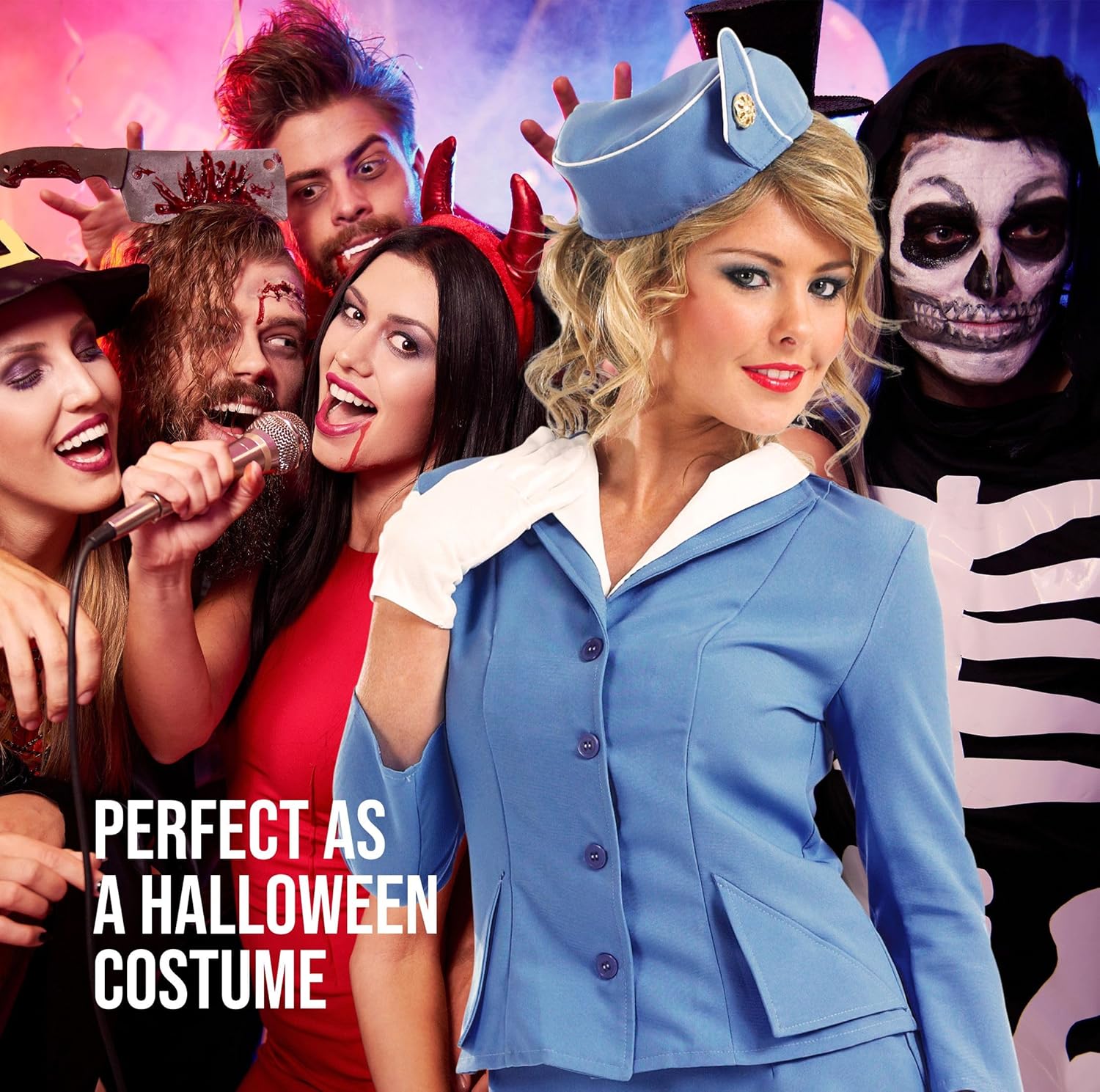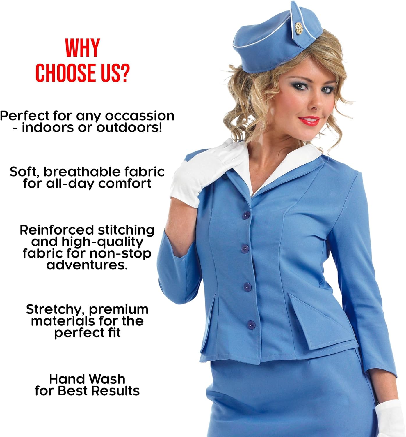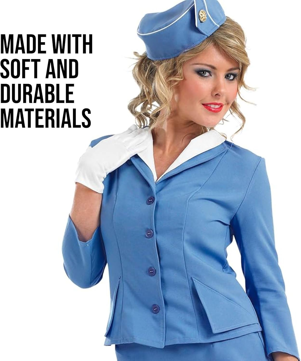 Include: una gonna e una giacca blu abbinate con camicia incorporata, un cappello e guanti. Questo costume per adulti è disponibile in taglia: S, M, L, XL, XXL. Usare l'immagine di riferimento per la misura delle taglie. Materiali di alta qualità, facile da indossare e resistente. La nostra Azienda è stata fondata nel 2009 da 3 amici appassionati di costumi. Abbiamo uffici in USA, UK ed Europa con centinaia di design che rispettano il massimo degli standard di qualità. Perfetto Costume Hostess Donna per Carnevale. Vestito Hostess con Cappello, Costume da Assistente Volo. Ideale per Cosplay Adulti e Travestimento Adulto. Vestiti Carnevale Donna, Costume Hostess Blu Donna, Cappellino Hostess. Costume confortevole per tutto il giorno: fatto con materiali leggeri, che rendono facile indossarlo e muoversi. Le cuciture rinforzate offrono resistenza superiore, per eventi all'aperto e al chiuso. Lavare solo a mano.