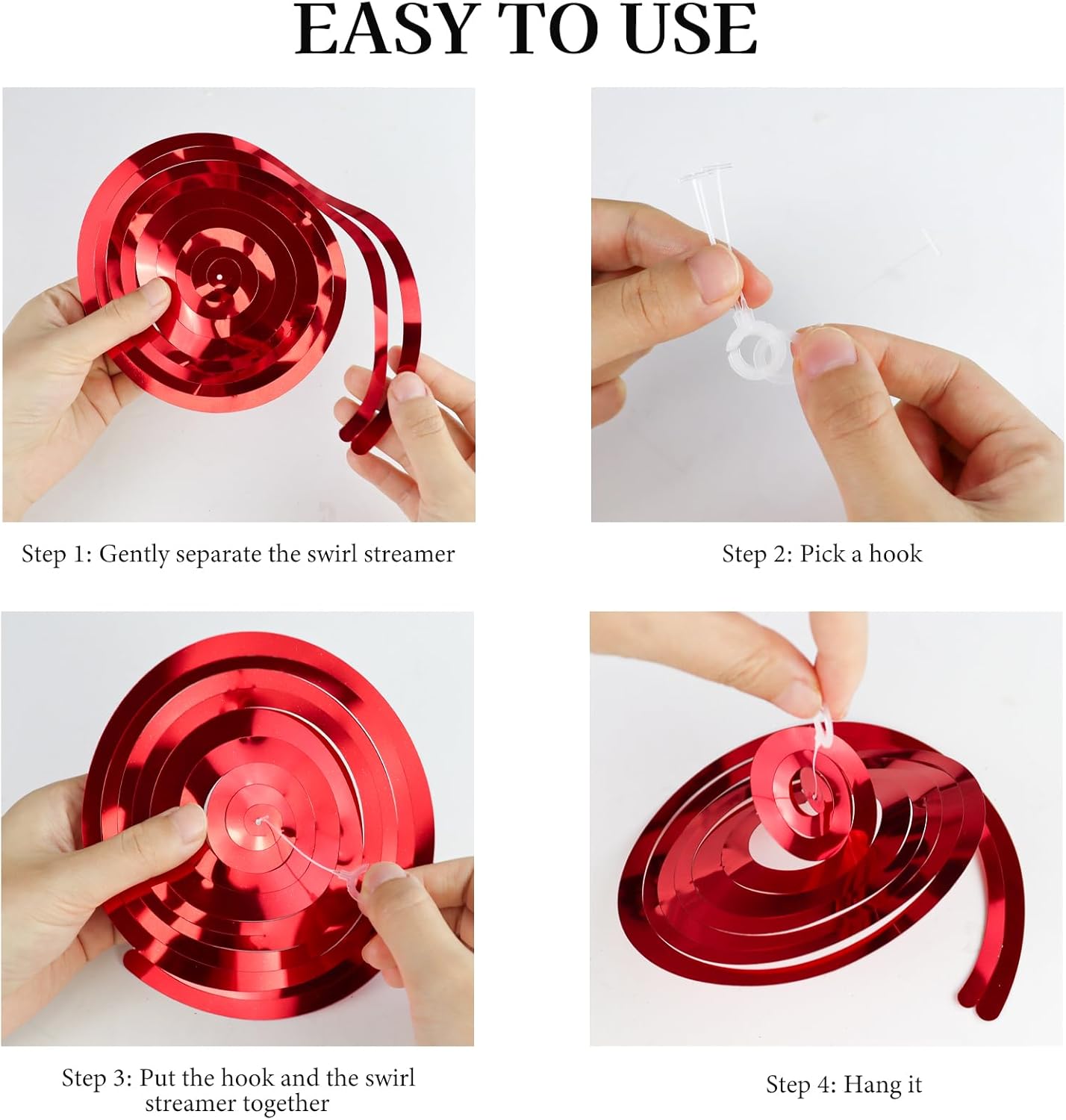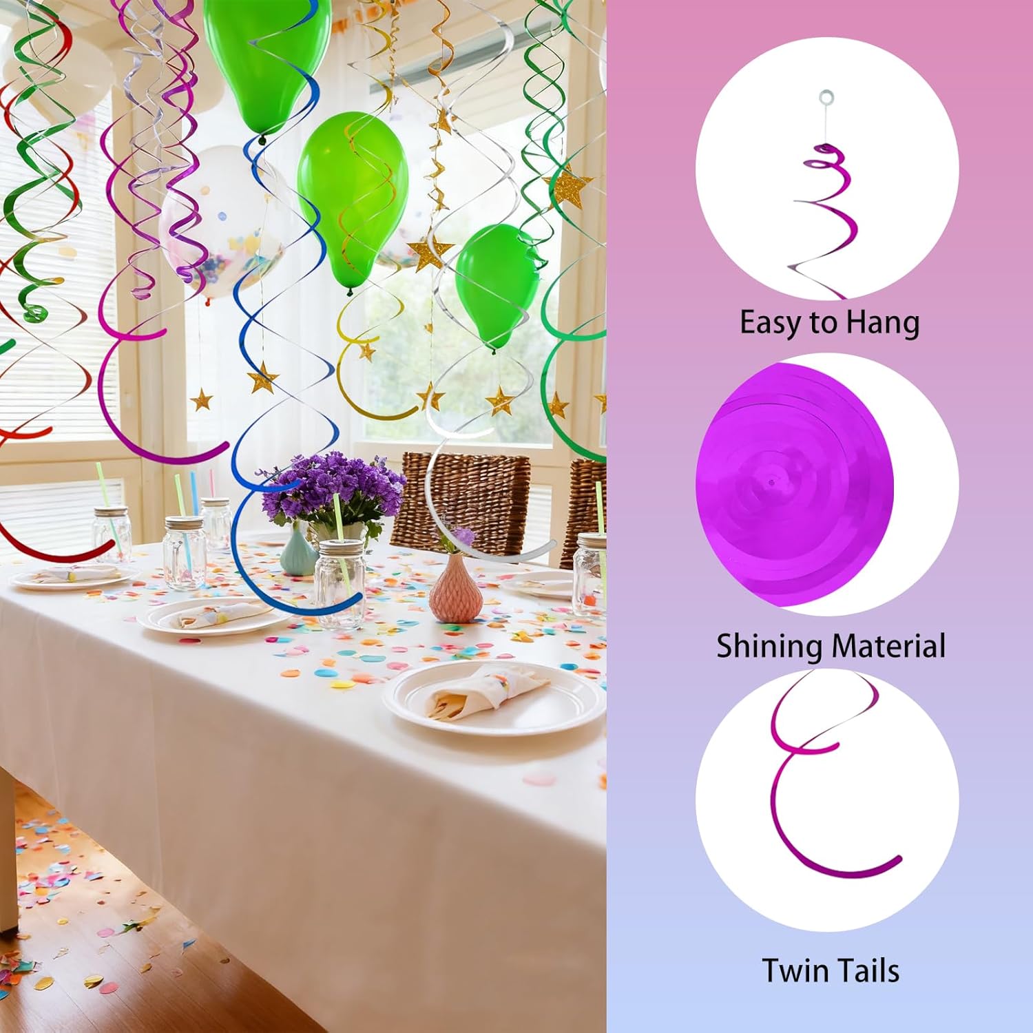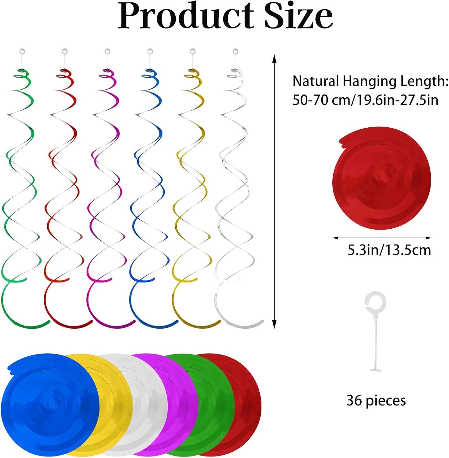 Cosa ottieni: riceverai 36 decorazioni per feste a forma di stelle filanti, che soddisfano al meglio le tue esigenze di decorazione. Ogni ciondolo ha un diametro di circa 14,5 cm e una lunghezza naturale di circa da 50 a 70 cm Materiali: queste decorazioni da soffitto sono realizzate in PVC resistente, leggero, flessibile e resistente alla luce. Inoltre, può essere riutilizzato se conservato correttamente. (Nota: non utilizzare questi streamer Swirl come giocattoli e tenerlo lontano da fiamme libere per evitare incidenti Lucentezza metallica: questa decorazione da soffitto sospesa è caratterizzata da una ricca e brillante lucentezza metallica. Quando è illuminata dalla luce o dalla luce del sole, riflette diversi colori, attira l'attenzione delle persone e crea un'atmosfera allegra che aggiunge fascino alla tua festa o evento Facile da installare: queste decorazioni da appendere sono facili da installare. Ogni tubo dell'aria viene fornito con un gancio trasparente. Basta far passare il gancio attraverso il piccolo foro rotondo sul tubo dell'aria per appenderlo. Si può appendere a soffitti, pareti, cortili, cancelli e altri luoghi per creare un'atmosfera di festa Multiuso: queste decorazioni per feste da appendere sono incredibilmente versatili e sono perfette per celebrazioni, bar, eventi promozionali, lauree, feste di compleanno, eventi a tema, Natale e molto altro ancora. Sono una scelta eccellente sia per decorazioni per feste che per eventi