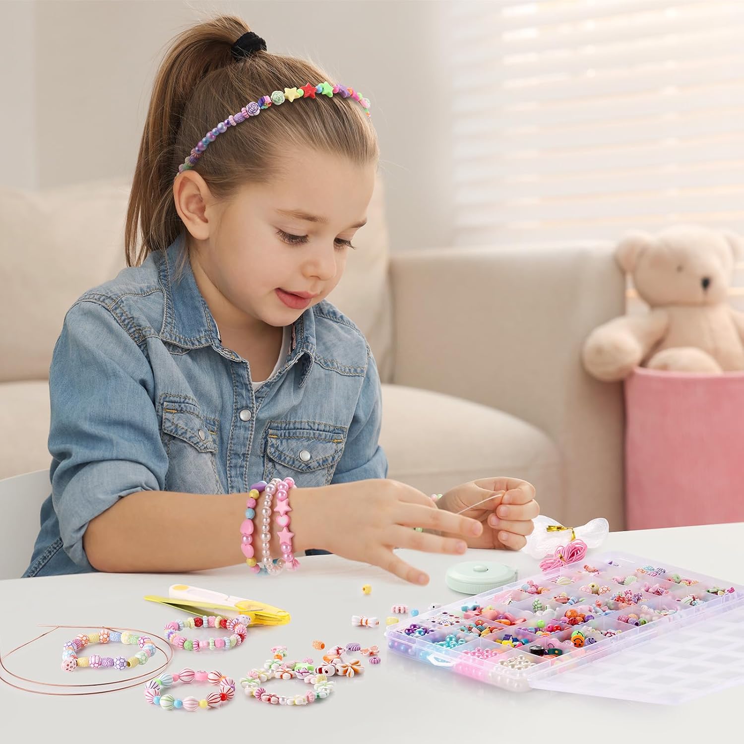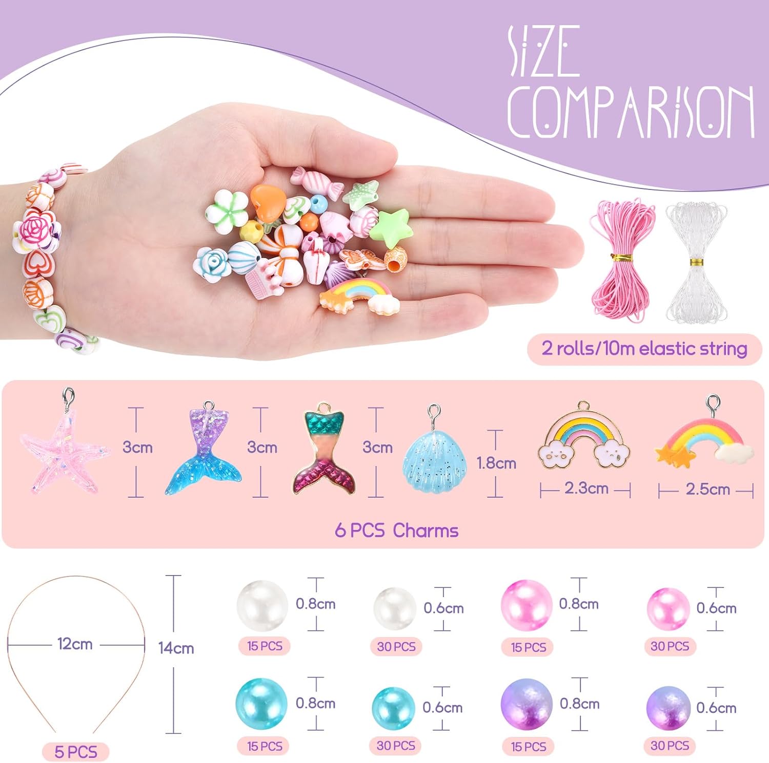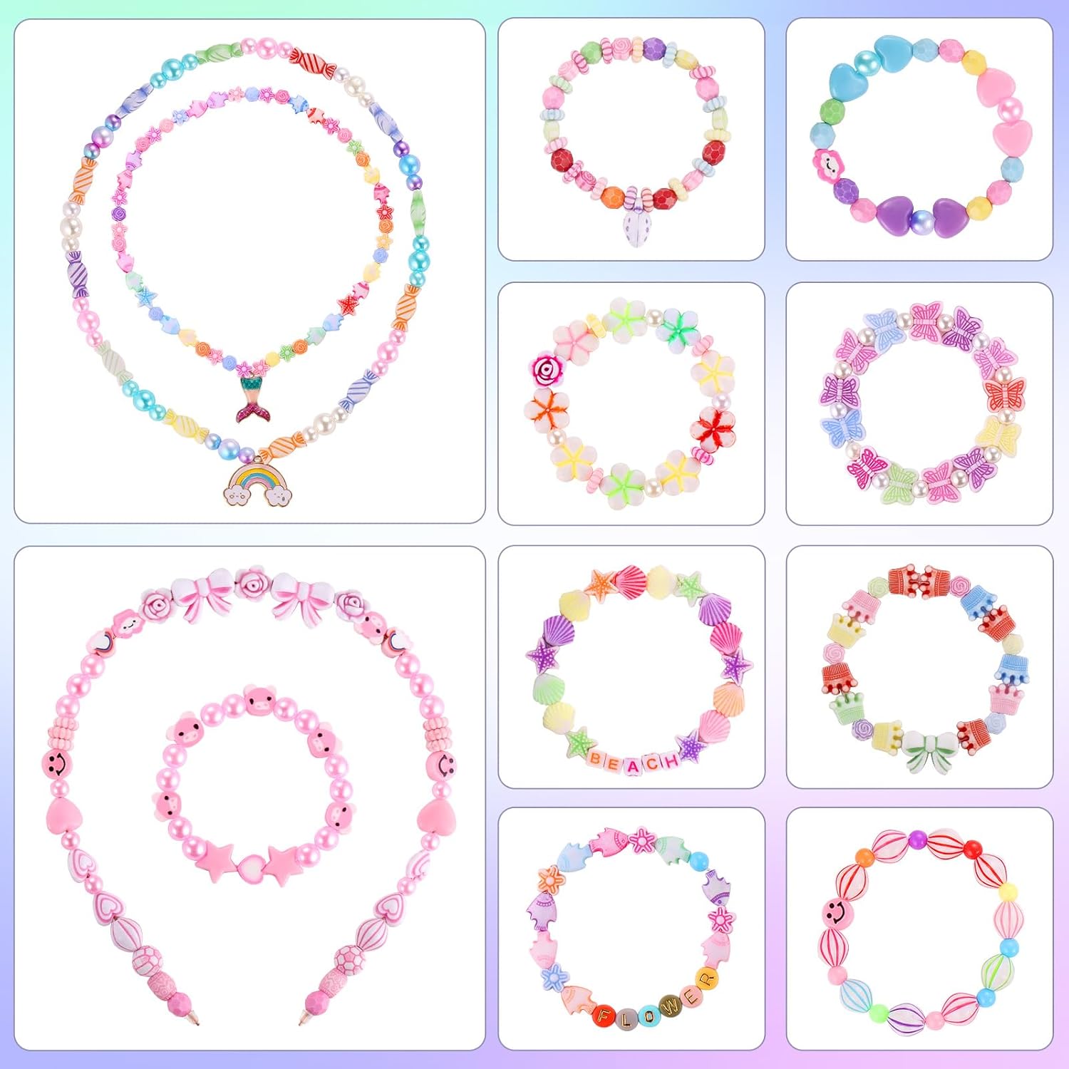Kit per creare gioielli con perline da 795 pezzi: il kit per creare gioielli contiene 795 perline arcobaleno di diversi modelli, disposte in una scatola con 32 griglie. Il kit comprende: fiori, caramelle, farfalle, pesci, perline da 0,6-0,8 cm, lettere, stelle, cuori, conchiglie, corone, perline tonde, perline di animali in argilla polimerica, una faccina sorridente, 6 ciondoli della serie Sirena, 5 cerchietti per tua figlia e 2 rotoli di cordino elastico. Materiale sicuro e durevole: il kit per realizzare braccialetti è realizzato con materiali di alta qualità, sicuri per i bambini. Le perle sono di plastica, leggere e lisce. Le perline e gli accessori non presentano sbavature e hanno bordi lisci per evitare lesioni alle mani dei bambini. Resistono bene allo sbiadimento, quindi puoi indossare i tuoi modelli comodamente in spiaggia o in piscina. Stimola l'immaginazione e la creatività: questo kit di gioielli fai-da-te comprende 32 tipi di perline e accessori pendenti, che puoi combinare liberamente secondo le tue idee fai-da-te. Puoi creare molti gioielli unici o oggetti artigianali da indossare, come braccialetti dell'amicizia, fasce per capelli, collane, braccialetti con ciondoli per il tuo telefono, ecc. Regalo per bambini e appassionati di artigianato: il kit per creare braccialetti può essere utilizzato per realizzare braccialetti, è un regalo perfetto per bambini, famiglia, amici intimi e te stesso. Questa attività fai da te al chiuso ti consente di trascorrere del tempo con i tuoi bambini mantenendoli attivi e concentrati e stimolando la loro creatività e immaginazione. Interazione genitore-figlio: il set di perline colorate è adatto a bambini e adulti. Stimola la creatività dei bambini, migliora la coordinazione occhio-mano e rafforza la loro concentrazione. Allo stesso tempo, ti aiuta a goderti il divertimento e i risultati del fai-da-te e ad alleviare lo stress e l'ansia.