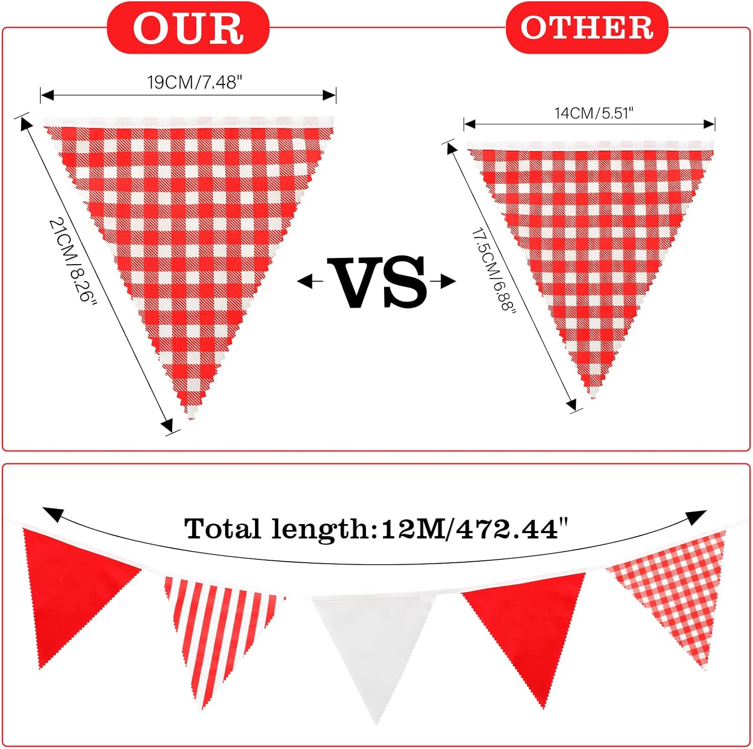 【Molto ben fatto】 La ghirlanda in tessuto è ben realizzata con un tessuto bello e robusto. . Su entrambe le estremità della ghirlanda sono cuciti robusti nastri per appenderla. 【I colori sono belli e forti】 La catena di gagliardetti in tessuto è sufficientemente lunga a 12 metri, ha 42 gagliardetti (stampati su un lato) nei colori rosso e bianco e i gagliardetti sono sempre colorati alternativamente. Che ci siano abbastanza gagliardetti lungo tutta la lunghezza. 【Catena di gagliardetti riutilizzabile】I gagliardetti sono realizzati in tessuto e sono anche abbastanza robusti, possono essere facilmente puliti in lavatrice. Colori vivaci, bellissimi gagliardetti adatti ad ogni occasione, molto adatti per decorare la stanza, feste o per la fotografia. Facile da fissare: a sinistra e a destra c'è abbastanza corda (circa 0,5 metri su ciascun lato) per fissare correttamente la stamina. Bellissimi gagliardetti come decorazione per la cucina, sul letto dei bambini o ai matrimoni. 【Adatto per ogni occasione】 La ghirlanda in tessuto è adatta a molte cerimonie, come Natale, feste di compleanno e feste di beneficenza, estremamente perfetta per le camerette dei bambini. Può essere utilizzato come parte di un tea party o di una decorazione di nozze. Ottima decorazione per feste di compleanno per bambini, cerimonie scolastiche, feste all'asilo