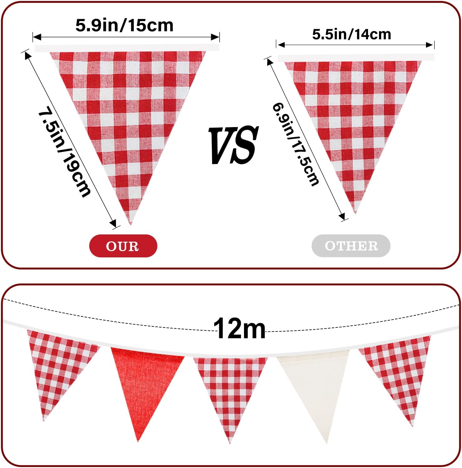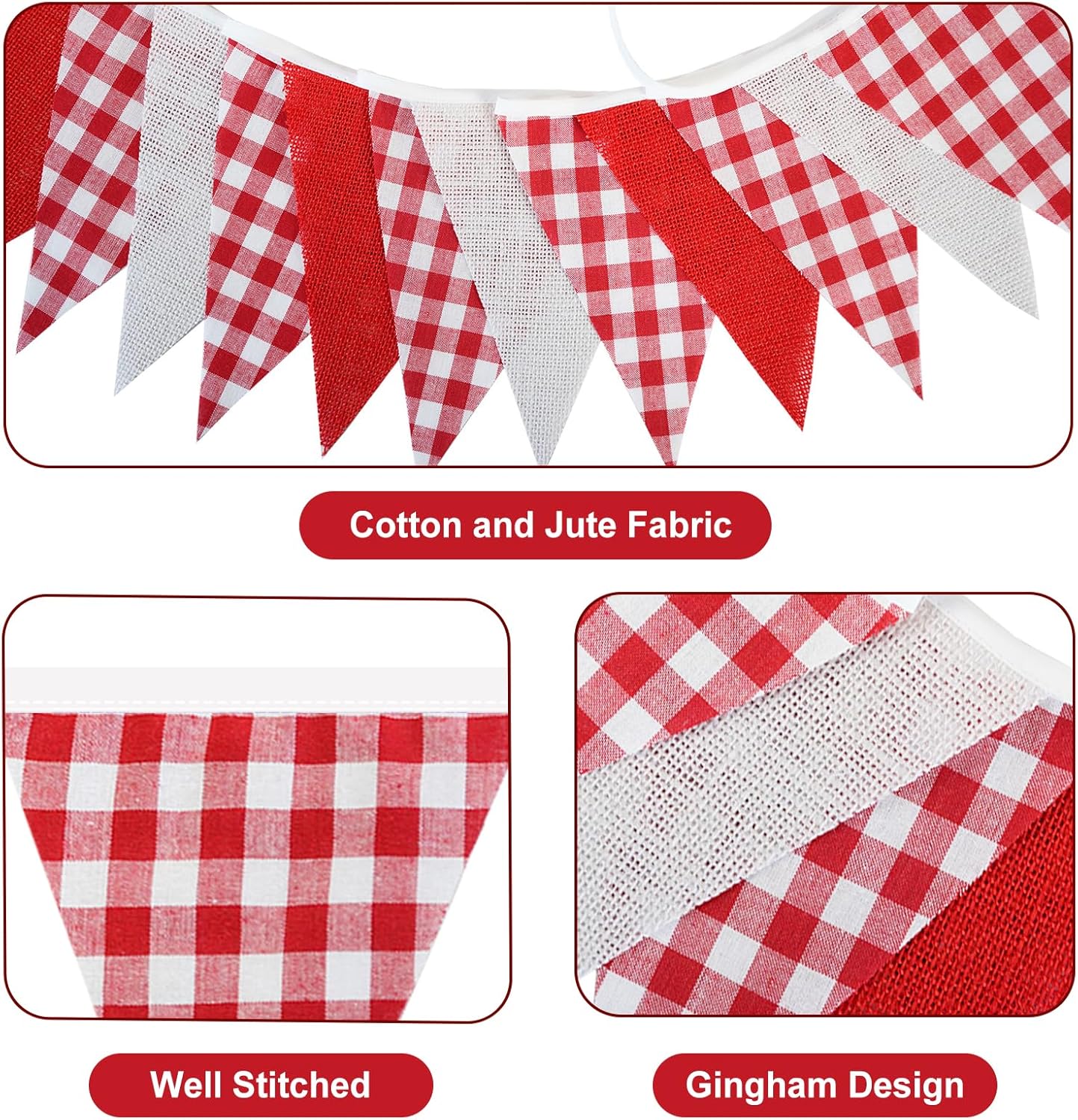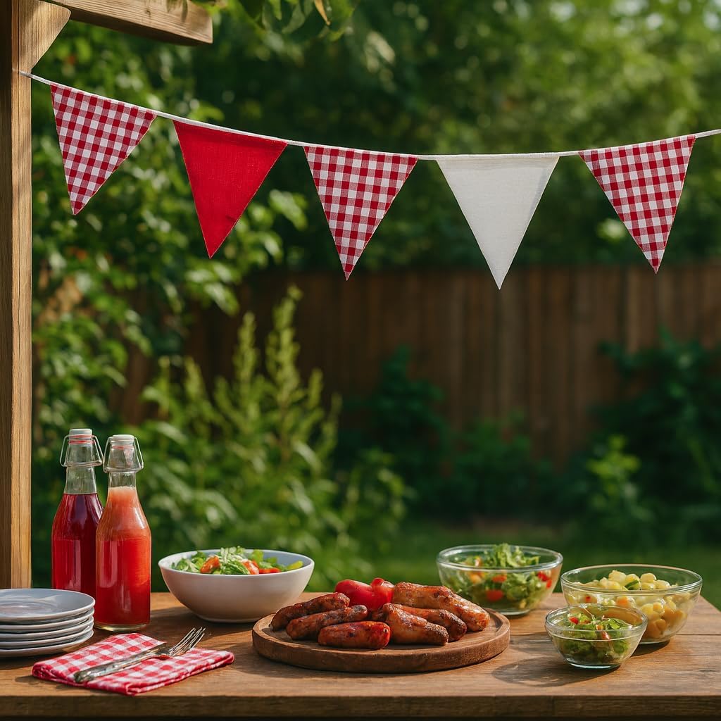 Dimensioni della catena dello stendardo: la catena dello stendardo è lunga 10 metri e ha 36 stendardi pastorali a doppia faccia rossi e bianchi (ciascuno 15*19 cm) ideali per compleanni di bambini ed eventi familiari. Design unico delle ghirlande: la catena di gagliardetti è progettata con gagliardetti a scacchi alternati e gagliardetti in tinta unita. La combinazione di rosso e bianco è luminosa e delicata. Servono come decorazioni murali e si abbinano a tavoli da pranzo in legno, stoviglie in ceramica bianca e piante verdi per creare una calda atmosfera da pranzo. Versatilità: la bandierina rossa e bianca è realizzata in corda di puro cotone e può essere facilmente attaccata ad entrambe le estremità, riutilizzabile per le bancarelle del mercatino di Natale, i festival estivi o la decorazione del balcone. Facile da abbinare: i gagliardetti a scacchi sono realizzati in cotone e i gagliardetti a tinta unita sono realizzati in lino. Grazie alla loro durata e degradabilità, le catene di gagliardetti sono perfette per picnic all'aperto, feste in giardino o decorazioni per tendoni della birra (adatte per l'Oktoberfest!) Scene applicabili: catena di gagliardetti a scacchi rossi e bianchi Ideale per balconi, giardini o tradizionali tendoni della birra nei festival all'aperto. Può essere utilizzato anche in soggiorni e uffici per creare un'atmosfera accogliente.