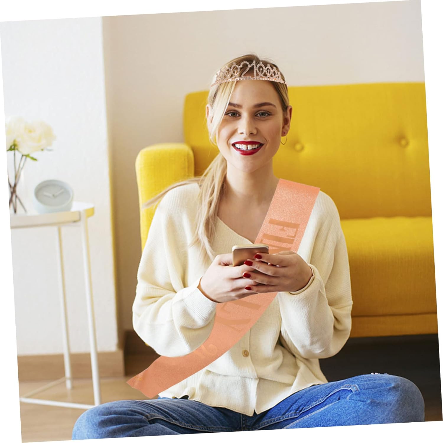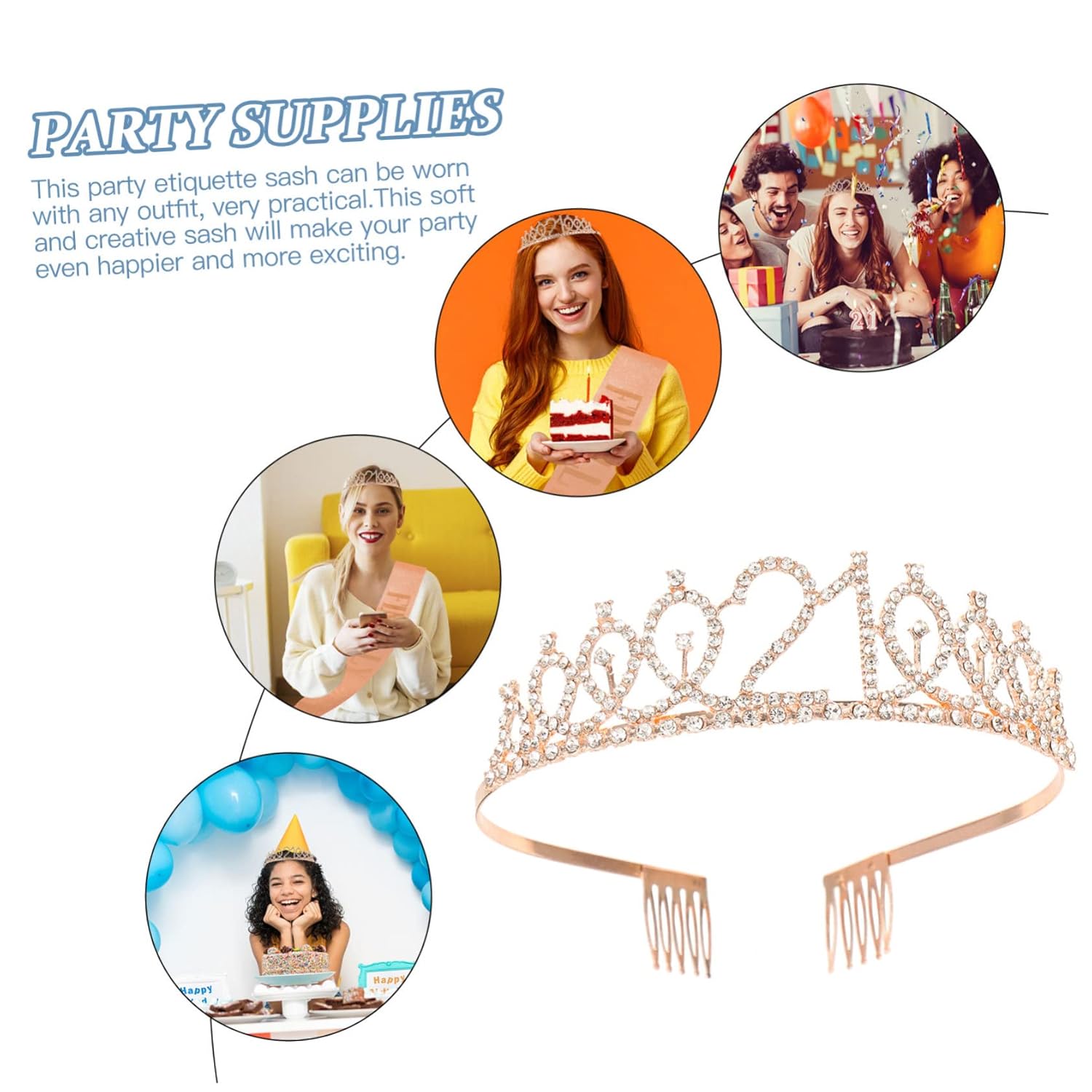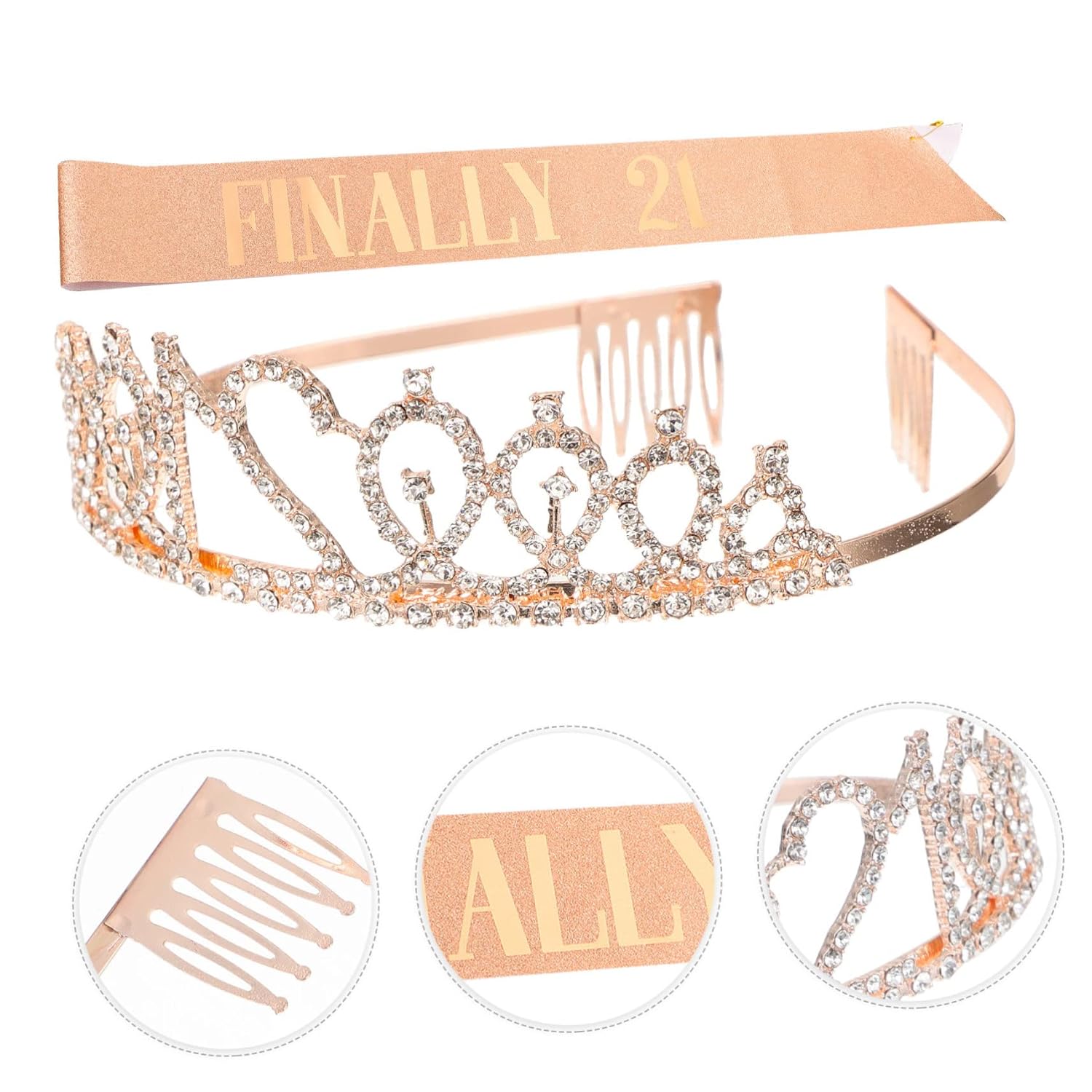 Decorazioni per il 21° compleanno per lei - Realizzati con materiali di alta qualità, questi oggetti di scena per le feste sono comodi da indossare, non graffiano la pelle e sono super confortevoli. Puoi attirare l'attenzione degli altri nel giorno del tuo compleanno. Miglioreranno l'atmosfera della festa e porteranno più gioia alle persone. Articoli per feste - Realizzati in tessuto glitterato e lamina oro rosa pressata a mano, si abbinano a qualsiasi outfit e durano tutto il giorno fino alla notte. Viene fornito con una spilla da balia dorata in modo da poter personalizzare la dimensione. Fascia per il 21° compleanno: realizzata in materiale resistente per un uso duraturo. Tiara con strass per compleanno: puoi regolare la lunghezza della fascia sulla spalla utilizzando una spilla. Fascia di compleanno: può essere un regalo meraviglioso per gli amici che stanno organizzando una festa di compleanno.
