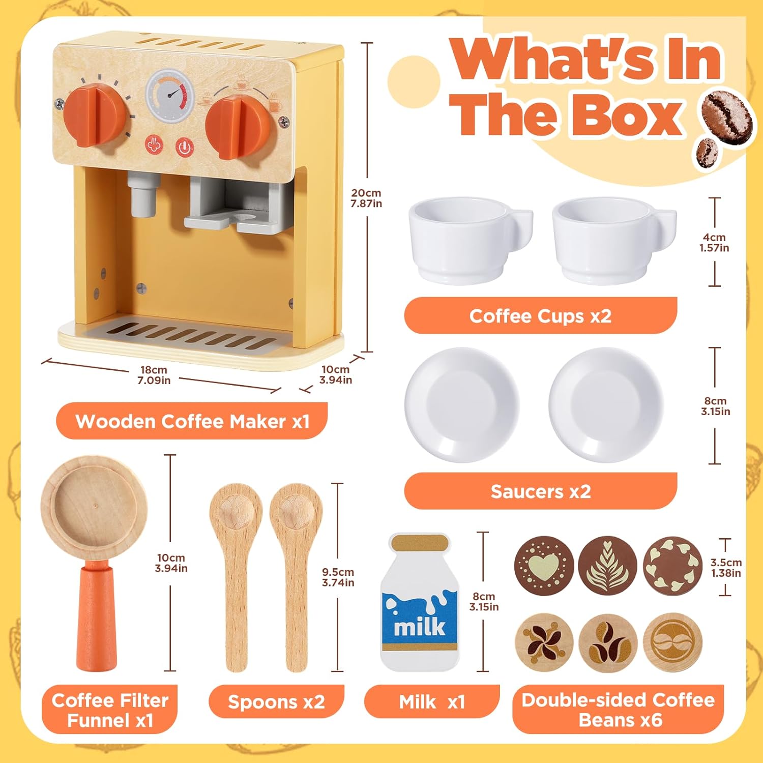 Vera macchina da caffè per bambini in legno: la macchina da caffè per bambini di GAGAKU in legno robusto di alta qualità invita al gioco di ruolo creativo. Perfetto accessorio da cucina per bambini in legno per piccoli baristi per preparare il caffè e servire i genitori. Promuove lo sviluppo attraverso il gioco: questo giocattolo educativo favorisce le abilità motorie, la coordinazione occhio-mano e l'apprendimento sociale. Ideale per la pedagogia Montessori e un giocattolo educativo in legno per bambini dai 3 anni in su. Accessori da cucina sicuri per bambini: la nostra macchina da caffè per bambini è realizzata in legno laccato arancione brillante con angoli arrotondati e colori atossici secondo le norme di sicurezza europee (EN71). Set completo per la cucina dei bambini: il set contiene tutto il necessario per un'esperienza di gioco perfetta: macchina da caffè in legno per bambini, portafiltro, tazze, piattini, cucchiai, bricco per il latte e chicchi di caffè. L'accessorio completo per la cucina dei bambini. Il regalo perfetto: questa macchina da caffè completamente in legno è un regalo fantastico per i bambini per il compleanno, Natale o qualsiasi occasione. Incoraggia il gioco creativo e duraturo lontano dallo schermo.