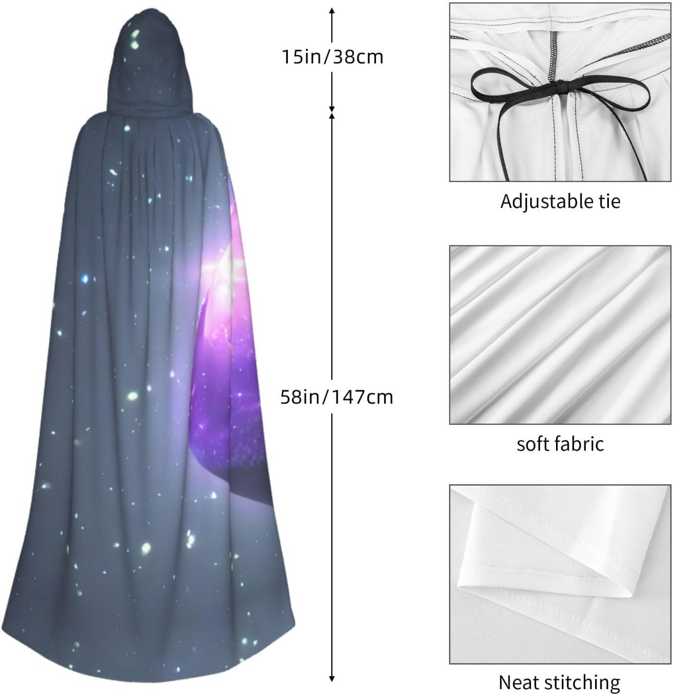 Entra nel mondo della fantasia e dell'avventura con il nostro elegante mantello da donna. Realizzato in fibra di poliestere di alta qualità, questo mantello offre una vestibilità leggera e confortevole, permettendoti di abbracciare i tuoi personaggi preferiti o personaggi per feste in costume, Halloween, fumetti e molto altro ancora. Dotato di un cappuccio oversize e una chiusura con cravatta, questo mantello non solo aggiunge un elemento di mistero, ma completa anche una vasta gamma di scelte di outfit La costruzione garantisce una lunga durata. Uso duraturo senza alcun fastidio o prurito. Che tu stia partecipando a una festa a tema, una danza o un evento cosplay, questo versatile mantello è sicuro di fare una dichiarazione. È perfetto per feste di Halloween, convegni di fumetti, spettacoli teatrali, feste in maschera e altre occasioni festive. Lascia che la tua creatività risplenda e immergiti nel mondo della fantasia. Pulire questo mantello è un gioco da ragazzi, Lavabile in lavatrice. Facile da pulire. Il suo design ti consente di godertelo per gli anni a venire, rendendolo una scelta affidabile ed elegante per tutte le tue esigenze di abbigliamento. Sperimenta l'incanto e il fascino del nostro elegante mantello da donna e diventa al centro dell'attenzione in ogni evento. Migliora il tuo gioco di costumi e crea ricordi indimenticabili con questo accessorio indispensabile. Abbraccia la tua immaginazione e intraprendi un viaggio straordinario oggi!