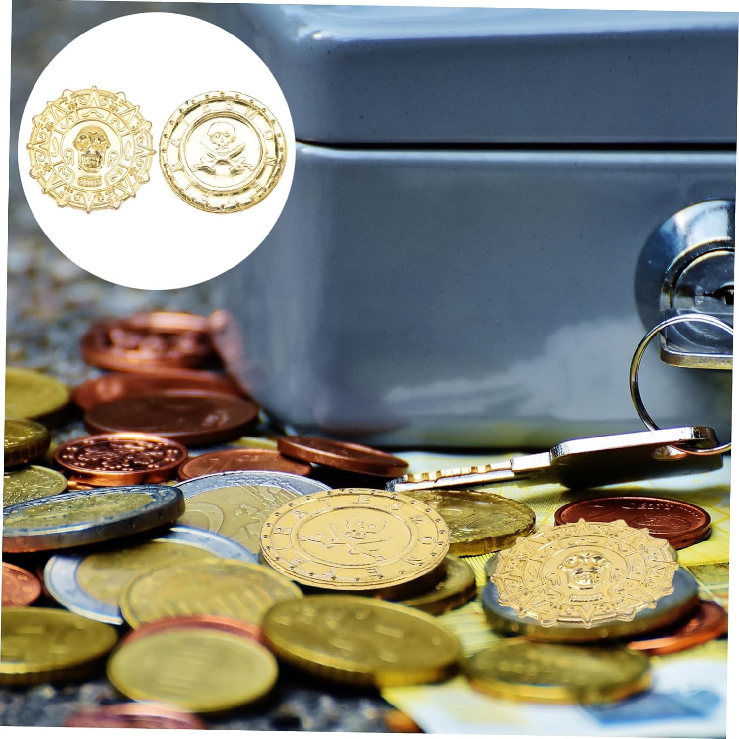 Monete intrattenimento: la quantità sufficiente può soddisfare tue esigenze per giochi o per la sostituzione, moneta Monete : la moneta è in colore , con un fantastico pirata in rilievo e un motivo, monete d' Monete in : l'ampia quantità può soddisfare tue esigenze decorazione e , Monete dei pirati - adatte per , decorazioni centrali, decorazioni per feste, scatole , portagioie, ecc., Monete pirata: possono essere utilizzate anche per decorazioni trappole o come premi per i ,