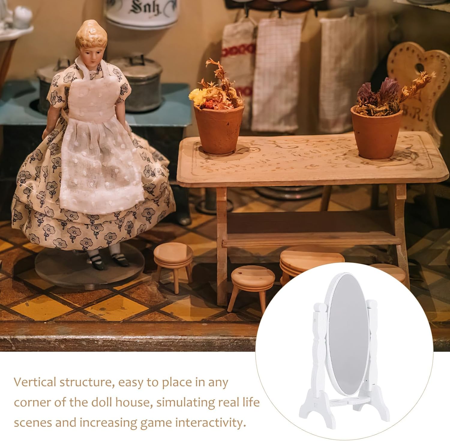 Fascino vintage: lo specchio compatto vintage offre un design senza tempo, aggiungendo un tocco di alla tua casa delle bambole e soddisfacendo i collezionisti amanti degli stili retrò Ideale per ambientazioni in miniatura: questo specchio retrò è progettato in scala 1:12, adatto a varie scene in miniatura, migliorando il realismo dei tuoi progetti fai da te Resistente e affidabile: realizzato in legno, questo specchio da toeletta in stile rustico è costruito per durare, mantenendo la sua forma senza deformarsi nel tempo Design indipendente: il piccolo specchio per il trucco è verticale, consentendo un facile posizionamento in qualsiasi angolo della tua casa delle bambole, creando spazi abitativi realistici e migliorando l'interazione durante il gioco Portatile e versatile: il mini specchio con cornice è leggero e facile da trasportare, il che lo rende ideale per vestirsi in modo creativo e per attività di gioco di ruolo per bambini e adulti