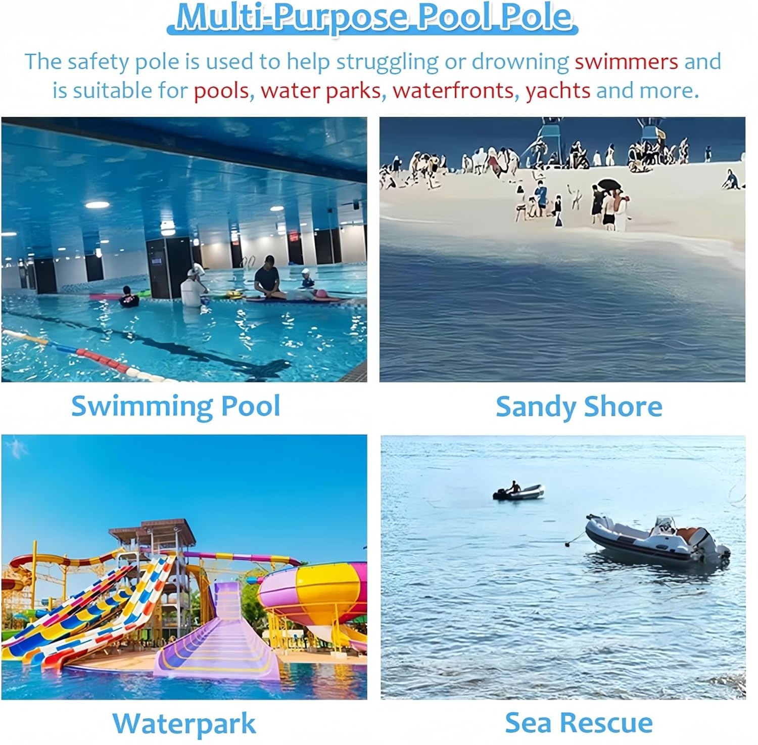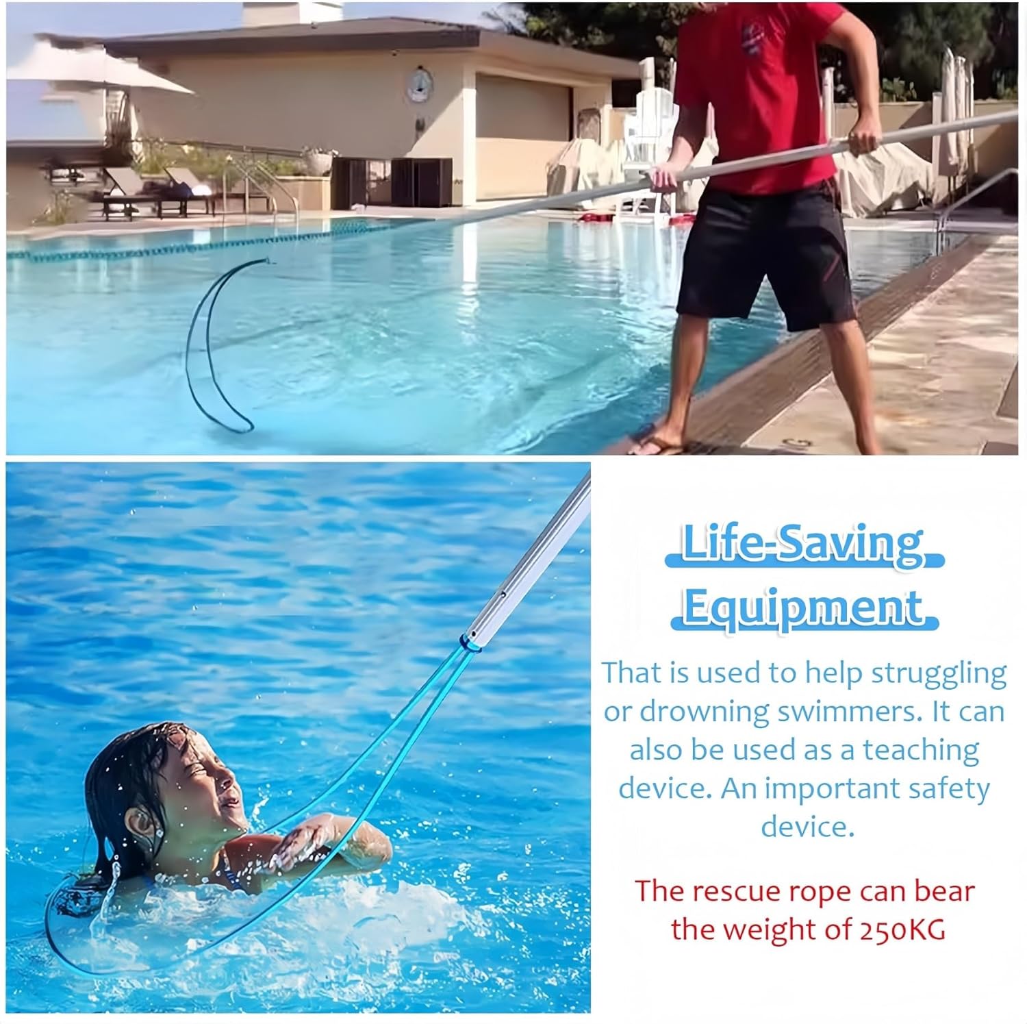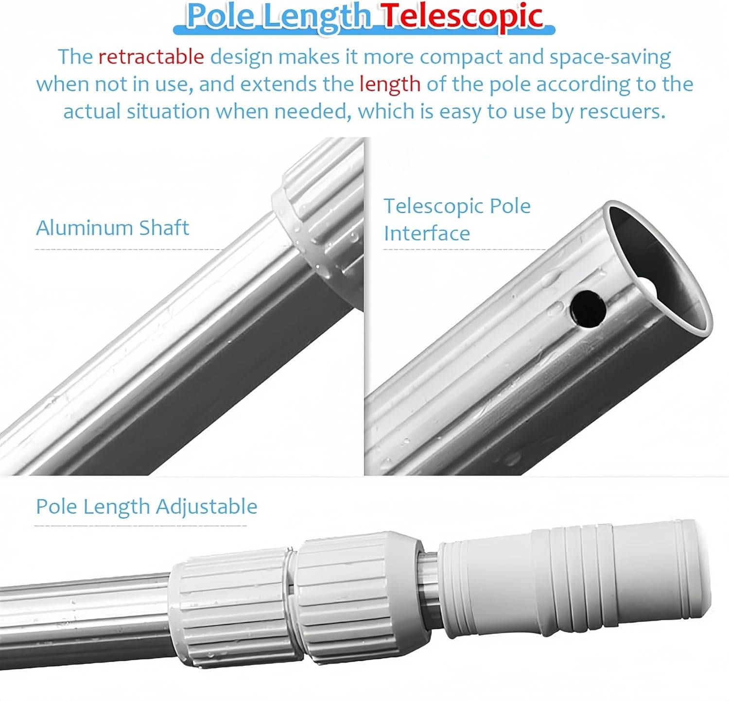 PRATICO & MULTIFUNZIONALE Il bastone di salvataggio è piccolo, leggero e facile da manovrare. Può essere appesa a un gancio o riposta in una credenza della piscina, in modo che sia sempre a portata di mano quando necessario. Oltre alla sicurezza, è anche lo strumento perfetto per pescare vestiti e altri rifiuti. SALVATORE PER LA PISCINA: Poiché l'estate è la stagione delle frequenti attività acquatiche, la sicurezza in piscina e in acqua è una priorità assoluta. Il gancio di sicurezza per piscina non solo si estende facilmente alla lunghezza desiderata, ma può anche aiutarti in qualsiasi situazione. Ovunque ti trovi in acqua, tutto ciò che devi fare è chiedere aiuto ai tuoi soccorritori e possono facilmente tirarti fuori dall"acqua con questo gancio di salvataggio. Gancio di sicurezza in alluminio per PISCINA: il gancio di sicurezza per piscine è realizzato con materiali in alluminio che resistono alle difficili condizioni della piscina. È resistente, robusto e durerà per anni. RETRATTABILE: il design retrattile rende il bastone più compatto e poco ingombrante quando non in uso. La lunghezza del bastone può essere estesa se necessario, a seconda della situazione, il che è conveniente per i soccorritori. Sono disponibili tre lunghezze retrattili a seconda delle esigenze. I ganci di sicurezza per piscina di Hydrotools sono strumenti multiuso che possono essere utilizzati per una varietà di scopi. Oltre alla sicurezza, sono anche molto adatti per recuperare giocattoli, foglie e altri rifiuti che sono caduti in piscina.