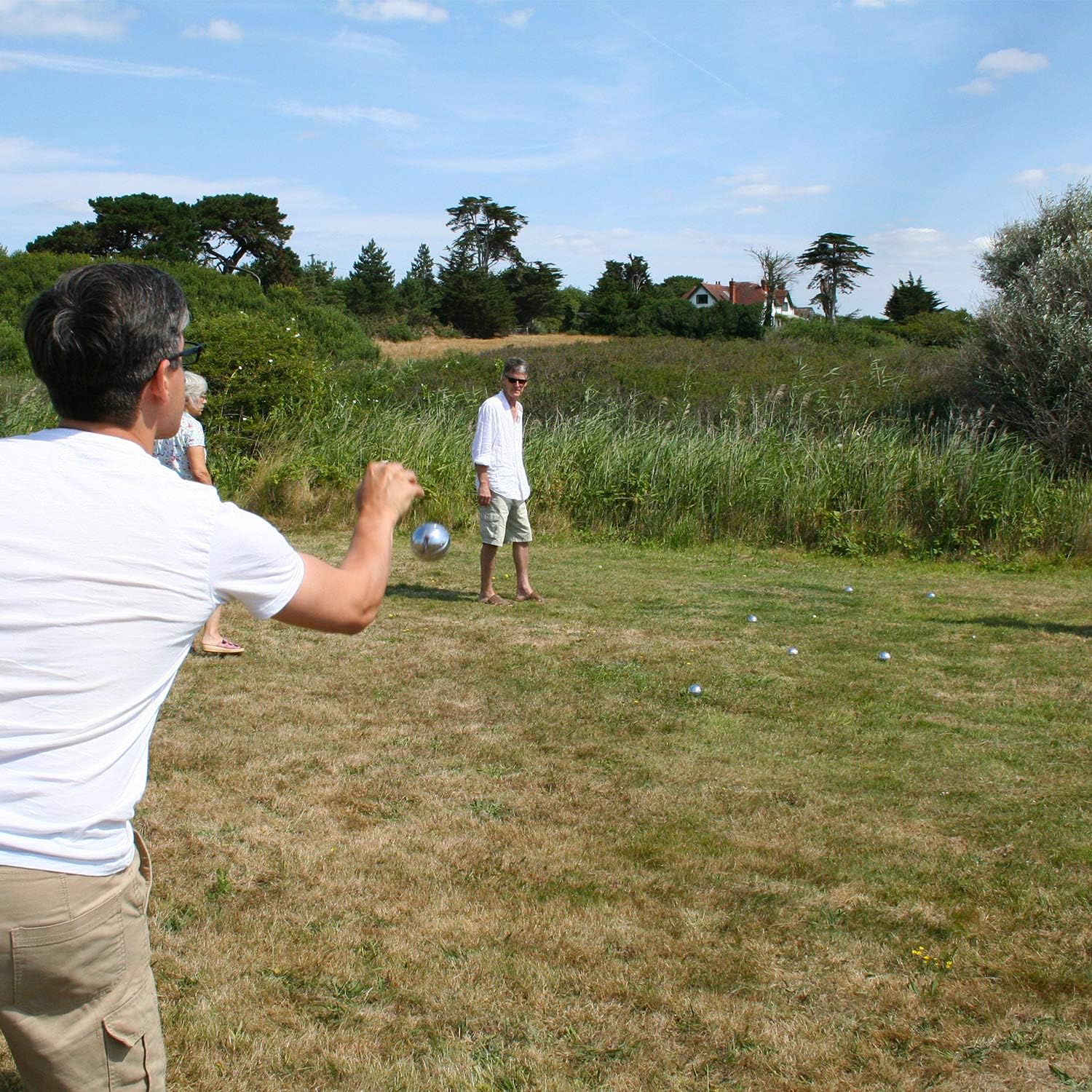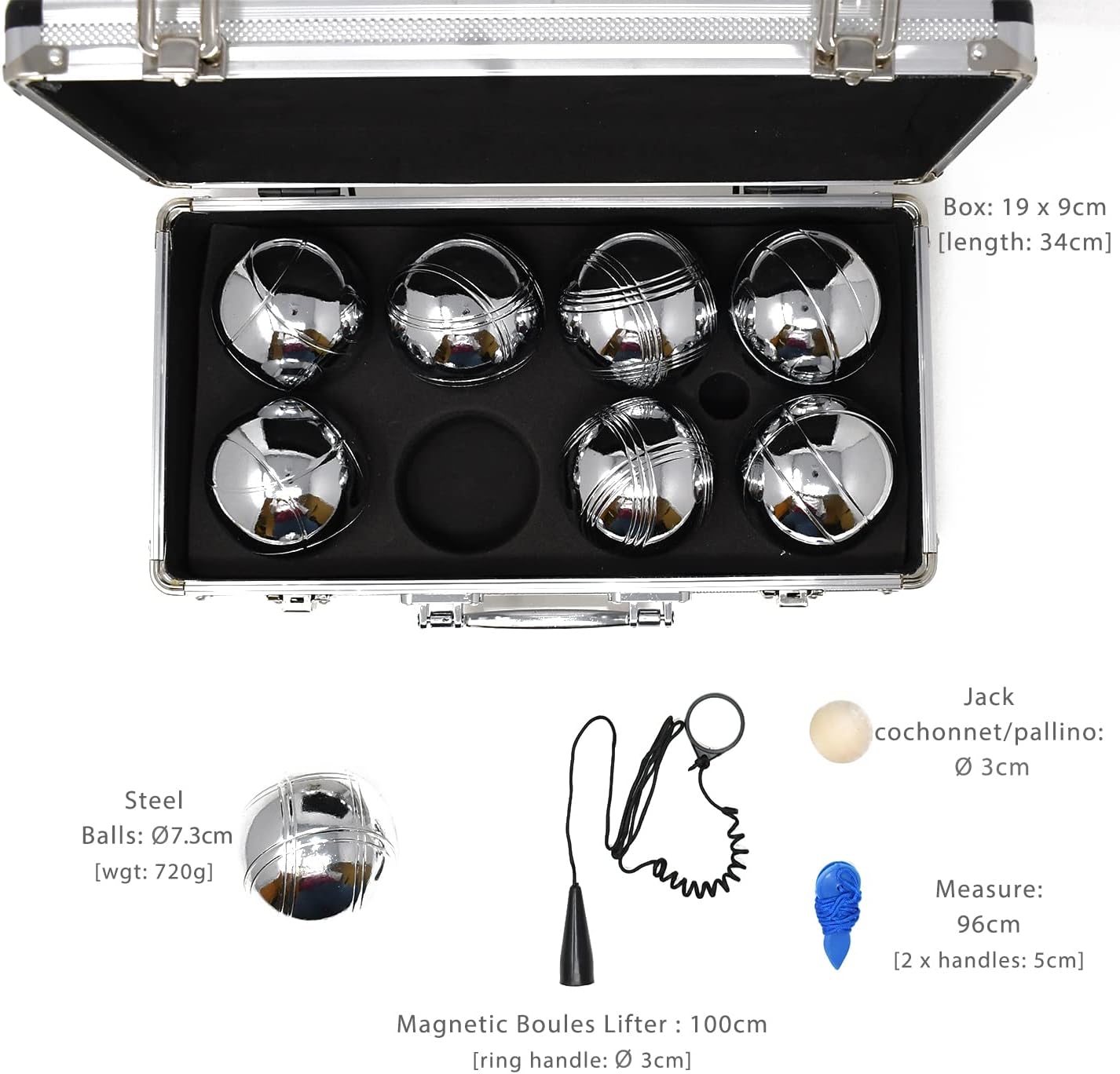 8 bocce in acciaio lucido con 4 diversi incisi segni Imballato in modo sicuro all'interno di una smart custodia metallica con inserti in schiuma Viene fornito con la presa di legno, misura di plastica Bocce ciascuna misura 8 centimetri di diametro In acciaio lucidato a specchio ed è ponderata internamente con argilla per 719 g