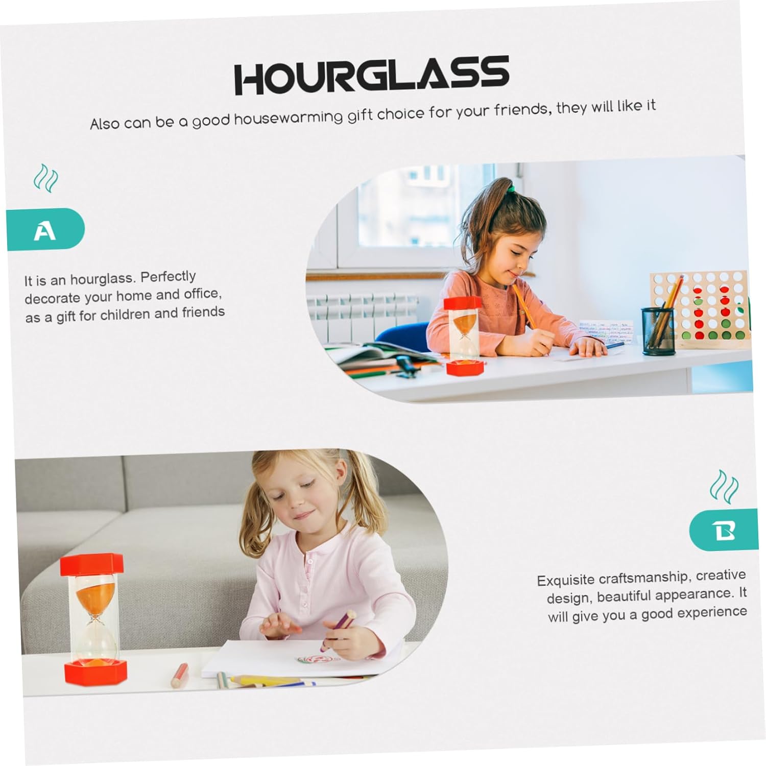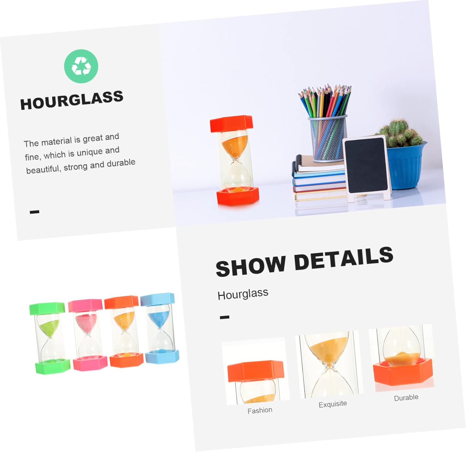 Clessidra: , , portatile e facile da usare, piacerà a te e alla tua famiglia, timer decorativi per la sabbia Clessidra artigianale: design creativo e delicato dell'aspetto del prodotto, molto affascinante e decorativo, giocattoli con timer a sabbia Clessidra per : può essere riutilizzata più volte, molto creativa e decorativa, decorazione a forma di clessidra Clessidra: la clessidra può essere un ottimo strumento per i tuoi amici in occasione di feste speciali o compleanni, clessidra per Timer per : realizzato in , è un timer efficiente e una semplice decorazione da scrivania, timer decorativo a sabbia
