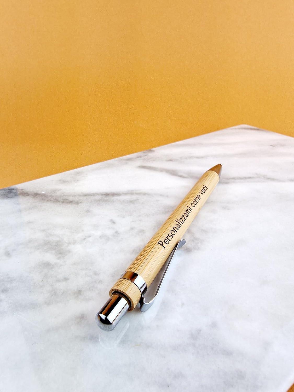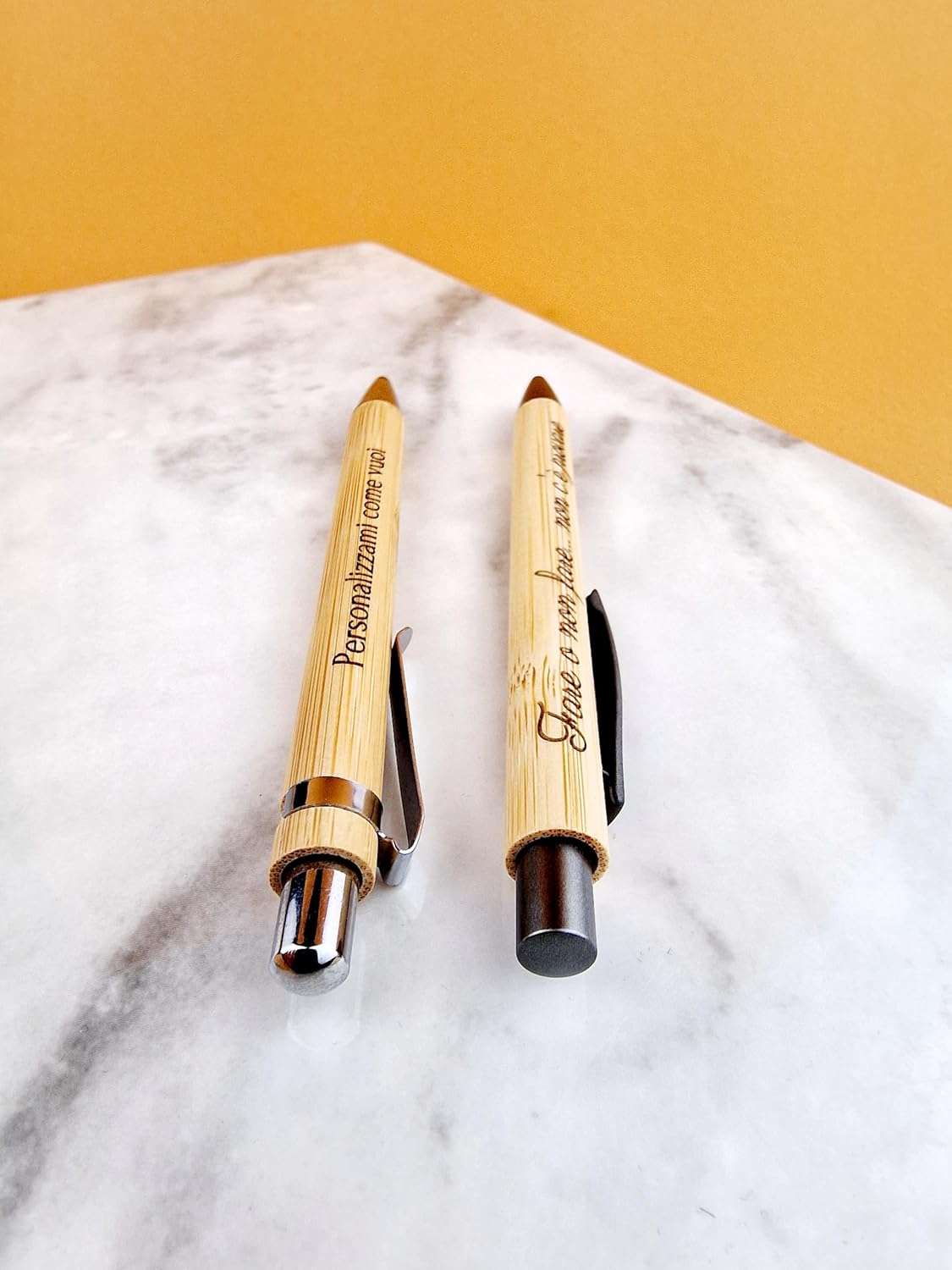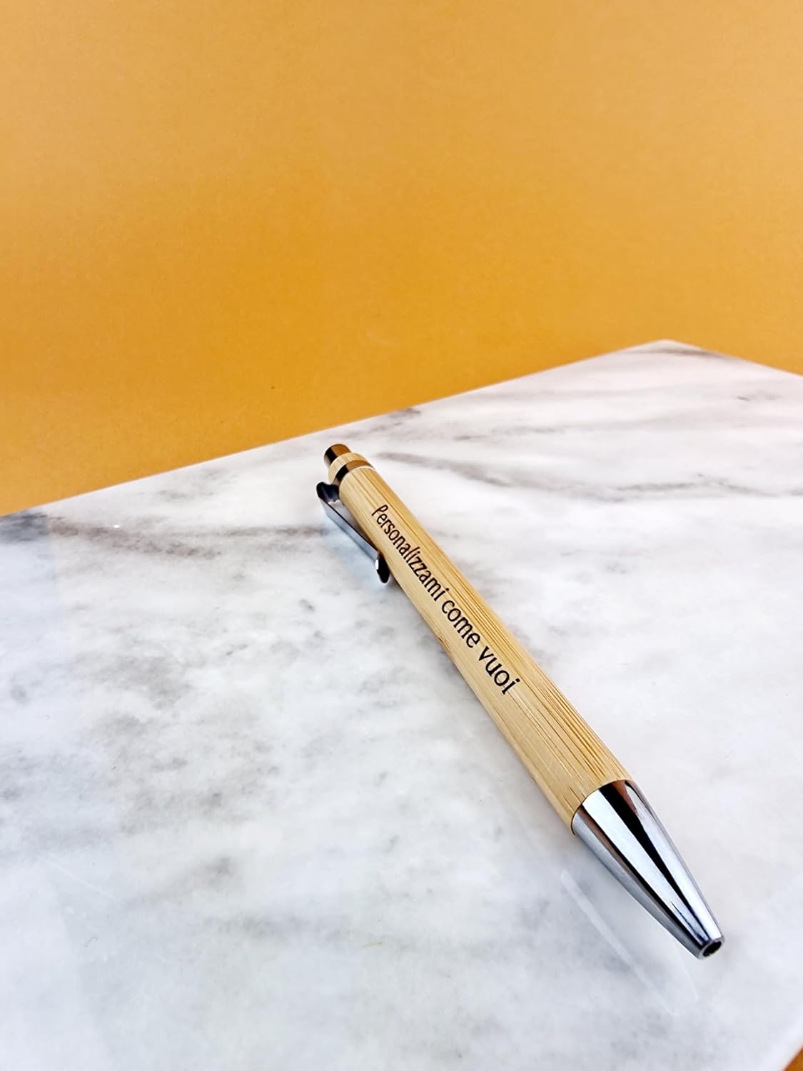 Penna personalizzabile: Questa penna in legno di bambù può essere personalizzata con nomi o frasi, rendendola un'idea regalo unica e speciale. Elegante confezione: La penna viene fornita con un elegante sacchettino in velluto . Inchiostro nero: L'inchiostro utilizzato nella penna è di colore nero, ideale per una scrittura nitida e leggibile. Materiale sostenibile: La penna è realizzata in legno di bambù, un materiale naturale ed ecosostenibile. Design: Penna a sfera con punta larga retrattile, corpo in legno e clip metallica; La personalizzazione è disponibile con diversi font.