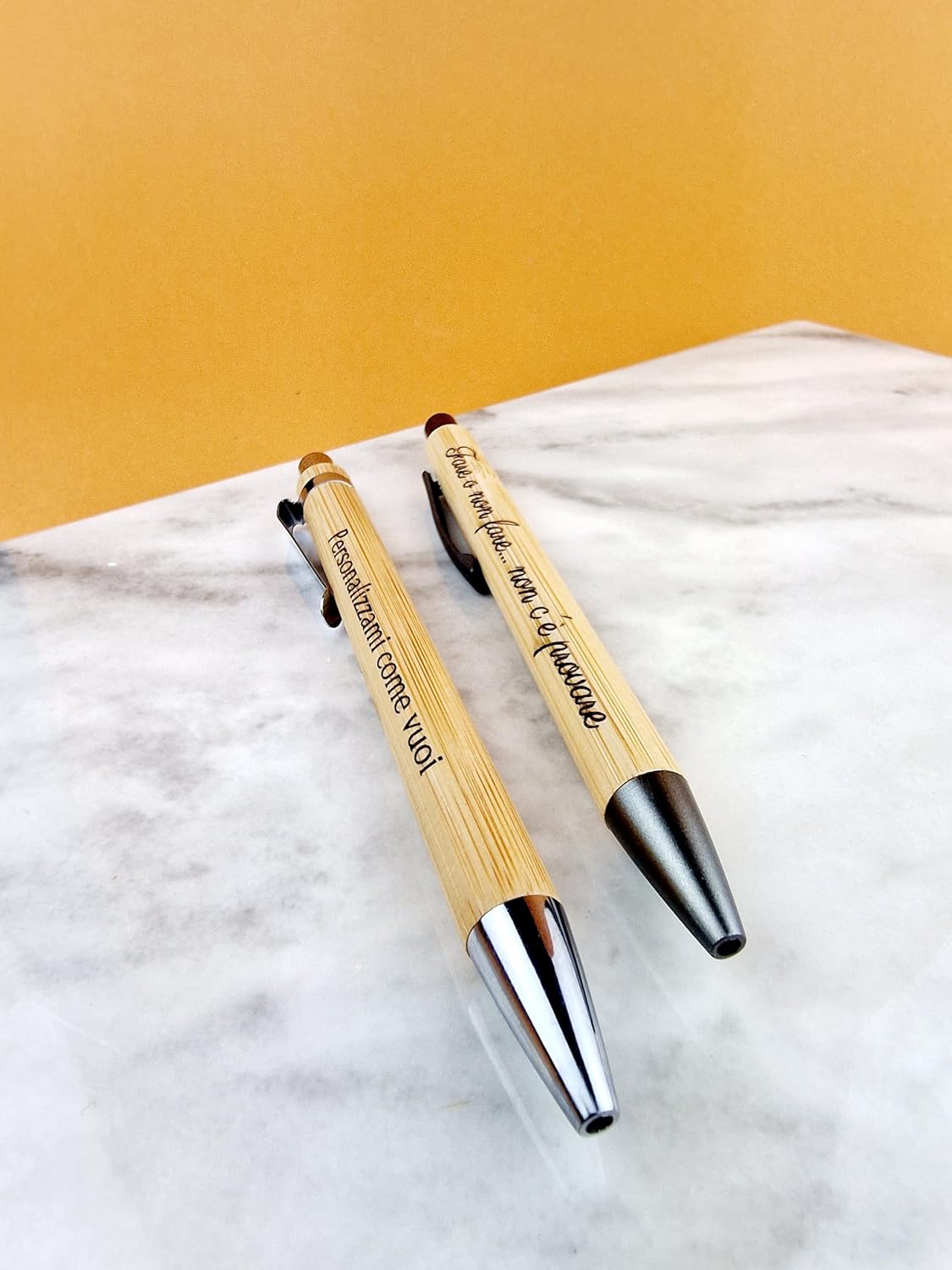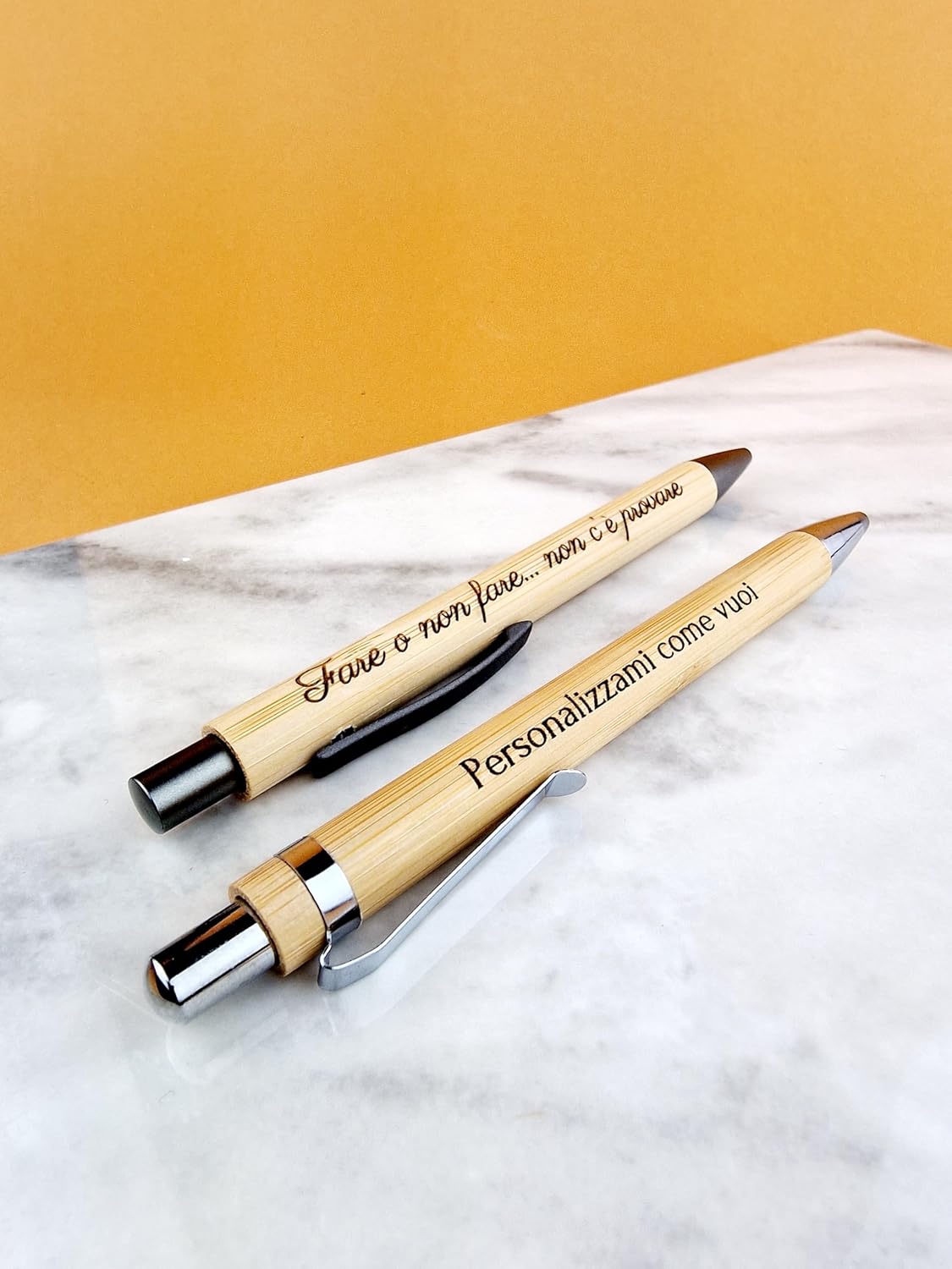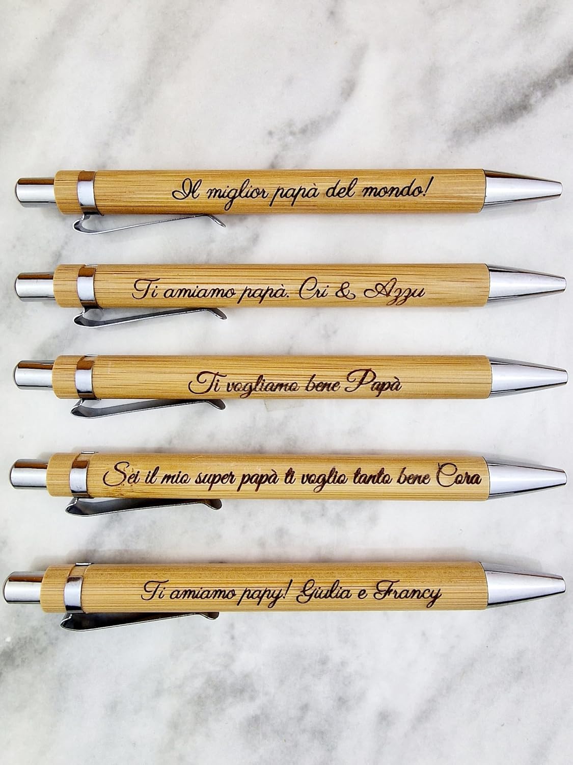 Penna personalizzabile: Questa penna in legno di bambù può essere personalizzata con nomi o frasi, rendendola un'idea regalo unica e speciale. Elegante confezione: La penna viene fornita con un elegante sacchettino in velluto . Inchiostro nero: L'inchiostro utilizzato nella penna è di colore nero, ideale per una scrittura nitida e leggibile. Materiale sostenibile: La penna è realizzata in legno di bambù, un materiale naturale ed ecosostenibile. Design: Penna a sfera con punta larga retrattile, corpo in legno e clip metallica; La personalizzazione è disponibile con diversi font.