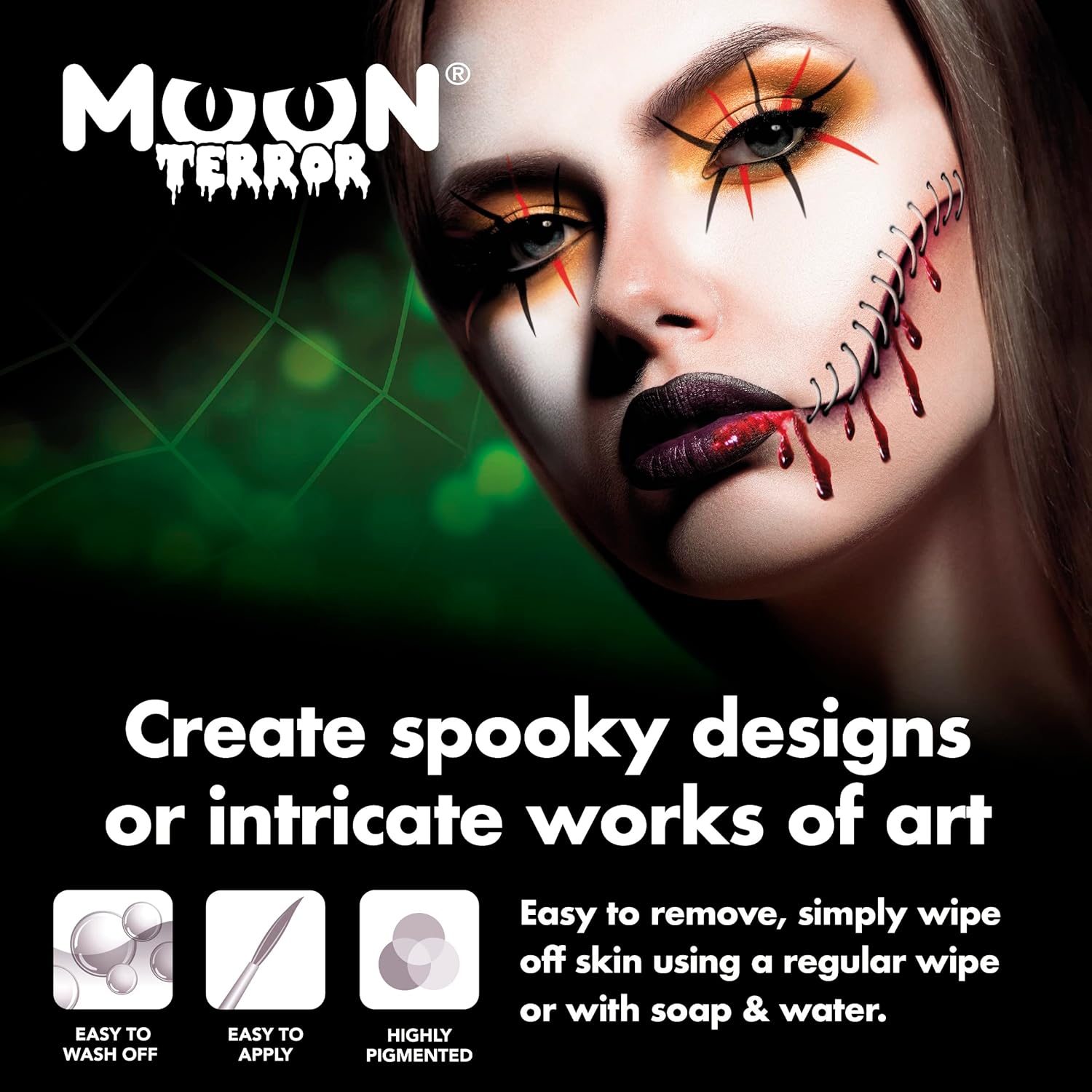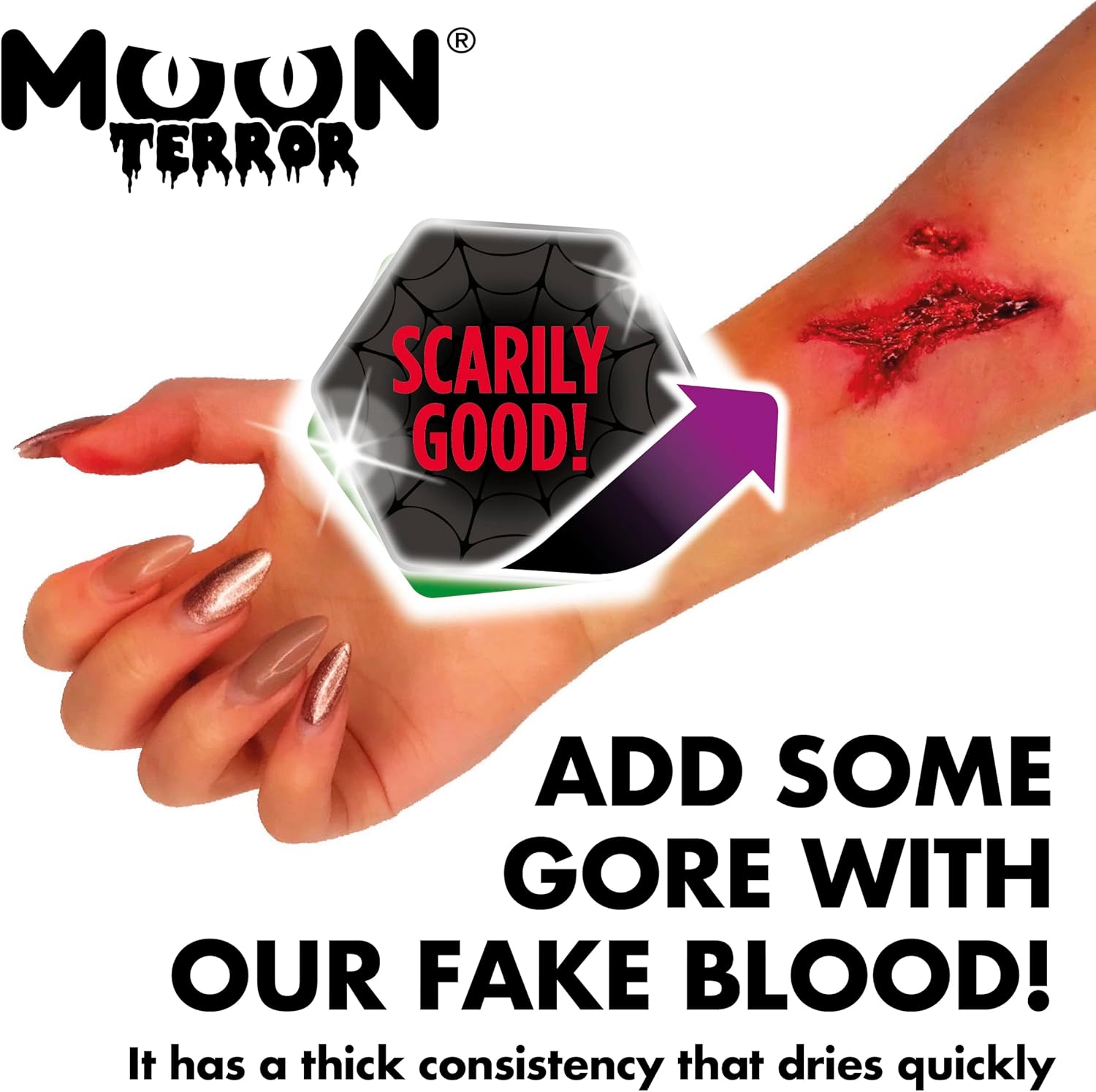 TERROR DI LUNA FALSA SANGUE - Terrintemente spessa e realistica per effetti del sangue arteriosi scioccanti e bagnati che faranno girare la testa! Qualità premium: questo sangue finto premium con la sua consistenza spessa e coagulata sembra il vero affare. Non sfaldato, è follemente realistico per quei momenti horror morti della notte. Perfetto per il divertimento di Halloween, o produzioni teatrali e teatrali Facile da usare: un liquido viscoso e non tossico utilizzato per simulare tagli, ferite e morsi. Con il suo pratico applicatore di ugelli, puoi creare facilmente quel look cruento! E per rimuovere, basta lavare con acqua e sapone o utilizzare una normale salvietta per il trucco Sentirsi bene: vegano e sicuro al 100% da usare, il nostro sangue finto con terrore lunare certito cosmeticamente non contiene ingredienti cattivi, quindi sentiti libero di fare del tuo peggio! Lo spettro completo: la gamma completa e iconica Moon Terror di vernici per Halloween e il trucco con effetti speciali è magnificamente macabra e magico. Prendi il tuo in questo momento e crea la tua notte di paura piena di trucchi e dolcetti!