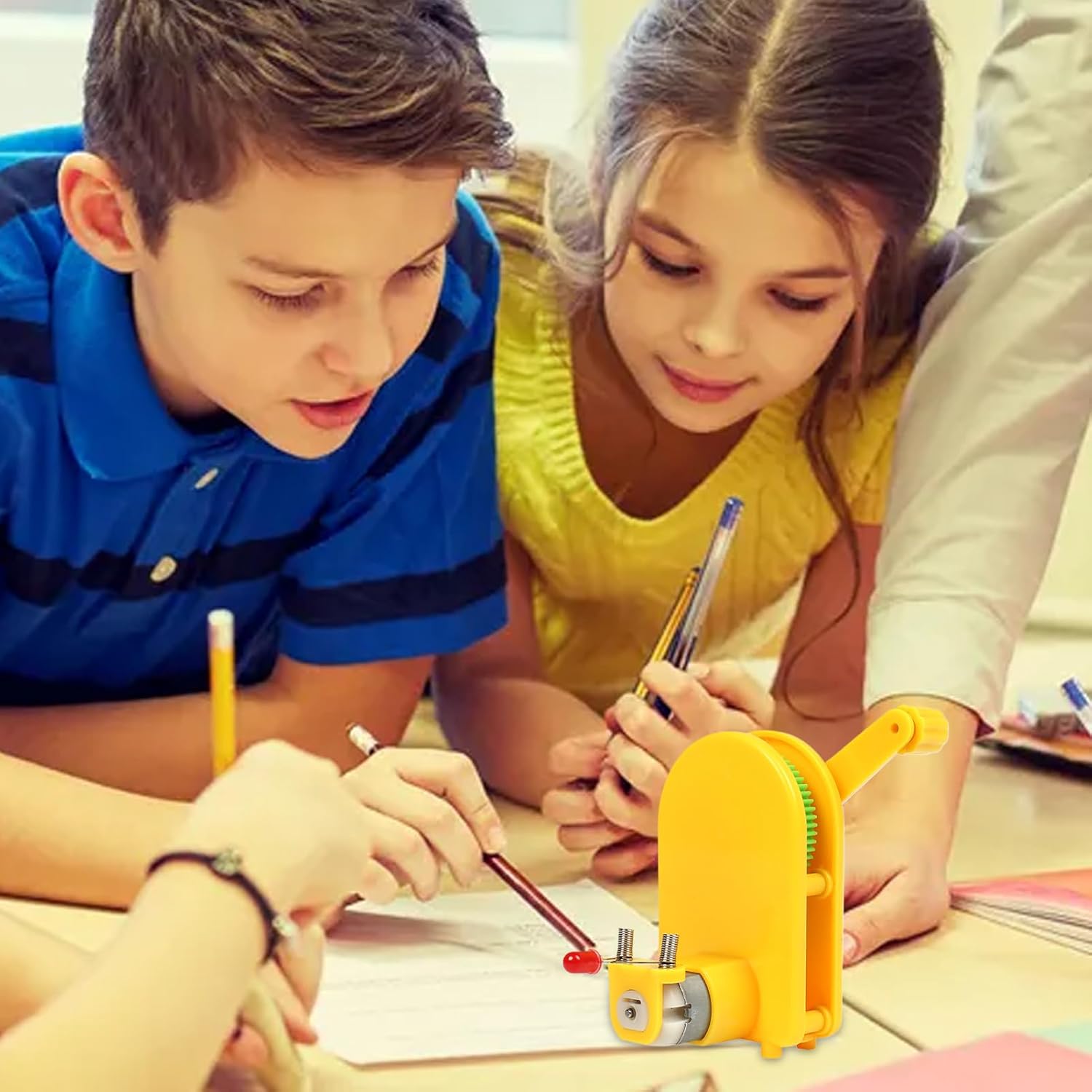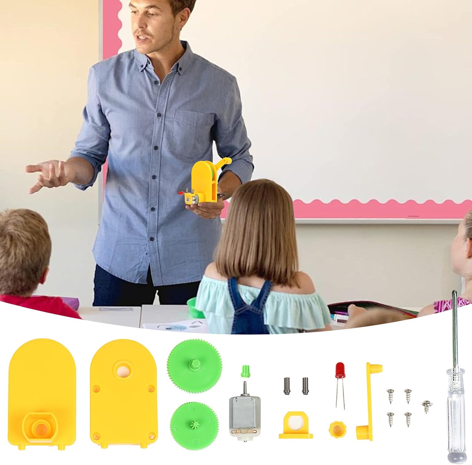 Materiale resistente: Realizzato in ABS resistente con bordi levigati e componenti metallici robusti, garantisce sicurezza durante il montaggio e l'uso continuativo. Ideale per attività educative in classe o a casa, mantiene integrità strutturale dopo ripetuti utilizzi grazie alla combinazione di plastiche durevoli e metalliche stabilizzanti. Montaggio semplificato: Favorisce lo sviluppo di abilità tecniche e ragionamento tridimensionale grazie all'assemblaggio modulare. Il di collegamento intuitivo supporta la creatività degli studenti, perfezionando competenze pratiche attraverso l'esplorazione tattile Funzionamento Meccanico Illustrato: alimentato a manovella trasforma il movimento fisico in energia elettrica, rivelando il processo completo di conversione energetica con componenti visibili e tangibili Versatilità Operativa: di conversione energetica intuitivo supporta esperimenti scientifici con dispositivi a LED e applicazioni didattiche green, mostrando chiaramente i principi fisici attraverso l'output misurabile in contesti reali con funzionamento manuale coerente Versatilità Didattica: Strumento educativo innovativo che integra principi STEM attraverso l'energia manuale. Design intuitivo adatto a diverse fasce d'età, promuove comprensione pratica 'elettricità con applicazioni sia individuali che di gruppo