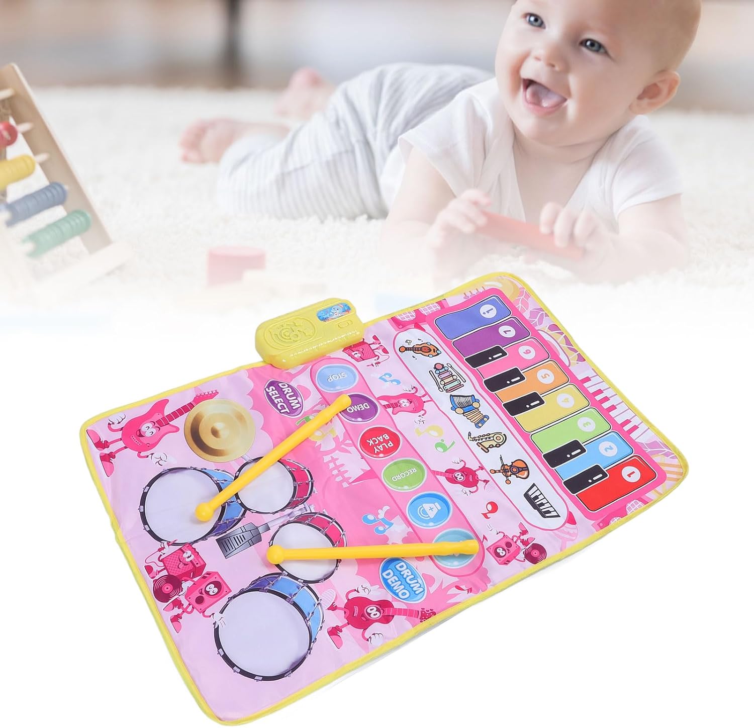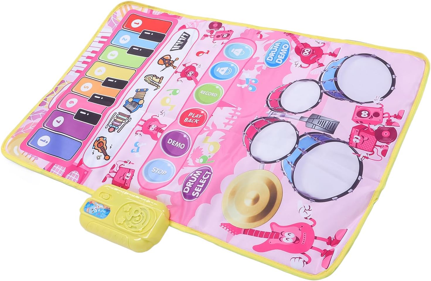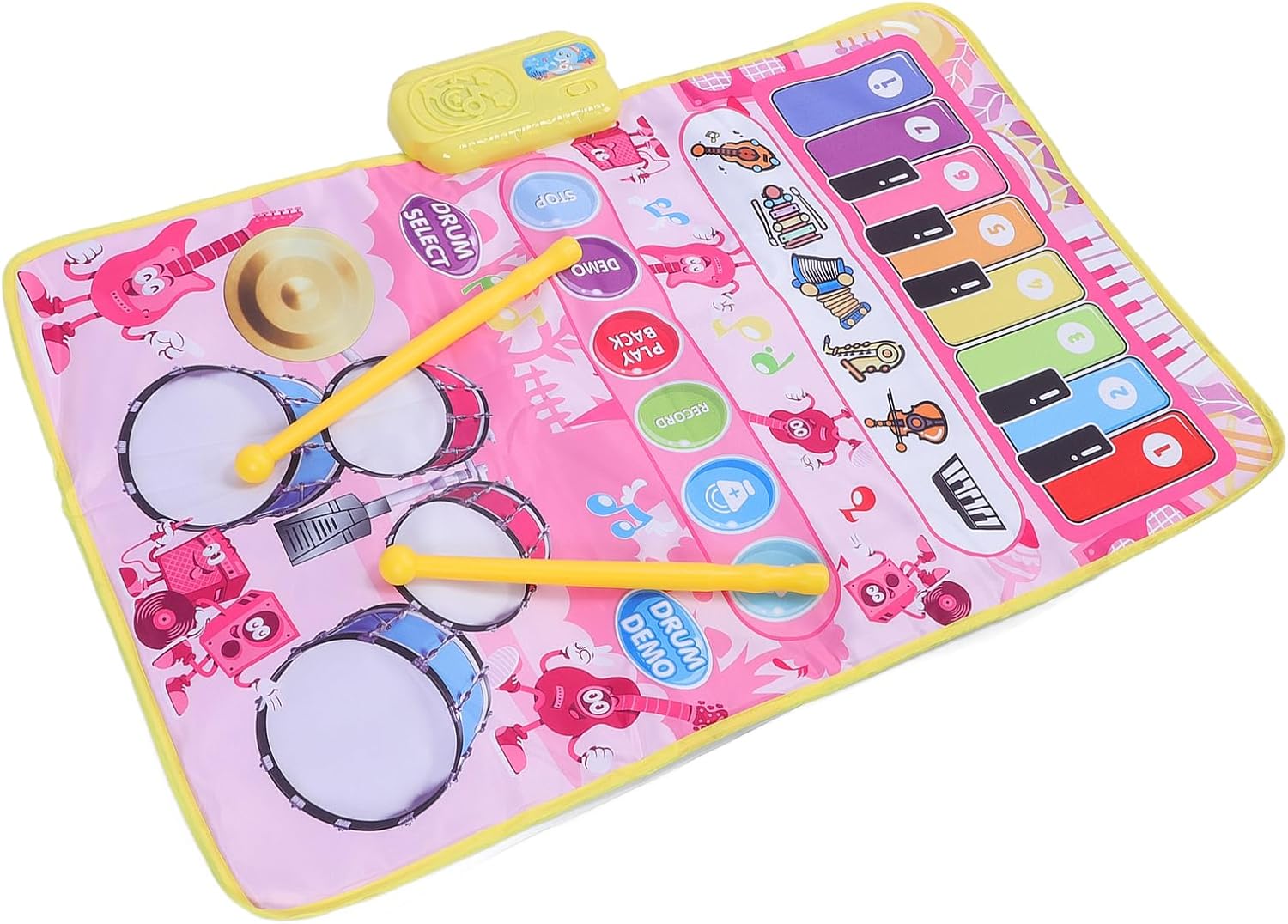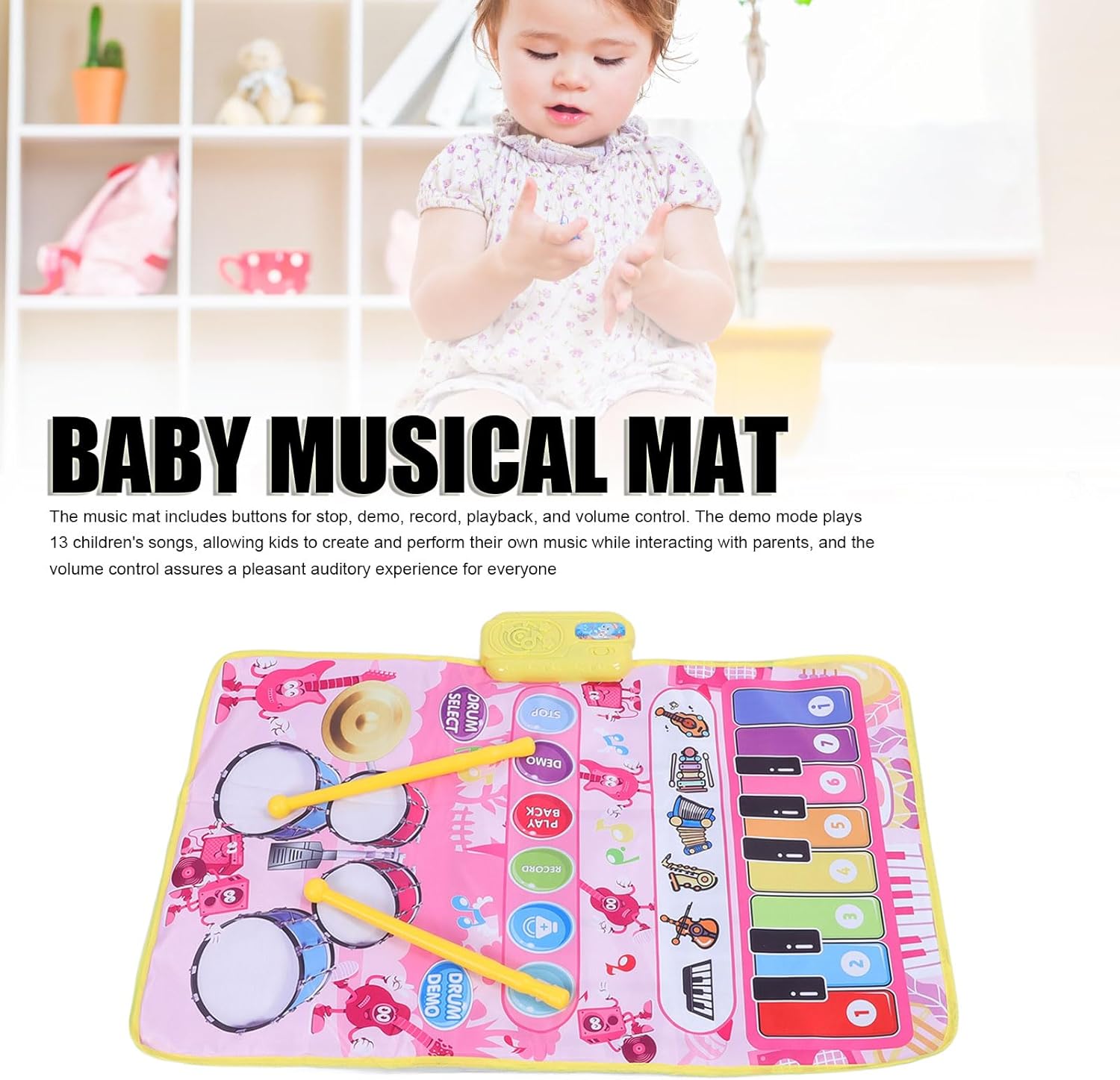 [MODALITÀ DUAL PLAY] Scatena la creatività di tuo figlio con 2 modalità musicali: e batteria, per un'esplorazione musicale versatile. 13 tasti producono 5 suoni strumentali, mentre il tappetino offre 3 suoni per un'esperienza musicale dinamica. [AMPIO SPAZIO DI GIOCO] Con una dimensione spaziosa di 80 x 50 cm, due bambini possono giocare insieme, rendendolo ideale per l'apprendimento interattivo e il divertimento multiplayer. Lascia che i bambini si leghino alla musica e migliorino le loro abilità musicali in un contesto sociale. [DIVERTIMENTO MUSICALE MIGLIORATO] Presenta ai bambini 13 brani dimostrativi e lascia che registrino e riproducano le loro esibizioni per ore di intrattenimento. Con il controllo del volume, i genitori possono garantire una piacevole esperienza di ascolto. [COSTRUZIONE ROBUSTA] Realizzato in plastica di qualità, questo tappetino musicale resistente garantisce un uso duraturo. I bambini possono creare liberamente musica ed esplorare la creatività musicale con le bacchette incluse, incoraggiando il gioco fantasioso. [HASSLE-SETUP] Basta inserire 3 batterie AA (non incluse) e lasciare che la musica abbia inizio. Nessun complesso