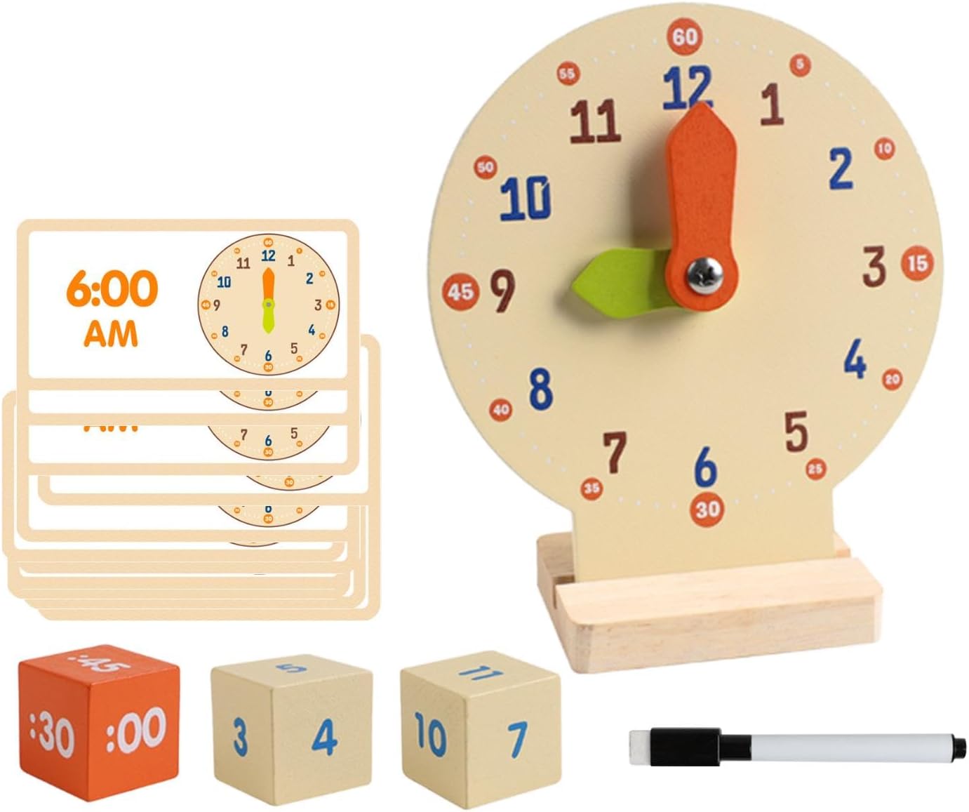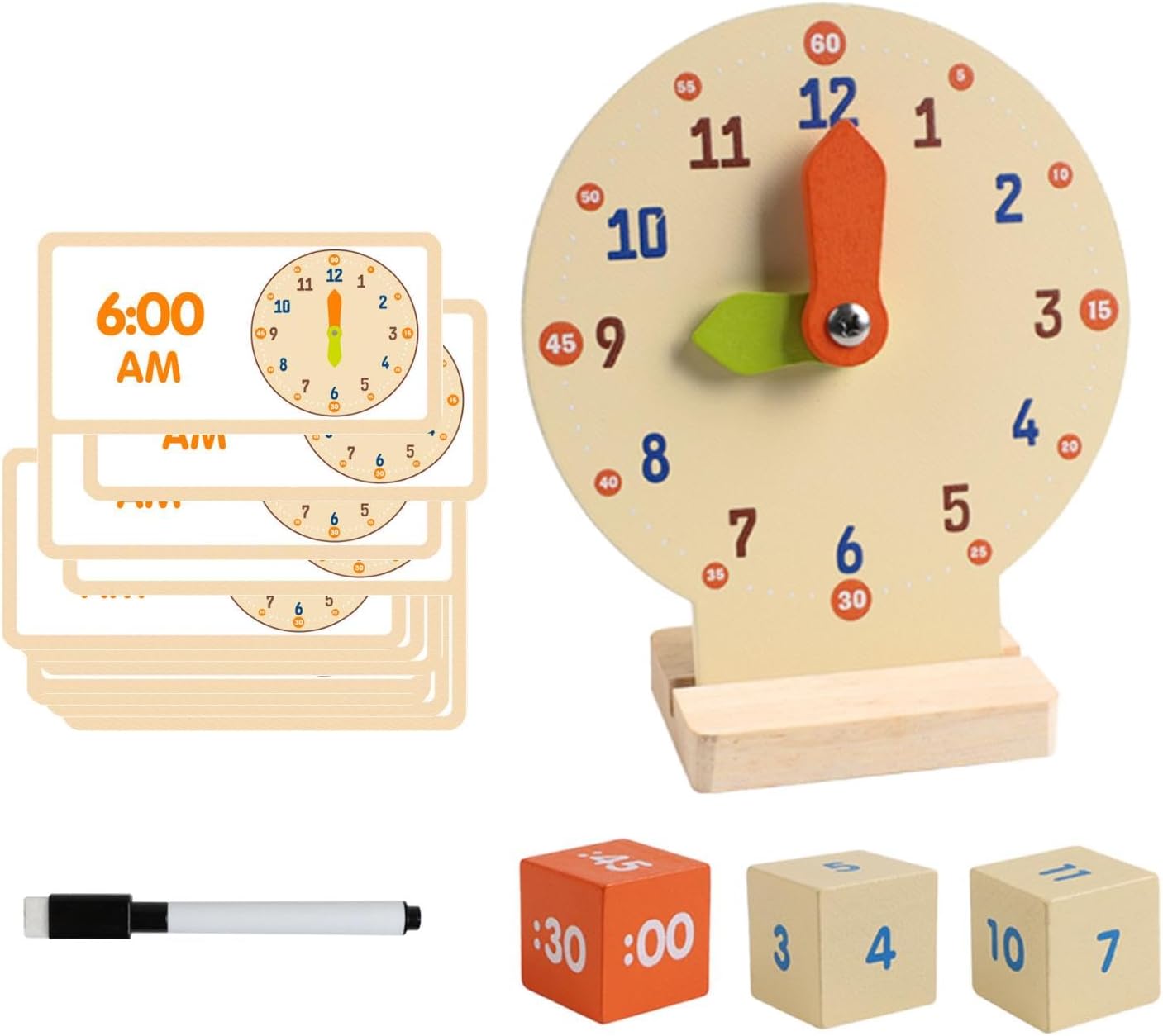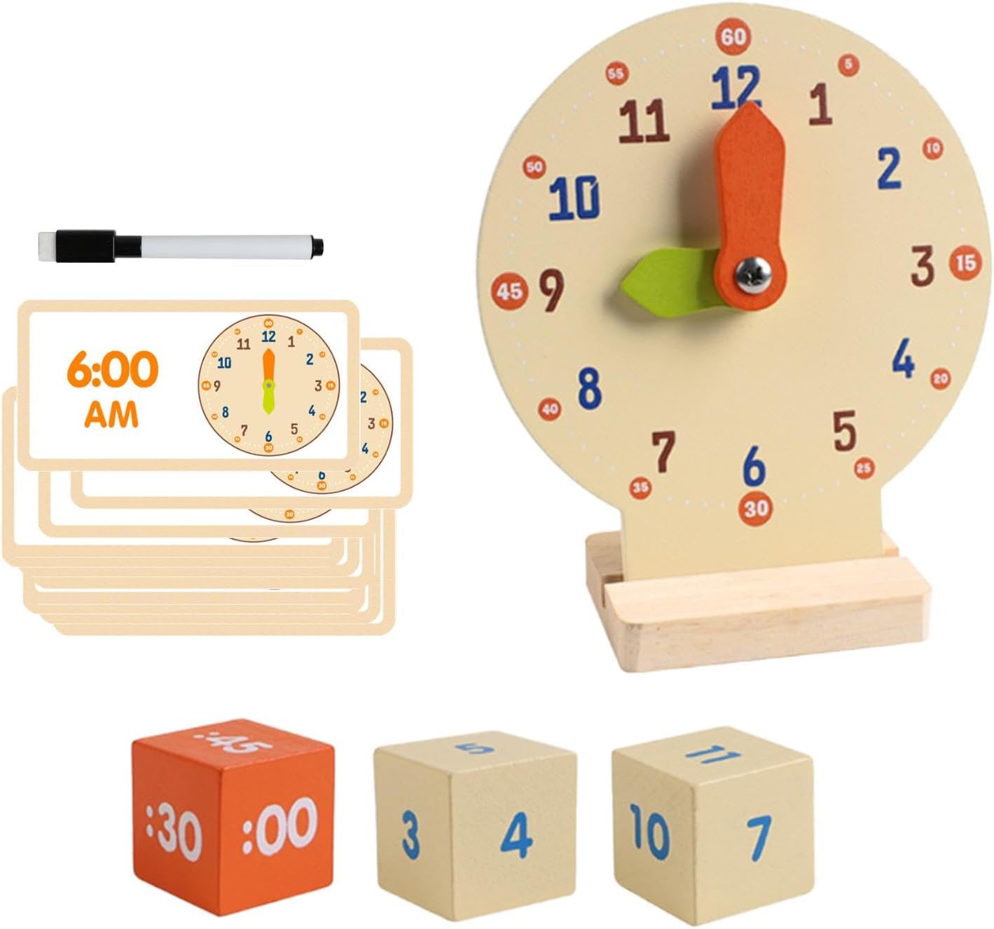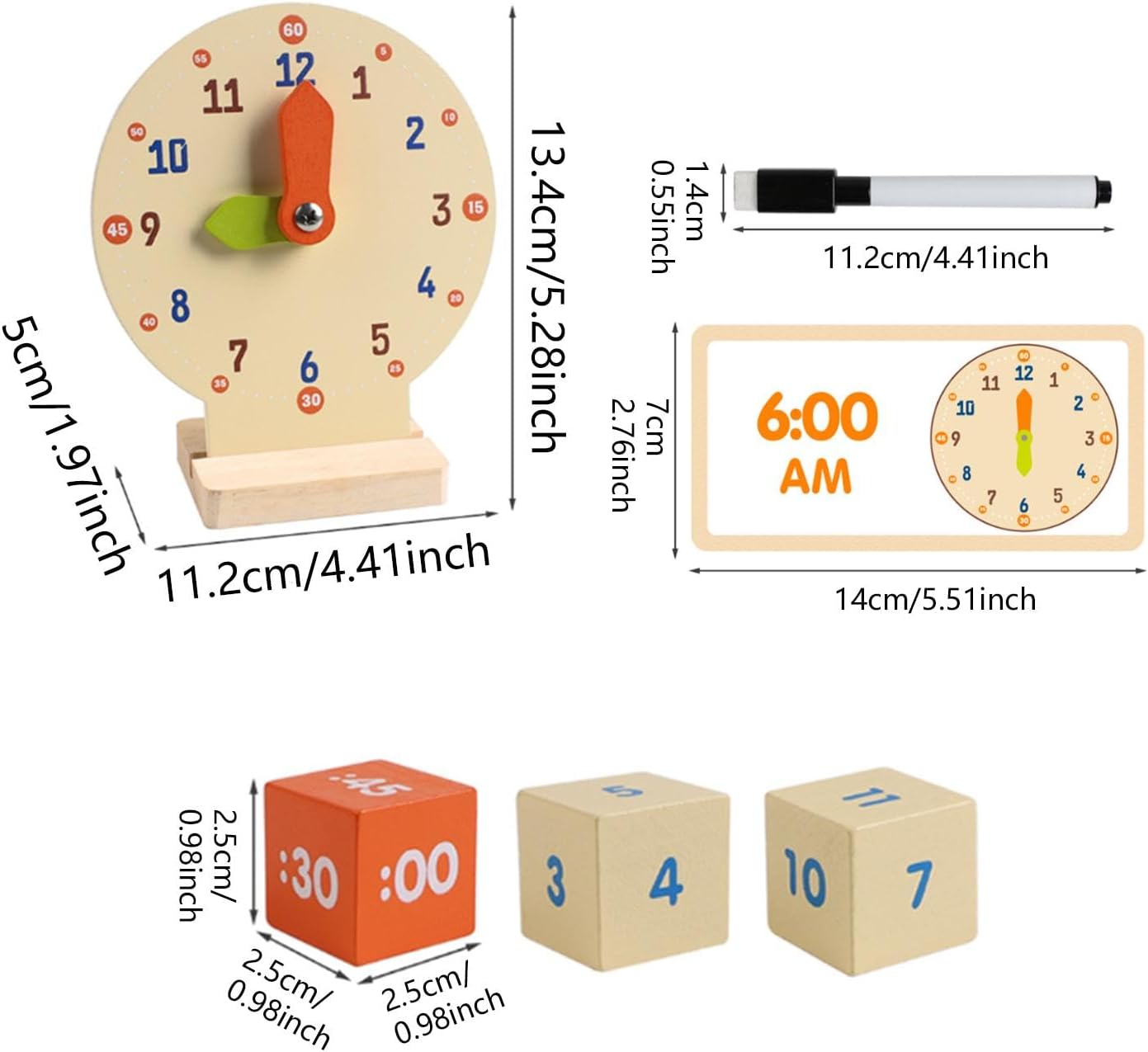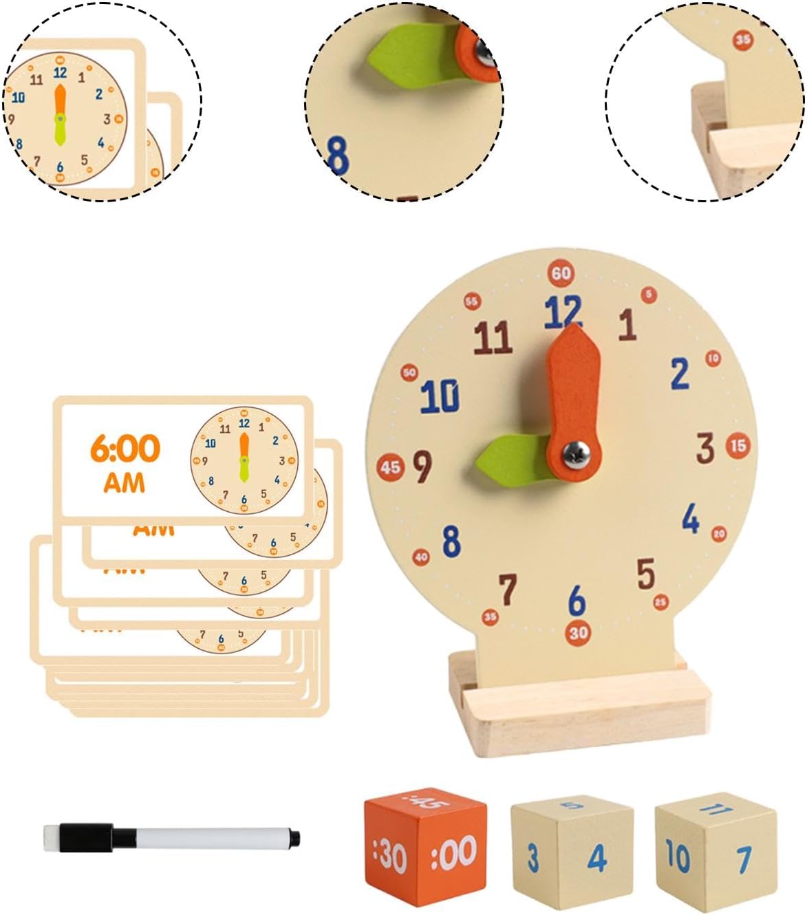 【Dimensioni compatte】: progettato alla praticità, l'orologio misura 11,2 x 5 x 13,4 cm, il che lo rende facile da maneggiare e riporre, pur essendo delle dimensioni perfette per le mani dei giovani studenti 【Set di apprendimento completo】: il pacchetto include un orologio di legno, 3 dadi, una penna e 12 carte bifacciali, offrendo vari interattivi per imparare il tempo e i numeri 【Materiali di qualità】: realizzato in legno di qualità e rivestito con vernice a base d'acqua inodore, questo giocattolo educativo è sicuro per i bambini e rassicurante per i genitori 【Costruzione sicura per i bambini】: Orologio didattico per dire l'ora con bordi arrotondati e un design smussato, questo giocattolo per attività di sviluppo è realizzato per proteggere le manine dei bambini durante il gioco, offrendo tranquillità ai genitori, adatto per bambini dai 4 ai 6 anni 【Design robusto】: l'orologio didattico è dotato di lancette rinforzate progettate per resistere a giochi difficili, garantendo una lunga durata per i piccoli attivi