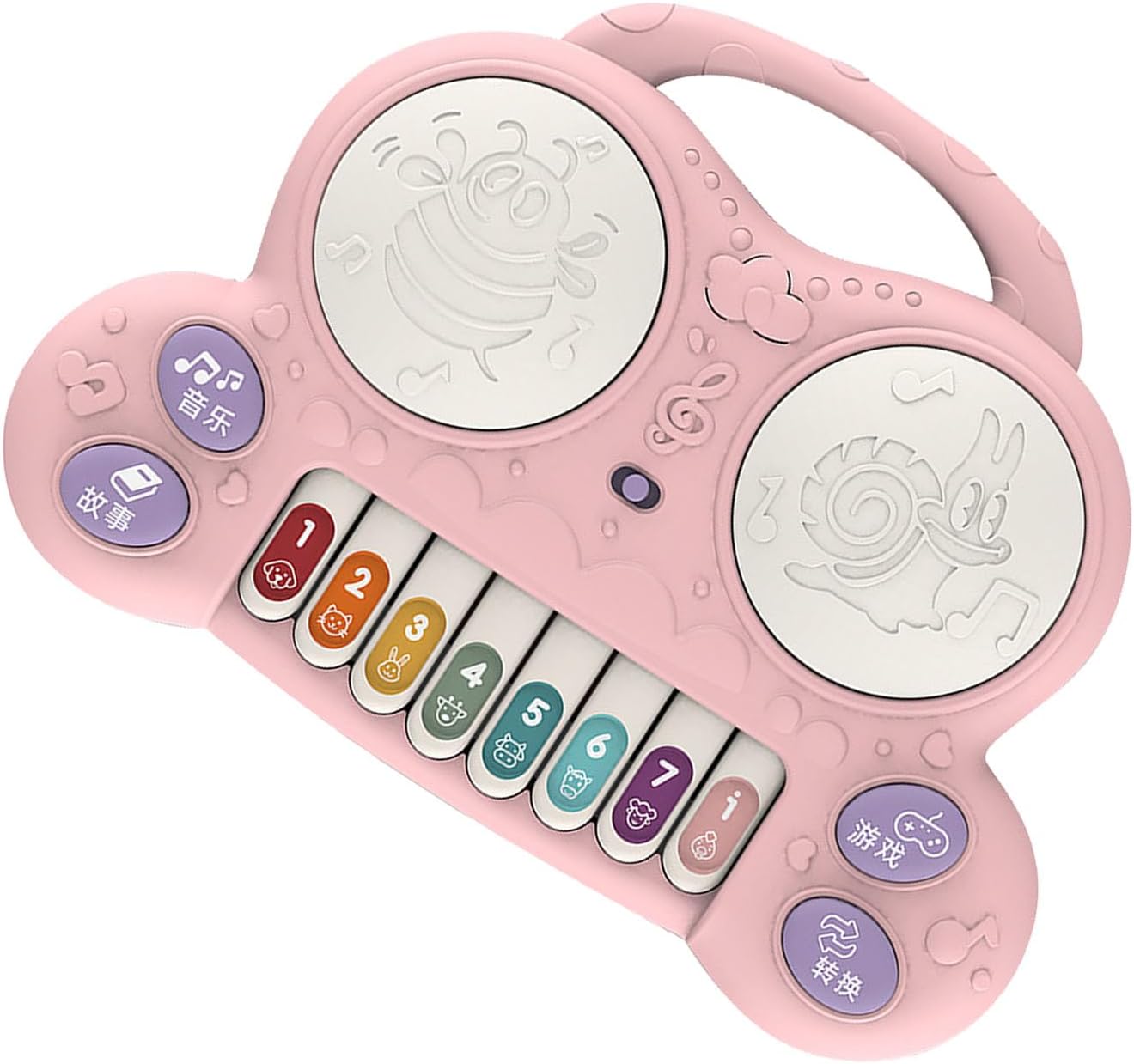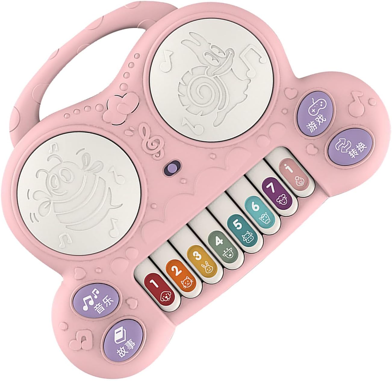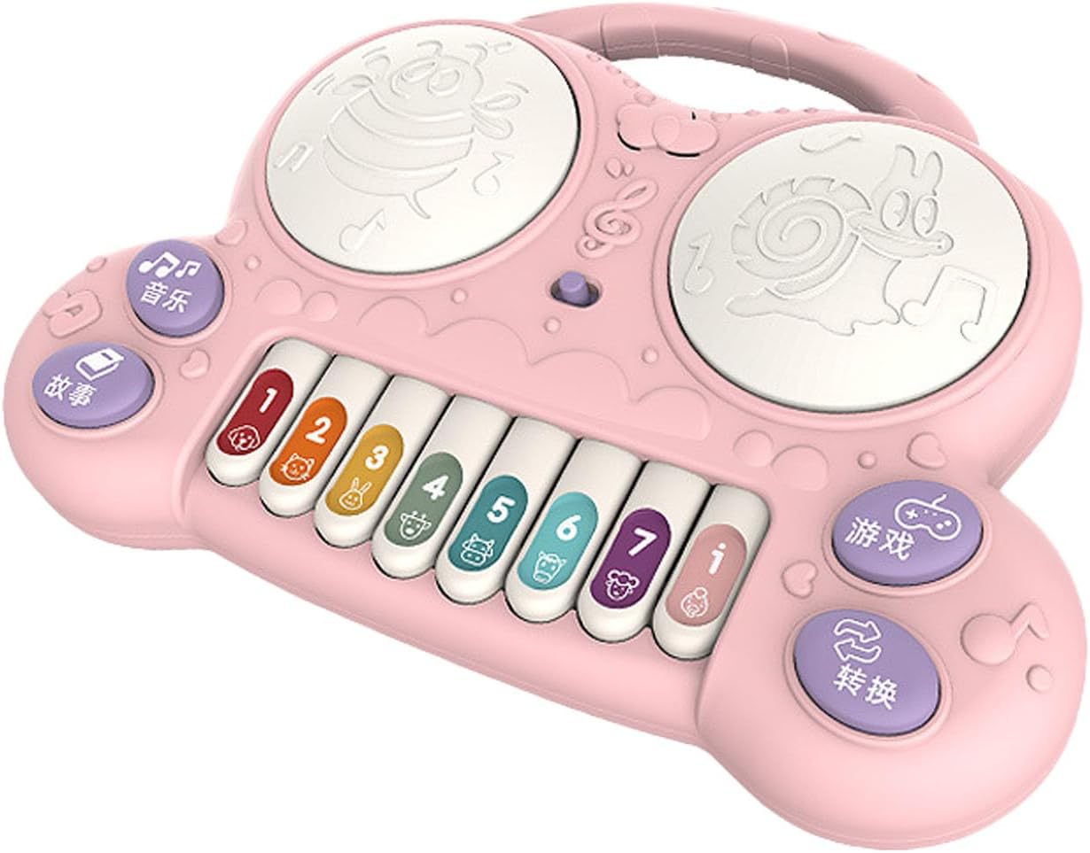CON CANZONI: 6 canzoni per bambini cambiano liberamente il senso musicale del bambino, la modalità di apprezzamento della musica, possono cambiare 6 canzoni per guidare la libera esplorazione del bambino e illuminare la percezione della musica. CON IL GIOCO: mano veloce ed eccellente coordinazione occhio-mano. Il gioco esercita l'abilità di coordinazione occhio-mano del bambino, migliora i muscoli delle braccia, è divertente ed esercita. COMPRENDERE LE CHIAMATE DEGLI ANIMALI: l'illuminazione precoce della modalità cognitiva degli animali consiste nel premere il pulsante corrispondente, che consente ai bambini di riconoscere diversi animali fin dalla giovane età. CON STORIE: un abile narratore, con tre storie tra cui passare, permettendo ai bambini di stimolare la loro immaginazione e non stancarsi mai di ascoltare. FACILE DA GIOCARE: le piccole mani giocano delicatamente, bellissime note con tasti di animali dei cartoni animati stampati sulla punta delle dita, il bambino può premere delicatamente per riprodurre musica meravigliosa ed esercitare l'abilità di coordinazione occhio-mano del bambino.