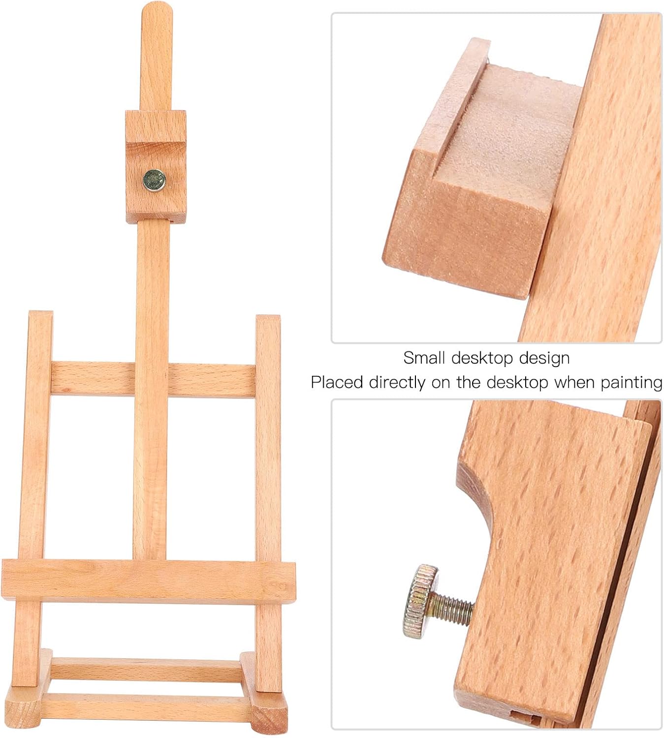 per esporre dipinti, opere d'arte opache, foto incorniciate, presentazioni in ufficio, insegne, poster, ecc. Ideale per principianti, studenti e artisti avanzati che lavorano con piccoli media Con un piccolo design desktop, il cavalletto può essere posizionato direttamente sul desktop durante la pittura Piccolo cavalletto staccabile con struttura staccabile plug-in, più comodo da trasportare Il mandrino superiore, il mandrino del cavalletto, il supporto inferiore e la barra di supporto possono essere regolati, scegli l'angolo di pittura che fa per te Il vassoio inferiore è realizzato in legno di faggio di buona qualità, che viene ripetutamente lucidato, ha meno sbavature e una buona sensazione al tatto
