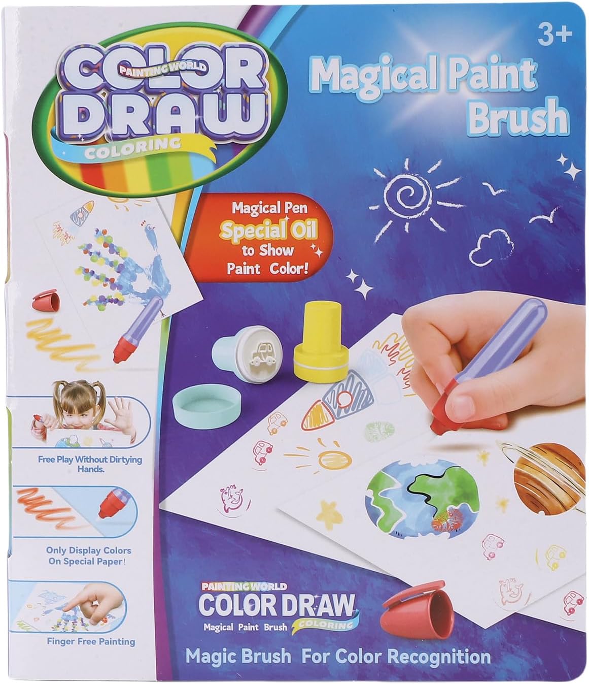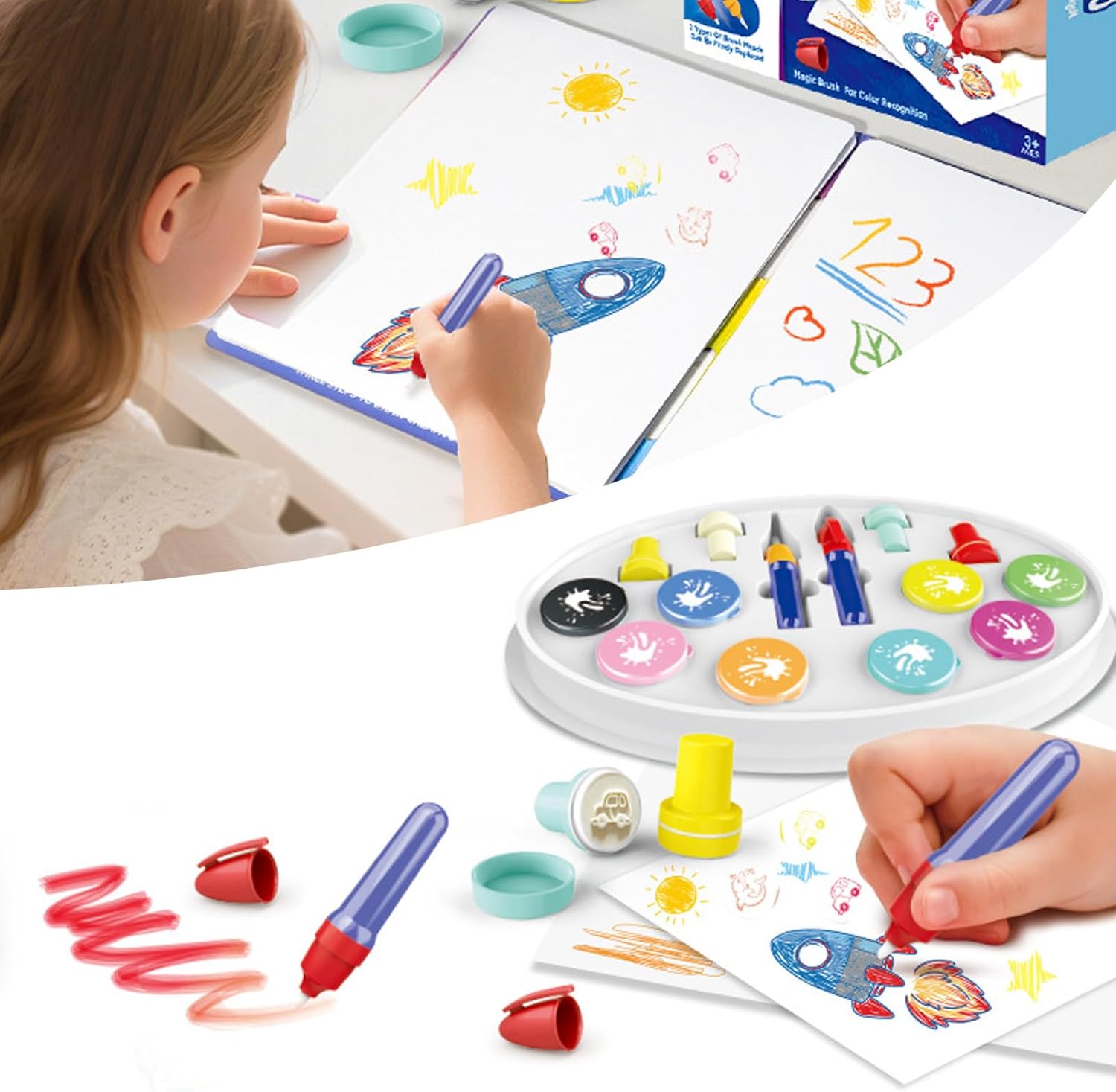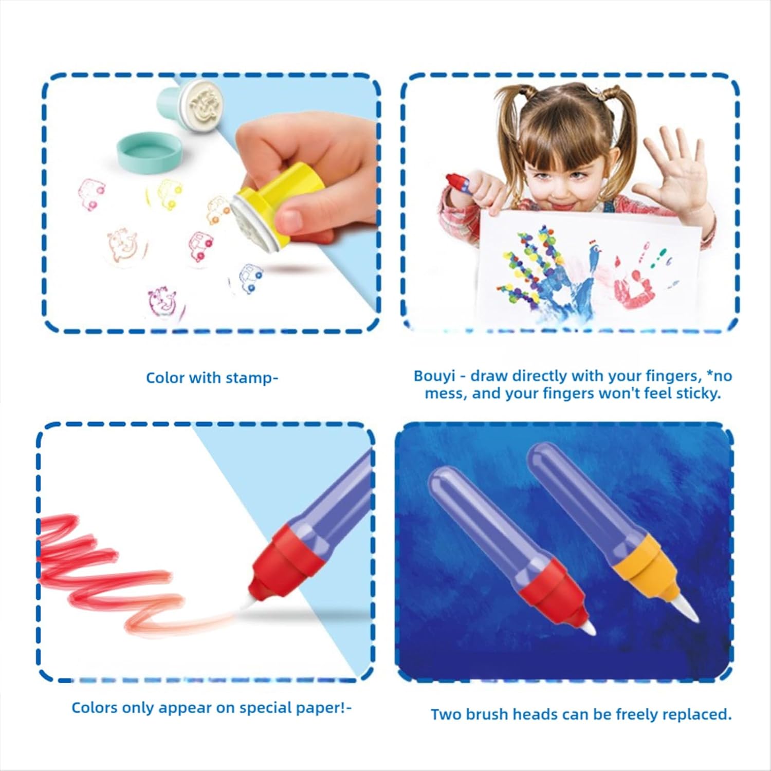 Tecnologia di rendering: questo set di pennelli magici presenta una speciale tecnica di resa dei colori. Applica il pennello magico sulla carta designata e osserva i colori vivaci emergere dalle pagine bianche! Progettazione didattica interattiva: combinando scarabocchi con resa cromatica, corrispondenza di modelli e stampa di timbri, il set di timbri da disegno per bambini migliora la coordinazione occhio-mano, le capacità motorie e il riconoscimento dei colori. Materiali sicuri: i pennelli a base d'acqua utilizzano pigmenti sicuri che sono inodori e soddisfano gli standard internazionali di sicurezza dei giocattoli. la carta spessa e liscia previene le sbavature, mentre i manici arrotondati e antiscivolo sono progettati per le mani dei più piccoli. Kit completo: il set di timbri da disegno per bambini viene fornito completo di pennelli per la resa cromatica, carta da disegno magica, timbri innovativi e modelli di motivi, non sono necessari strumenti aggiuntivi! I bambini possono esplorare molteplici modalità di gioco. Tempo di legame familiare: i genitori possono unirsi ai propri figli in attività divertenti come la ricerca di modelli, indovinare i colori e raccontare storie di francobolli. non rafforza le connessioni emotive, ma consente anche di esporre con orgoglio le opere d'arte completate.