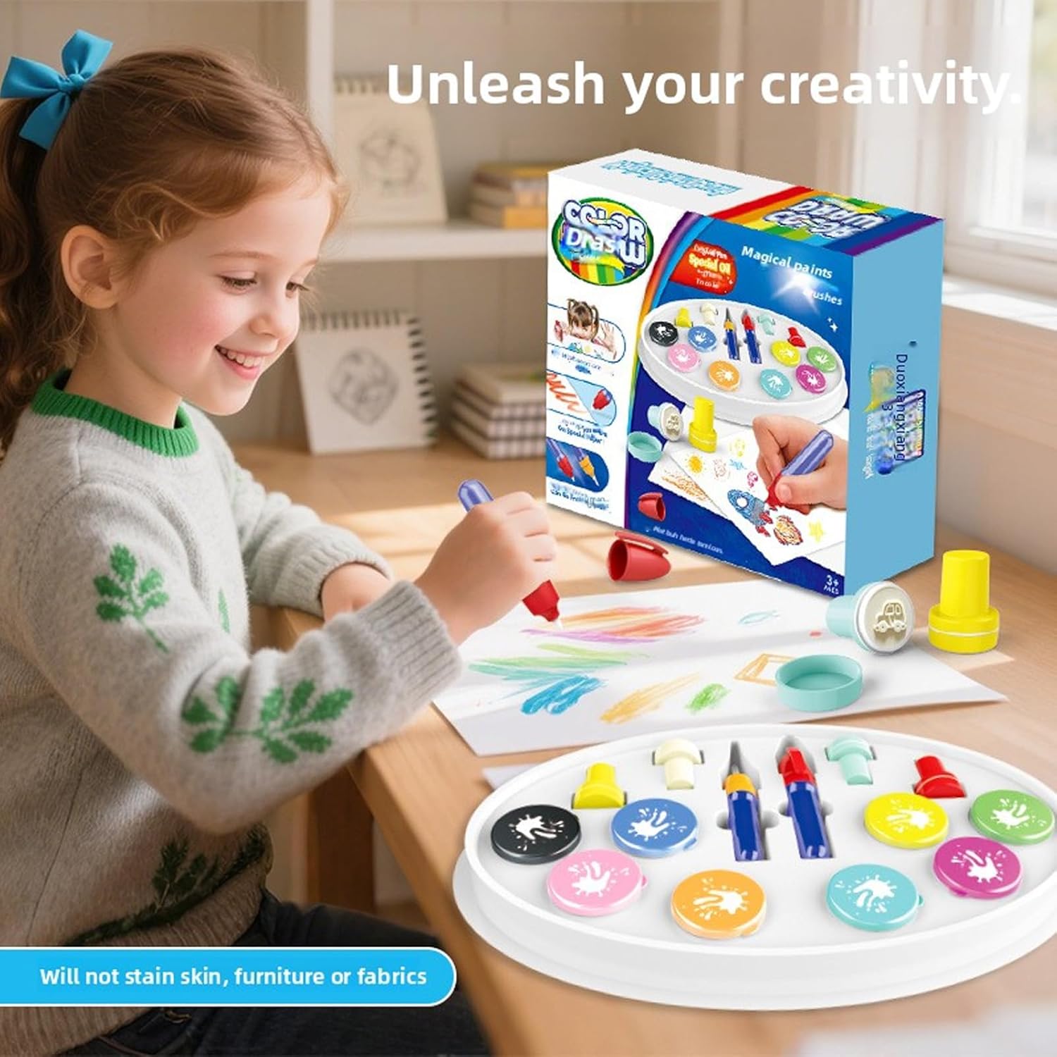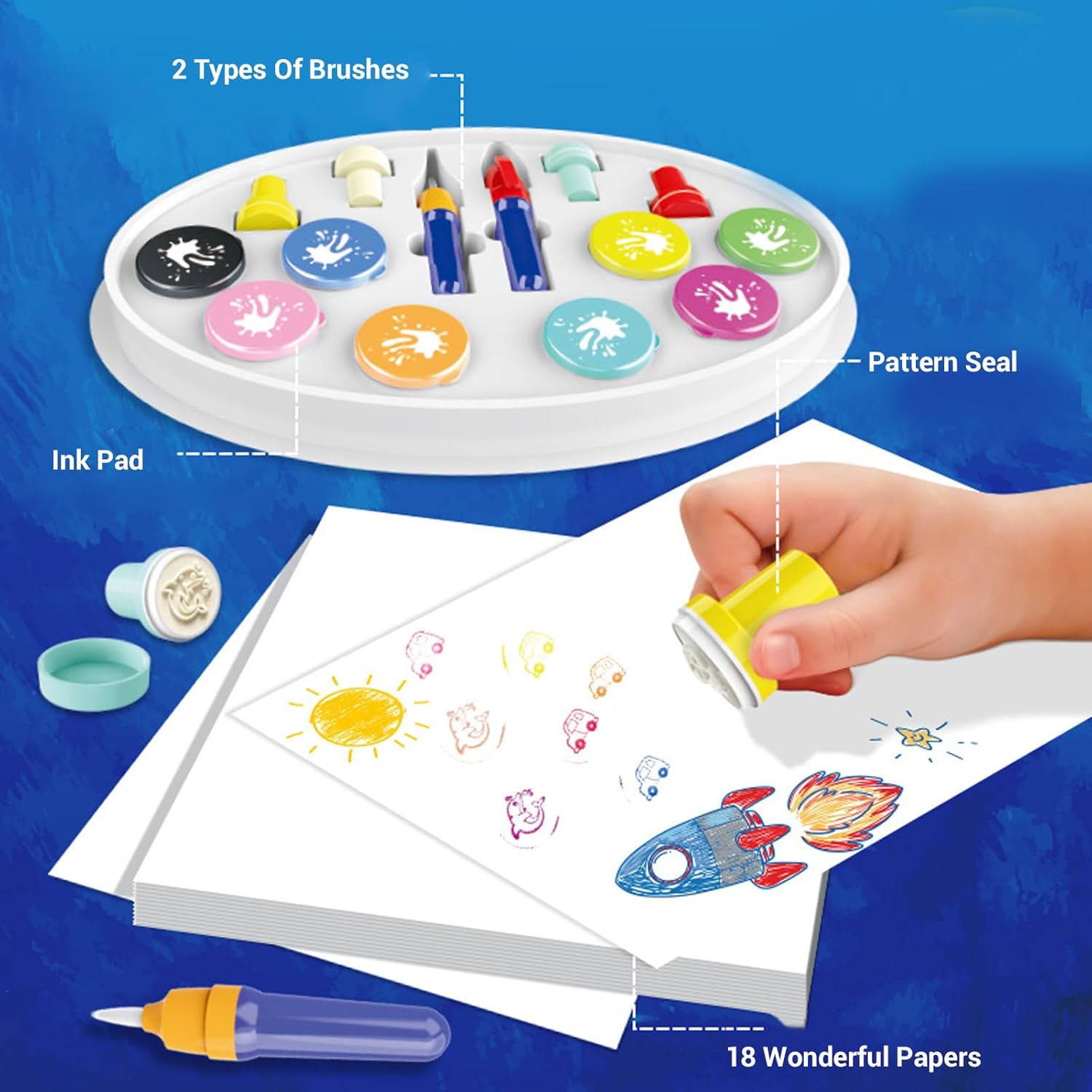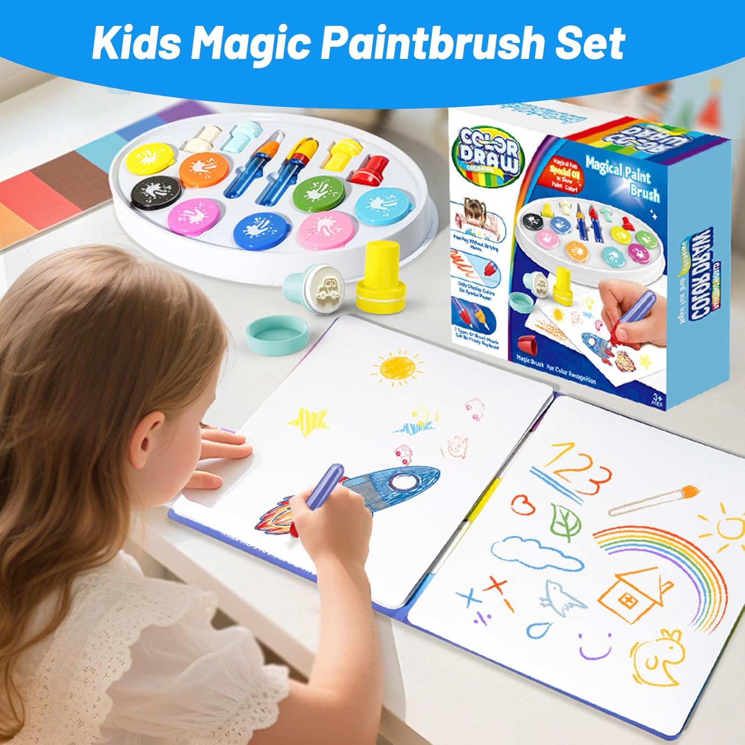 Tecnologia di rendering: questo set di pennelli magici presenta una speciale tecnica di resa dei colori. Applica il pennello magico sulla carta designata e osserva i colori vivaci emergere dalle pagine bianche! Progettazione didattica interattiva: combinando scarabocchi con resa cromatica, corrispondenza di modelli e stampa di timbri, il set di timbri da disegno per bambini migliora la coordinazione occhio-mano, le capacità motorie e il riconoscimento dei colori. Materiali sicuri: i pennelli a base d'acqua utilizzano pigmenti sicuri che sono inodori e soddisfano gli standard internazionali di sicurezza dei giocattoli. la carta spessa e liscia previene le sbavature, mentre i manici arrotondati e antiscivolo sono progettati per le mani dei più piccoli. Kit completo: il set di timbri da disegno per bambini viene fornito completo di pennelli per la resa cromatica, carta da disegno magica, timbri innovativi e modelli di motivi, non sono necessari strumenti aggiuntivi! I bambini possono esplorare molteplici modalità di gioco. Tempo di legame familiare: i genitori possono unirsi ai propri figli in attività divertenti come la ricerca di modelli, indovinare i colori e raccontare storie di francobolli. non rafforza le connessioni emotive, ma consente anche di esporre con orgoglio le opere d'arte completate.