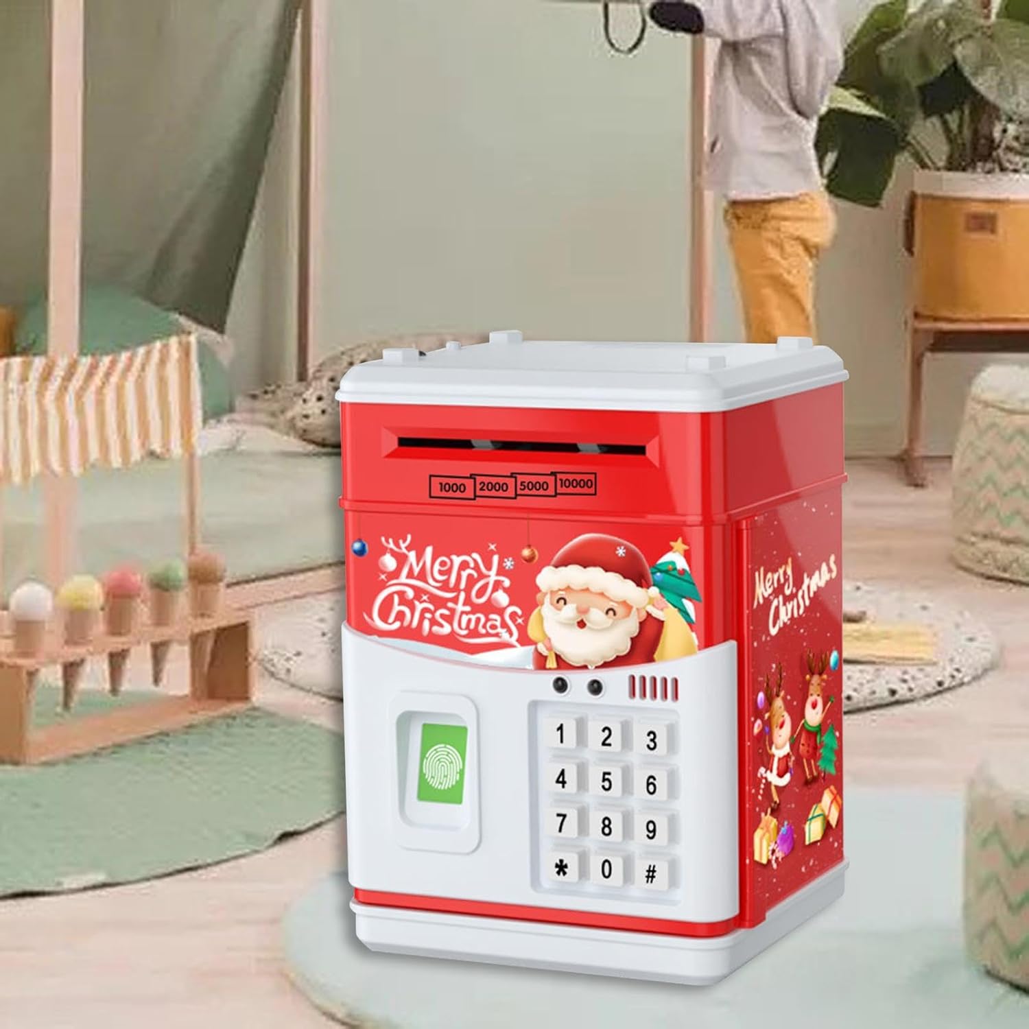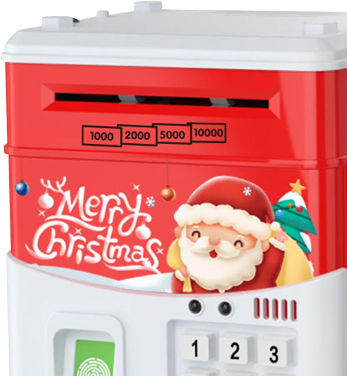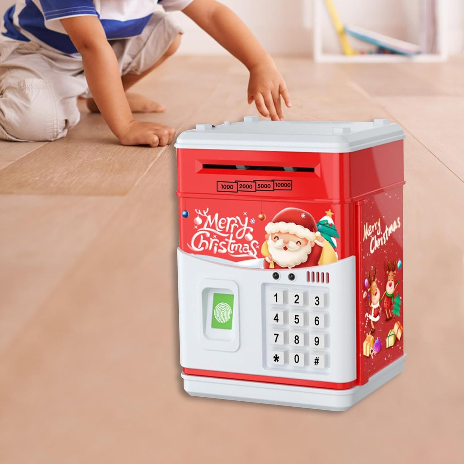 【Scorrimento automatico del denaro e amp; Salvadanaio】: di Natale è progettato con slot per monete e una scatola di risparmio ATM, scorrimento automatico, metti monry nello slot del rotolo, lo farà rotolare automaticamente nella scatola. 【Regalo】La banca di moneta elettronica è un ottimo regalo per bambini, ragazzi e ragazze in occasione di compleanni, Natale, feste. 【con musica e luce】: bancomat con impronte digitali con musica e luci, che sono più interessanti per i bambini. 【Password e password 】 Mini macchina elettronica di risparmio con password e amp; per il giocattolo del bambino dei bambini, portando molto divertimento. 【Giocattolo per lo sviluppo dei bambini】: la banca di risparmio aiuta notevolmente a migliorare la consapevolezza finanziaria dei bambini e consente a tuo figlio di sviluppare la migliore abitudine di risparmiare denaro.