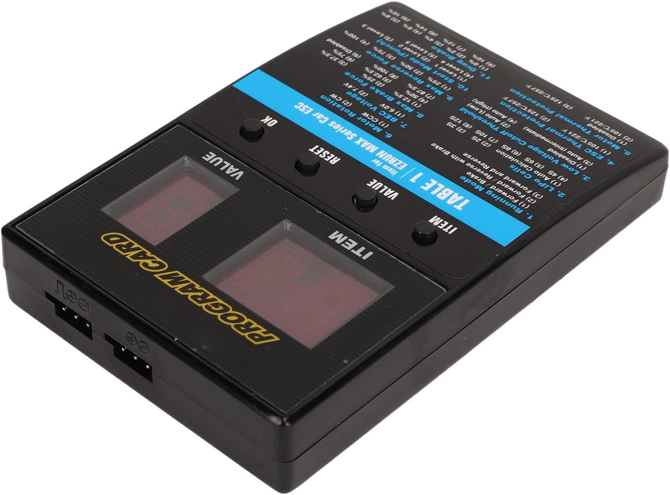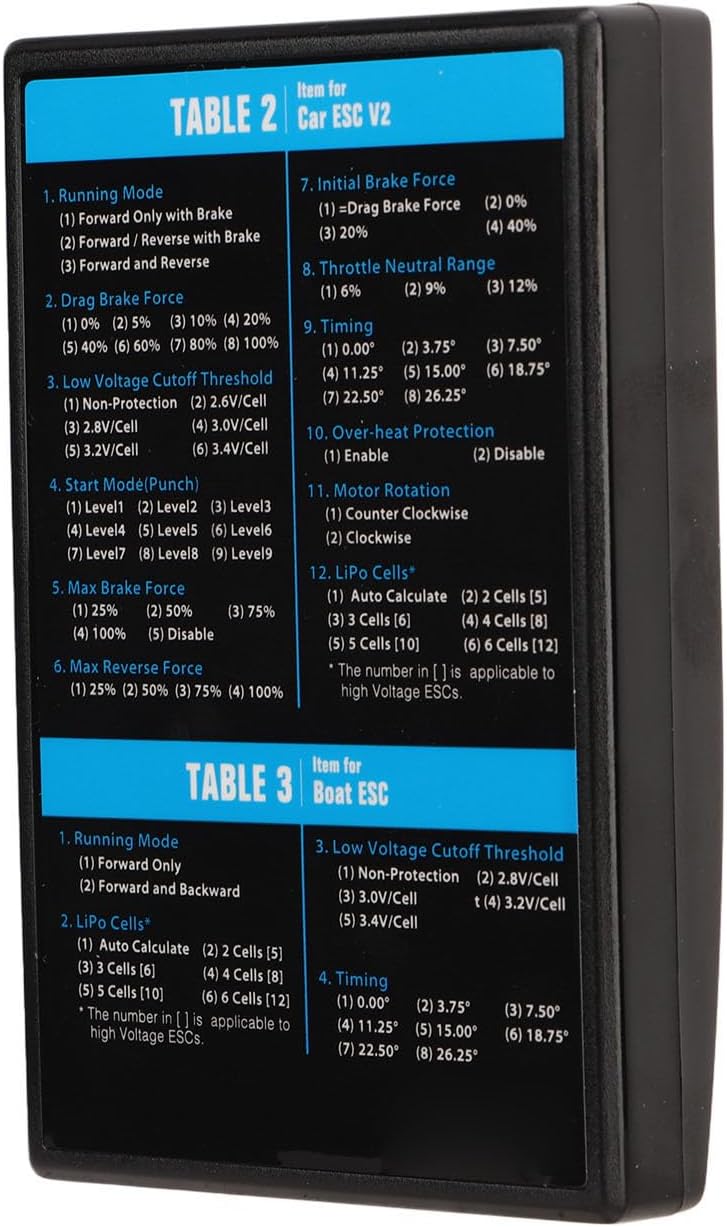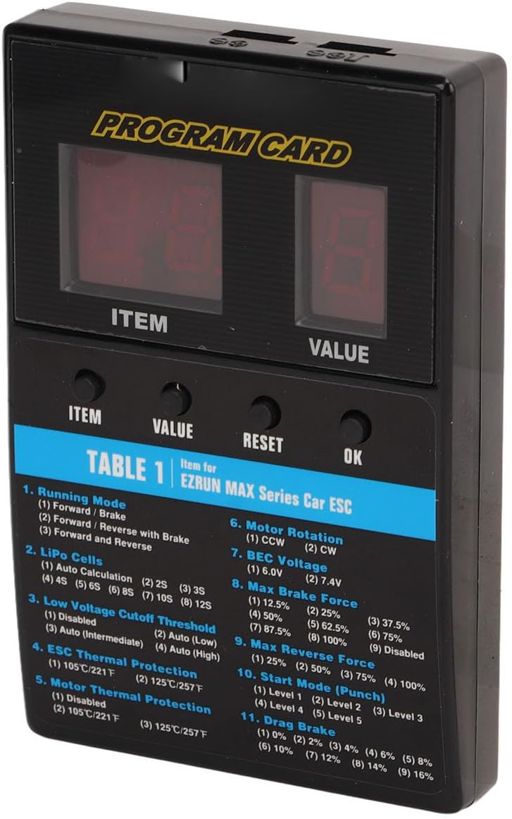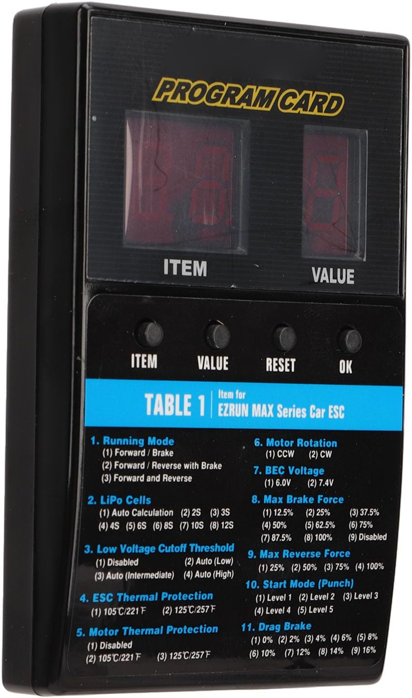 Alimentazione affidabile: l'intervallo di alimentazione in ingresso di questa scheda di programmazione è DC4,8 V-8,4 V, che può fornire un'alimentazione stabile e affidabile per garantire il normale processo di programmazione ed evitare i problemi causati un'alimentazione instabile. Programmazione facile e veloce: la scheda di programmazione ESC senza spazzole ha un'interfaccia intuitiva, che rende la programmazione degli ESC senza spazzole facile e veloce senza complicate fasi operative, risparmiando tempo e fatica. Compatibilità multipla: la scheda di programmazione funziona perfettamente con diverse serie di ESC senza spazzole, tra cui V1 V2, FlyFun V5, XeRun, EzRun, QuicRun e SeaKing, che possono essere ampiamente applicati a diverse marche e modelli di veicoli. Supporto di diverse funzioni: questa scheda di programmazione supporta un'ampia gamma di contenuti funzionali, inclusi TUTTI EZRUN, TUTTI QUICRUN, serie XERUN e serie FlyFun V5, ecc., per soddisfare le esigenze di programmazione per diverse funzioni e ottenere la migliore messa a punto per le prestazioni del tuo veicolo (Tranne V3.1, V3.1 1S, V3.1 Inventory/Share Spec, XR8 Plus, XR10 Justock) (Serie Seaking Tranne PRO 160A) Materiale durevole: la scheda di programmazione è realizzata in plastica e componenti elettronici, che ha un'eccellente durata e può resistere a un uso prolungato senza danni, garantendo lunga affidabilità e durata.