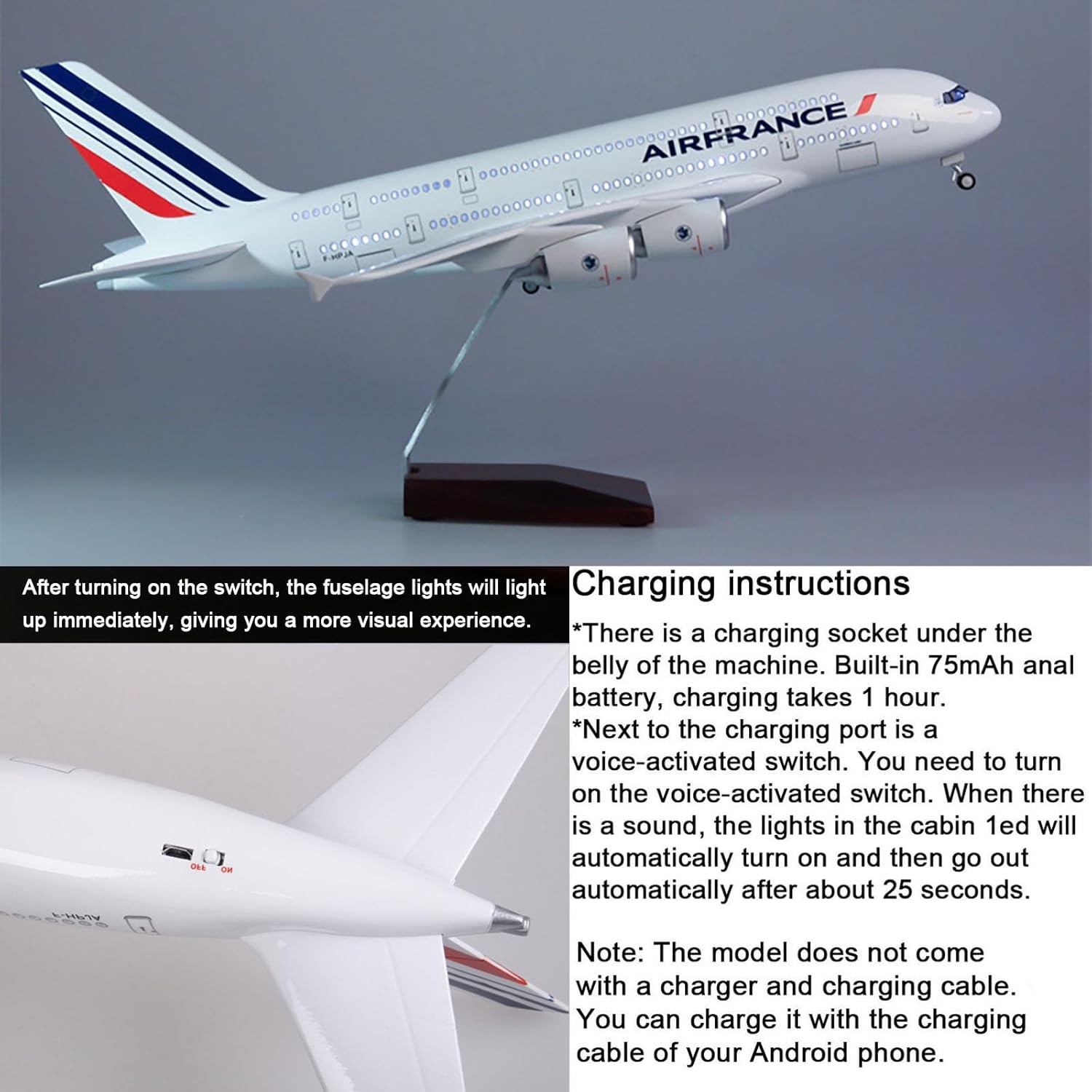 Modellino di aereo in scala realistica: modello di aereo da 17,7 pollici in scala 1: 160, aereo Air France A380 con modellino di aereo a ruote, 17,7 x 19,9 x 7,7 pollici. Design semplice a scatto: il modello Air France Plane A380 può essere facilmente installato in soli tre passaggi. Puoi esporre un modello migliore allo stand. Il modello di visualizzazione statica è completamente ridotto rispetto al modello originale e presenta un elevato grado di simulazione. LED e ruote: tocca o dai voce al modello dell'aereo, l'illuminazione della cabina si accenderà. Dopo 20 secondi, il modello dell'aereo entrerà in modalità di risparmio energetico e spegnerà automaticamente le luci a LED. Materiali dettagliati di alta qualità: l'aereo Air France Plane A380 utilizza fusoliera, base e staffe metalliche di alta qualità. I dettagli dalla scheda motore alla verniciatura sono meticolosi. Il modello generale dell'aereo è molto aerodinamico. I finestrini del modello dell'aereo sono chiaramente visibili. Regalo da collezione: il modello di aeroplano viene fornito con una base pronta for l'esposizione, una bellissima decorazione e un oggetto da collezione for l'ufficio, la casa ed è un regalo perfetto for gli appassionati di aviazione, il personale militare o i collezionisti.