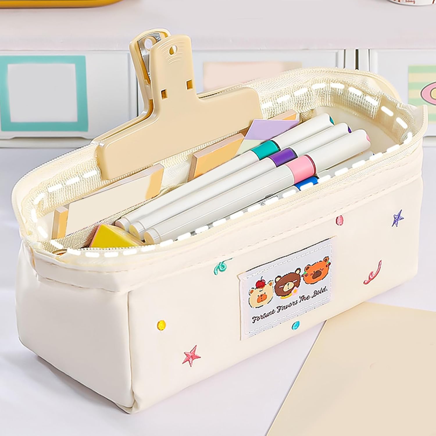 Layout Funzionale: Include tasche divisorie a rete, portapenne elastici e protezioni imbottite per compartimenti organizzati che semplificano la gestione degli oggetti Oggetto Quotidiano Delizioso: Funge da regalo scolastico funzionale, o estetico e perfetta per la scuola. Design affascinante adatto a lei con uso versatile per esigenze organizzative quotidiane e facile trasporto Tonalità Tenui: Combina una tavolozza di colori tenui con un'estetica raffinata. o fotogenico da scrivania realizzato in resistente tela poliestere con cerniera scorrevole affidabile per durabilità quotidiana. Portatile e Pratico: Trasporta comodamente 40 penne e essenziali, ideale come organizer da viaggio per cancelleria o beauty, massimizzando l'utilità con struttura leggera e multifunzionale Ricamo Trendy Orsetto: Progettata come o giocoso ed elegante, questa caratteristica tela canvas incorpora il tenero ricamo di orsetti stellati nella trousse, incarnando il fascino del design stile Harajuku
