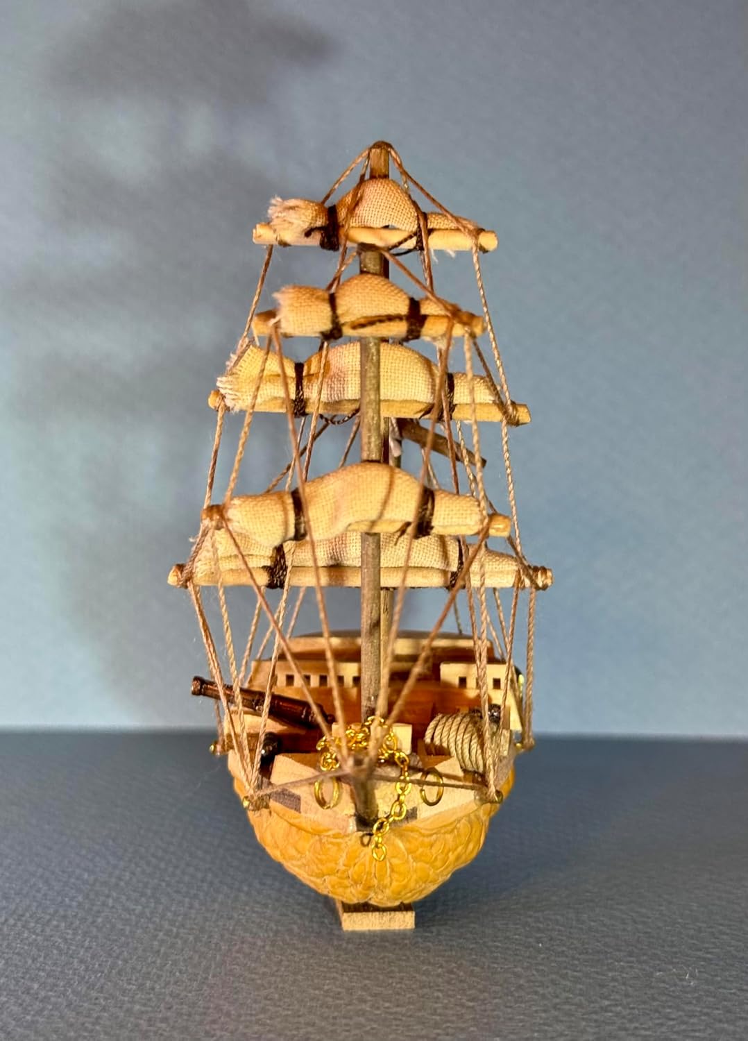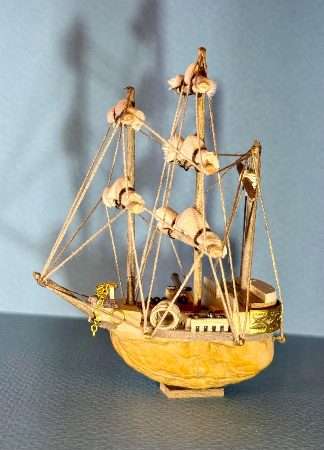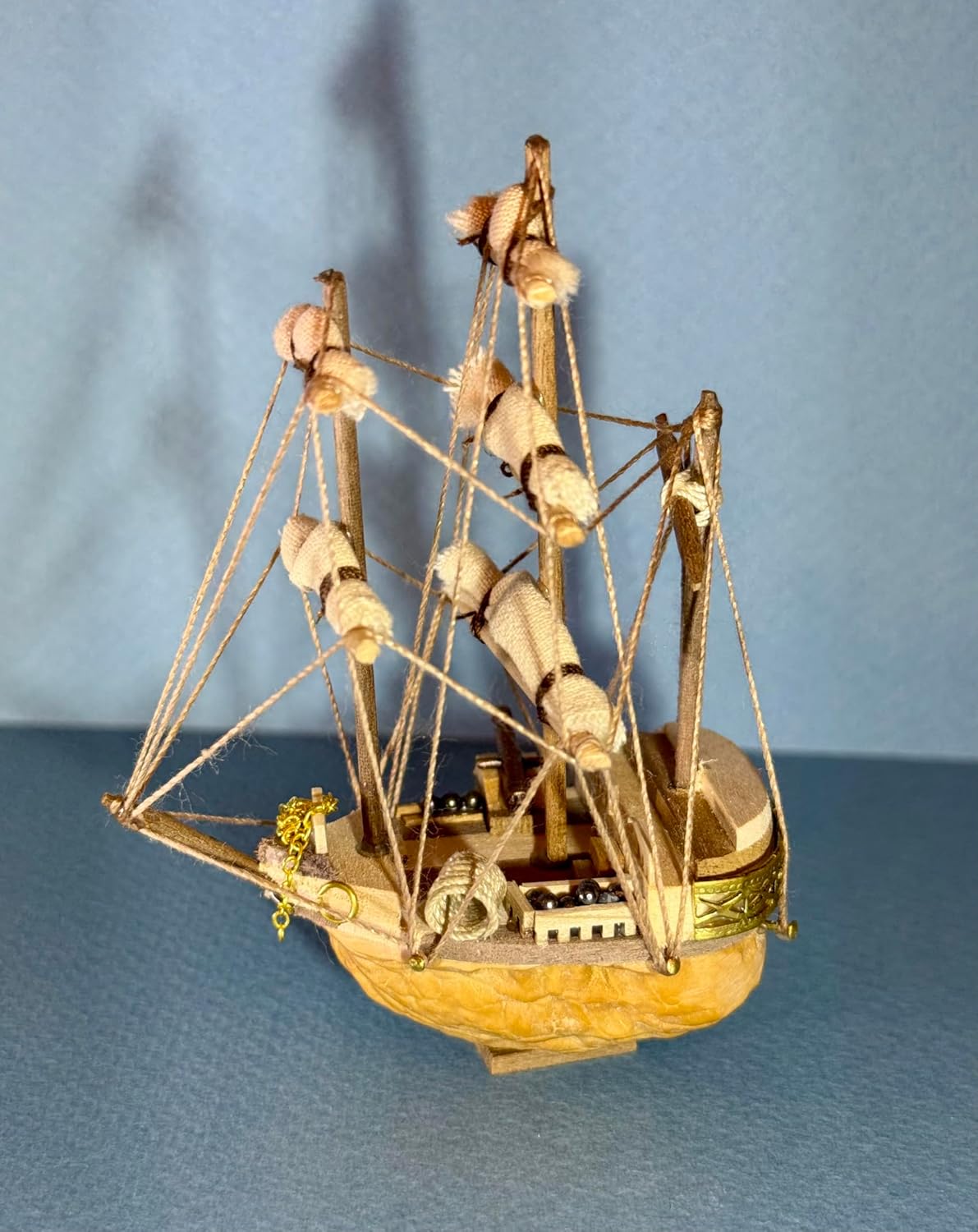 Artigianato Unico: Questa barca in miniatura è un'opera d'arte realizzata interamente a mano da un abile artigiano, rendendola un pezzo unico e prezioso. Materiali Naturali: Costruita all'interno di un guscio di noce, la barca è composta da legno, cotone e ottone, materiali genuini e di alta qualità. Dimensioni Compatte: Con un'altezza di circa 9 cm, una larghezza di 5 cm e una lunghezza di 7 cm, questa barca miniaturizzata è un oggetto decorativo perfetto per qualsiasi spazio. Dettagli Artigianali: Ogni componente, dalle corde alle vele, è stato meticolosamente realizzato a mano, dimostrando l'abilità e la dedizione dell'artigiano. Pezzo da Collezione: Questa barca in miniatura è un'aggiunta preziosa a qualsiasi collezione di oggetti d'artigianato o di modellini navali, celebrando l'arte e la maestria artigianale.