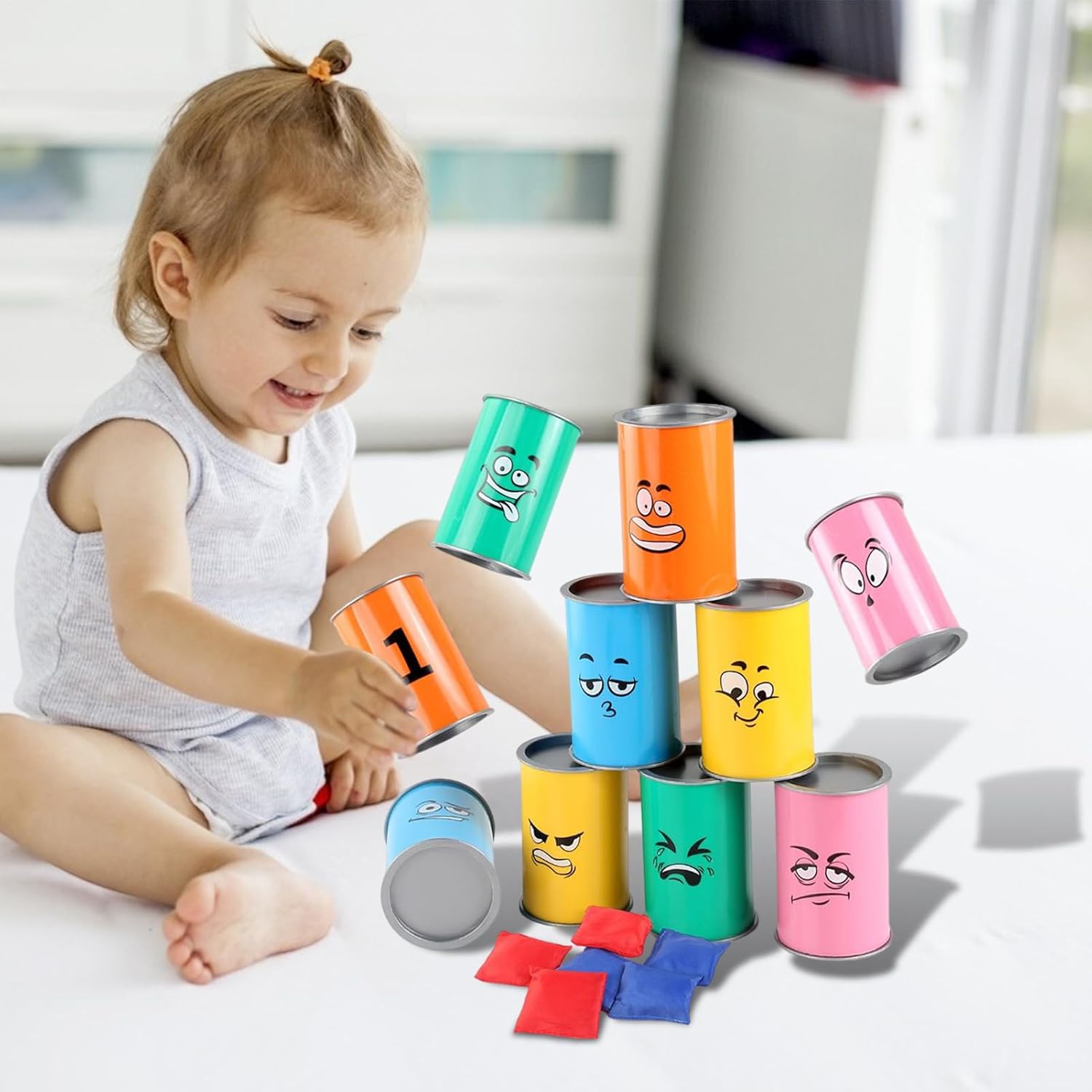 Campeggio e divertimento in famiglia: il gioco di lancio di lattine impilabile è l'ideale per sfide a tappeto in occasione di eventi familiari, feste o avventure in campeggio e promuove esperienze di gioco interattive per tutte le età in qualsiasi ambiente. Utilizzo versatile: gioco di lancio flessibile grazie alla disposizione reversibile con aree numerate da un lato e adorabili facce dei cartoni animati dall'altro per ore di gioco personalizzabili individualmente. Coinvolgente gioco di lancio ambientato in un gioco che promuove lo sviluppo. Ottima scelta regalo: ideale per compleanni, barbecue e incontri sociali. Il gioco della poltrona sacco garantisce divertimento per tutte le età e favorisce l'interazione e momenti indimenticabili ad ogni evento. Eccellente durata: il materiale ABS ad alta resistenza sopporta facilmente lanci e cadute ripetuti e offre un'eccellente durata anche durante i giochi di allenamento di lunga durata